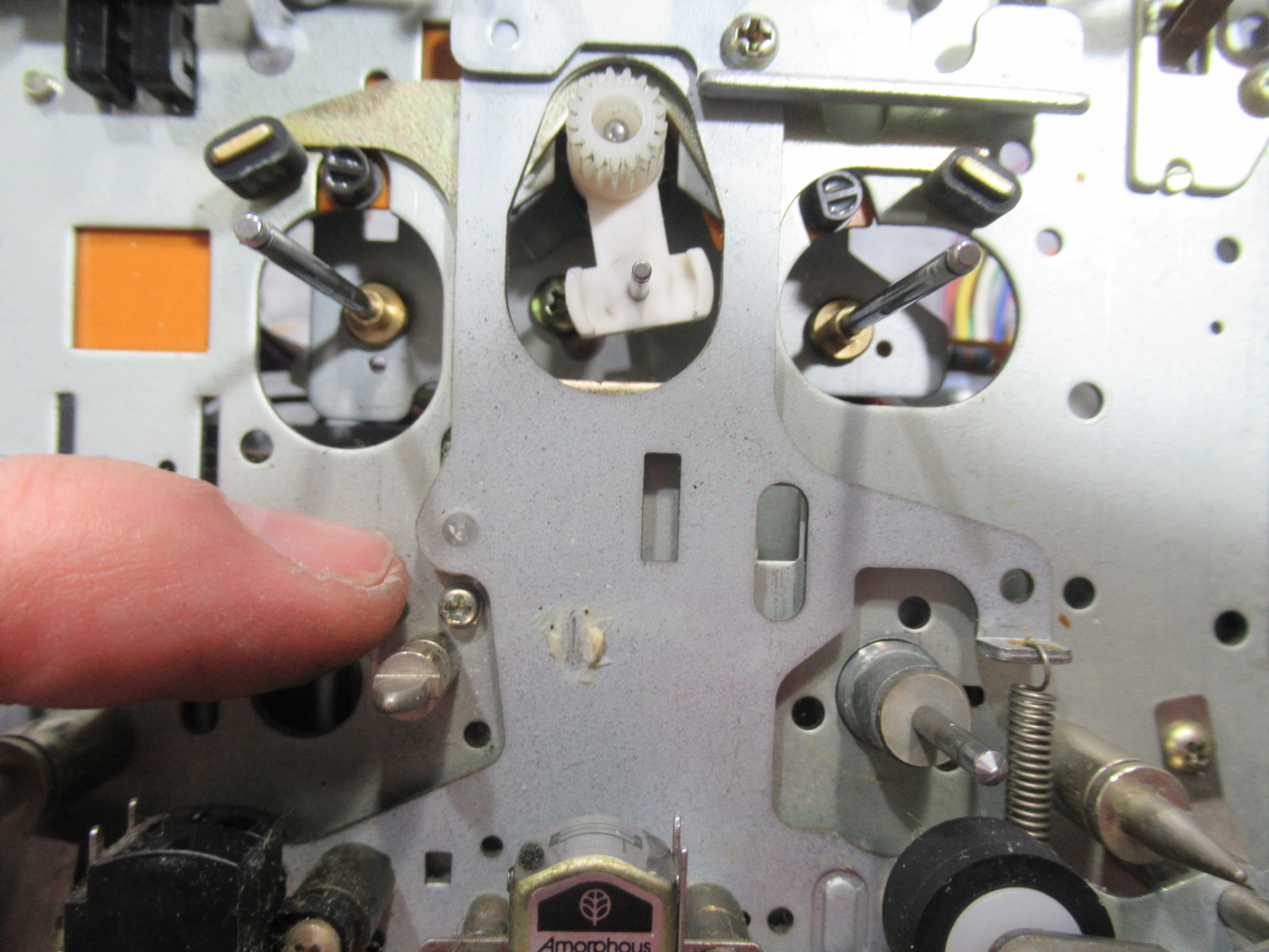 リールとアイドラーを取り外します。支障となるパーツを取り外し、指先のビスを緩めます。
