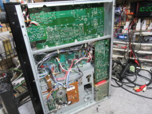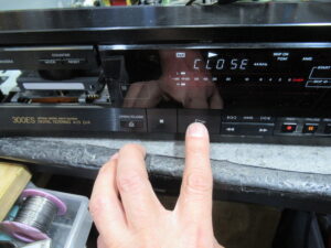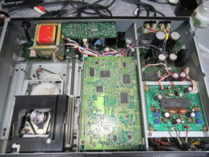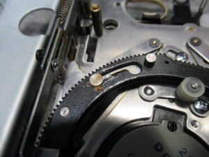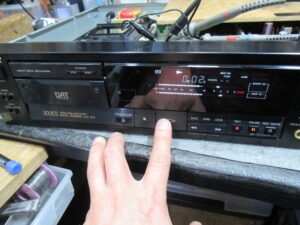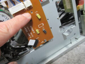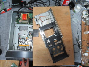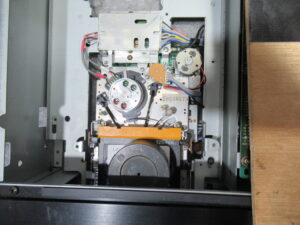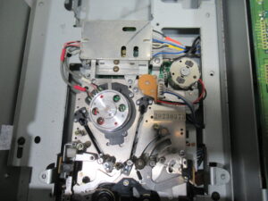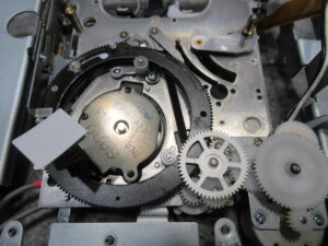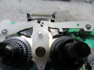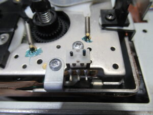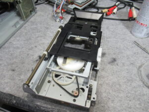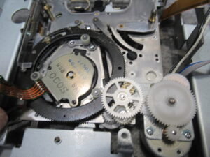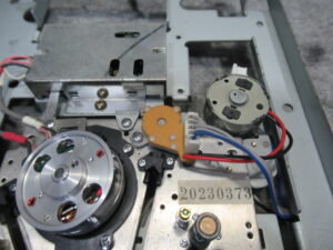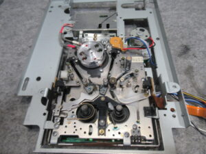 ここで問題が発生しました。最初は気になりませんでしたが、ローディングの途中で一瞬電源が落ちて(厳密には電圧低下によるブラックアウトのようです)停止してしまいます。すぐに元に戻りますので再度操作ボタンを押すことによって動き出しますが、何度やってもテープガイドが少し上がり始めたところで不具合が発生します。また、イジェクト時も、動き出したテープガイドが同じ場所に移動した際に不具合が発生します。