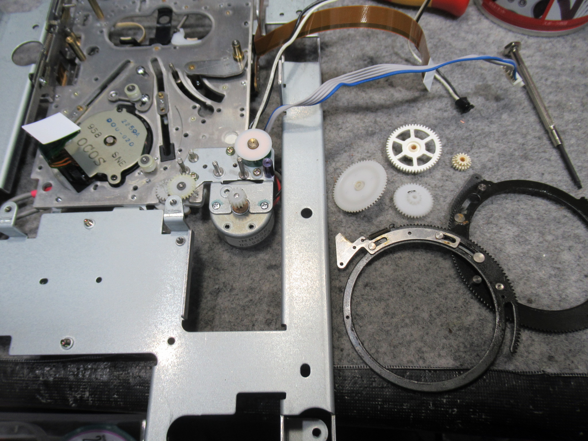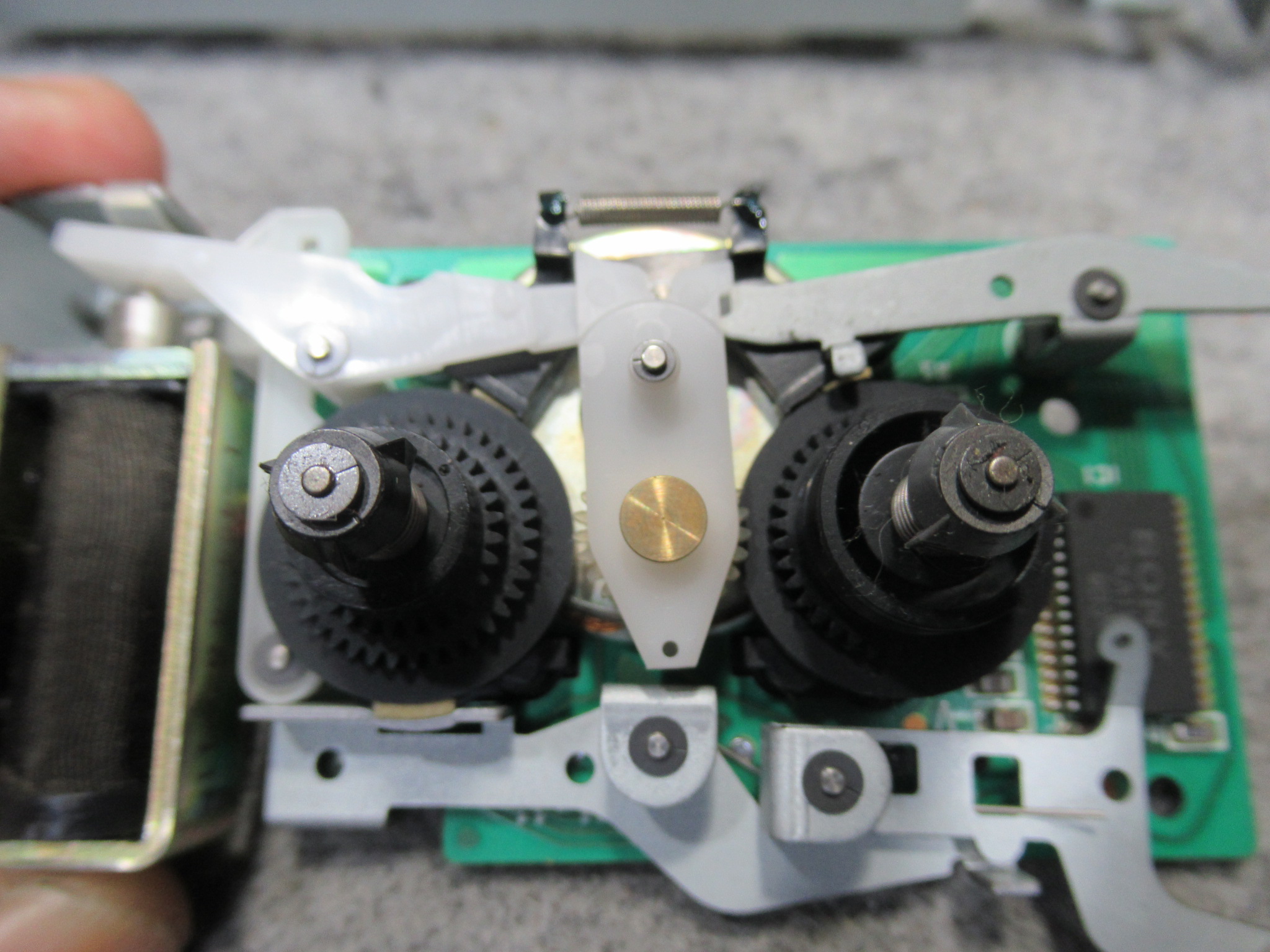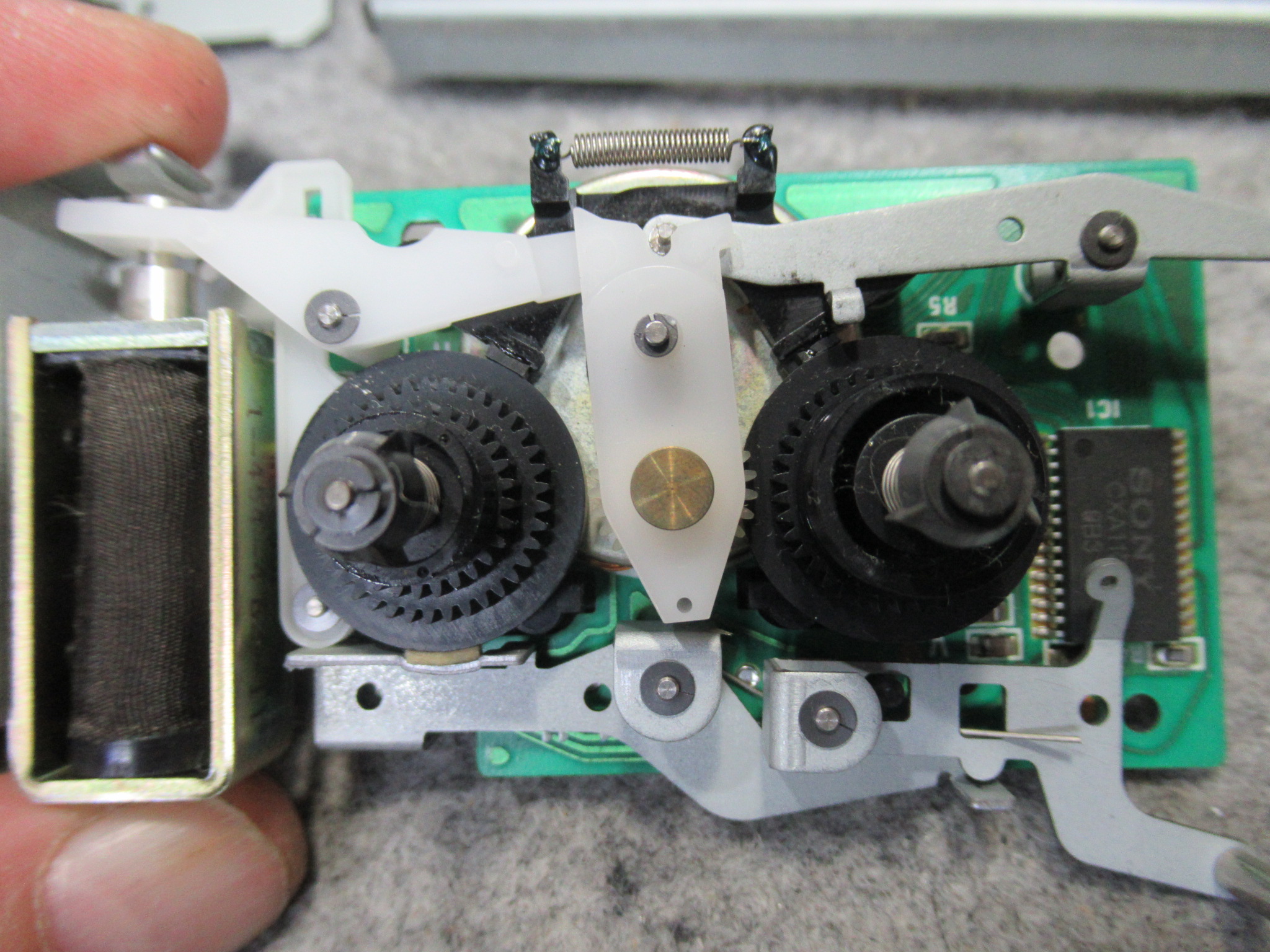 ここで問題が発生しました。最初は気になりませんでしたが、ローディングの途中で一瞬電源が落ちて(厳密には電圧低下によるブラックアウトのようです)停止してしまいます。すぐに元に戻りますので再度操作ボタンを押すことによって動き出しますが、何度やってもテープガイドが少し上がり始めたところで不具合が発生します。また、イジェクト時も、動き出したテープガイドが同じ場所に移動した際に不具合が発生します。