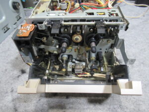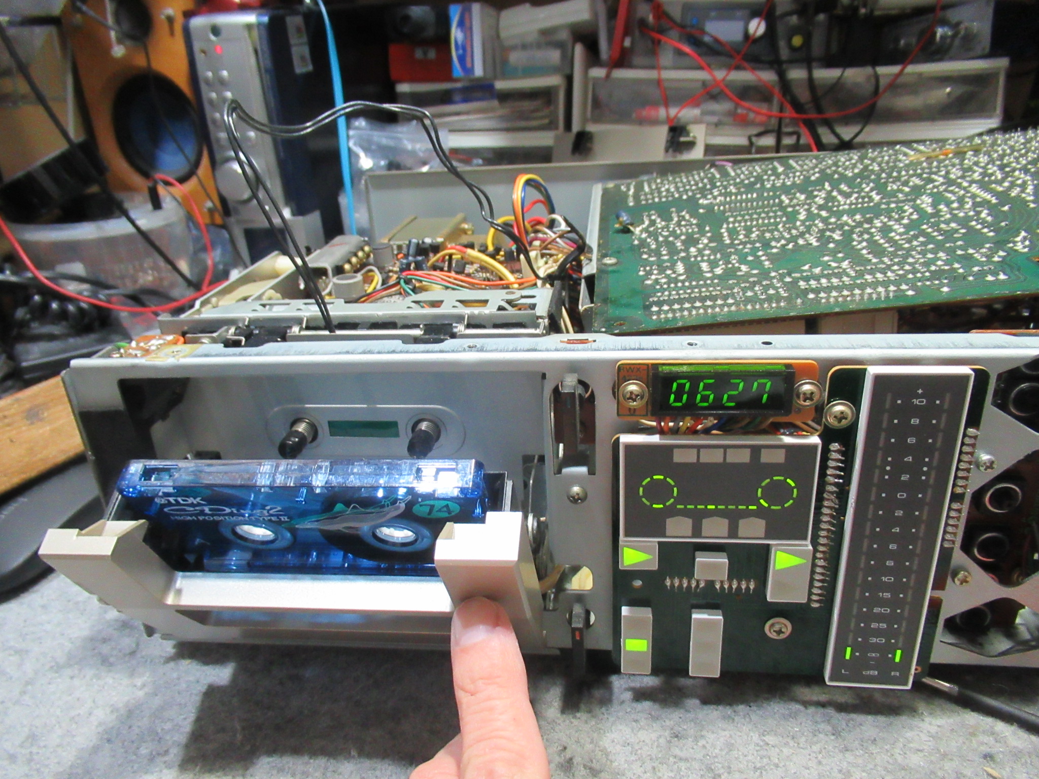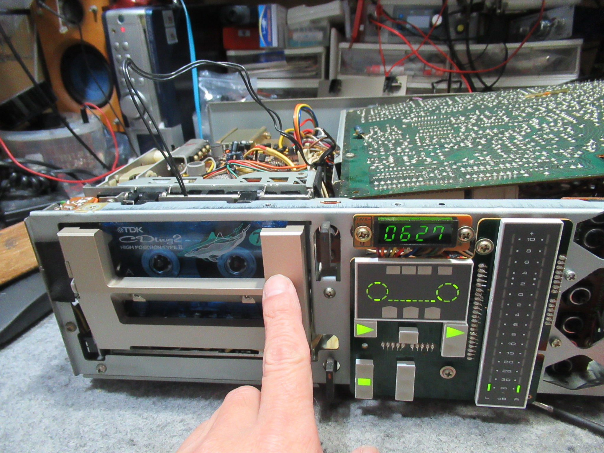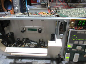 久しぶりにこの機種を扱うため、大事なことを忘れていました。トレイが閉まった後、テープのたるみを取るため、リールにブレーキが掛かった状態で左側のリールが回転します。そのときに「キー」という嫌な音が鳴ります。