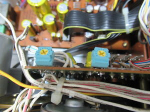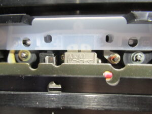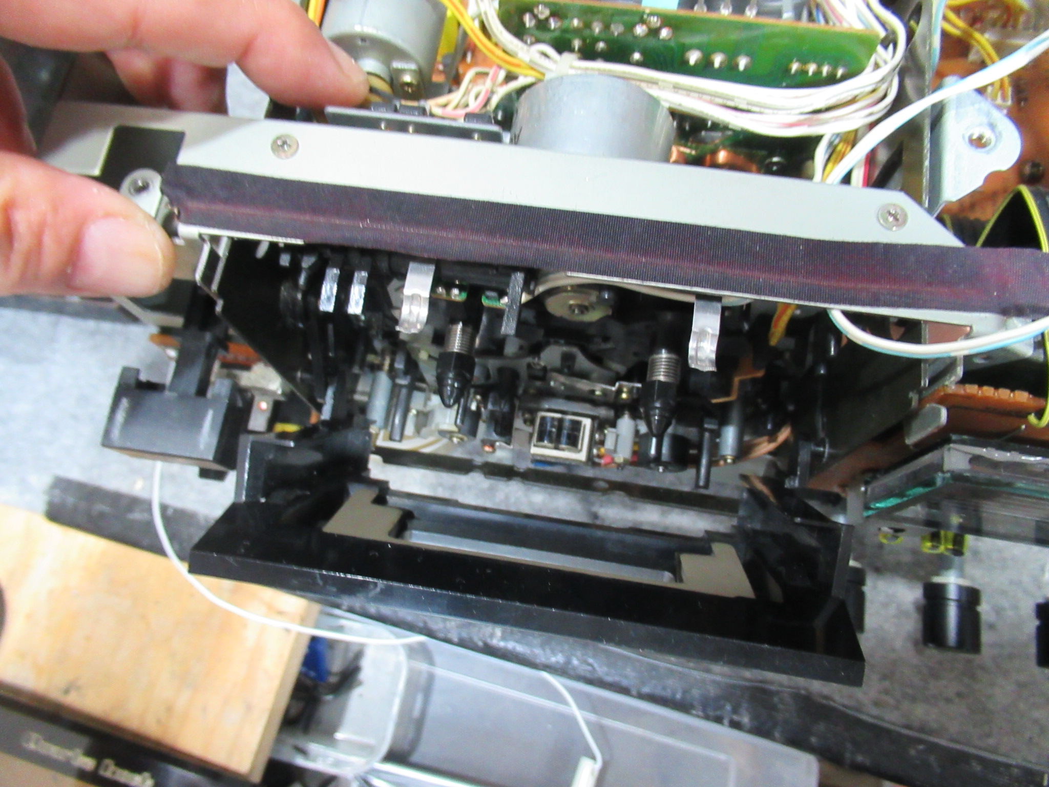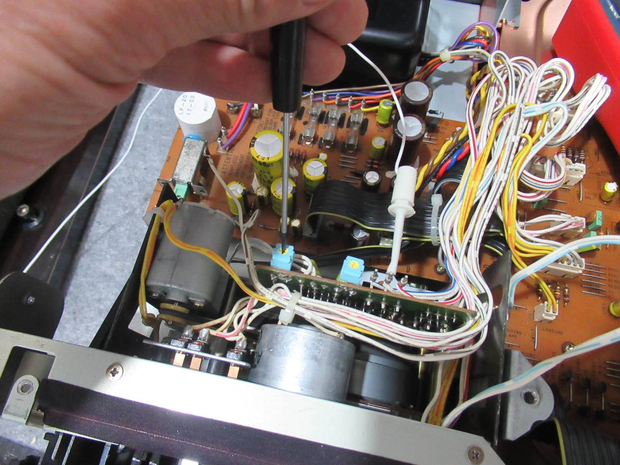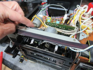 カバーを開けました。メカの背面のモーター基板には、カムモーターの動作を調整する半固定抵抗が取り付けられていますので、少し回してみると、正常な状態に戻りました。どうやら半固定抵抗に接触不良が起きて、ブレーキが掛かったままだったようです。