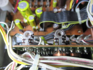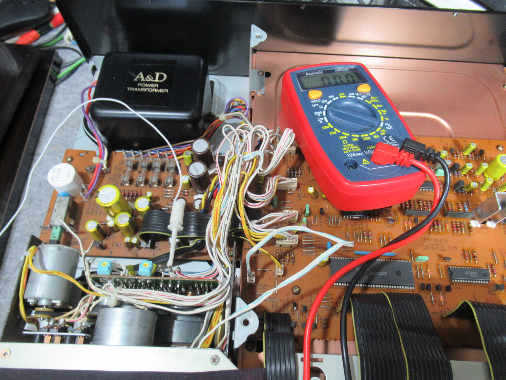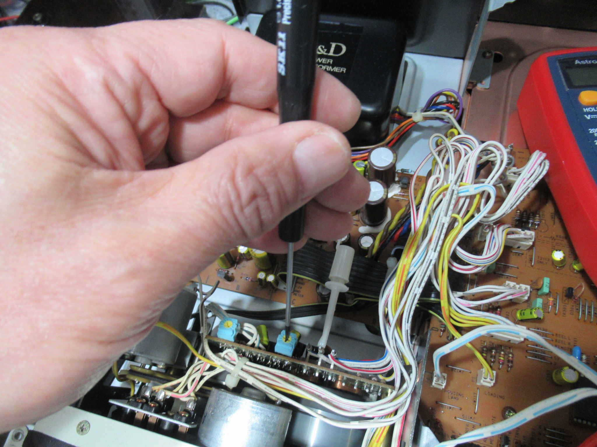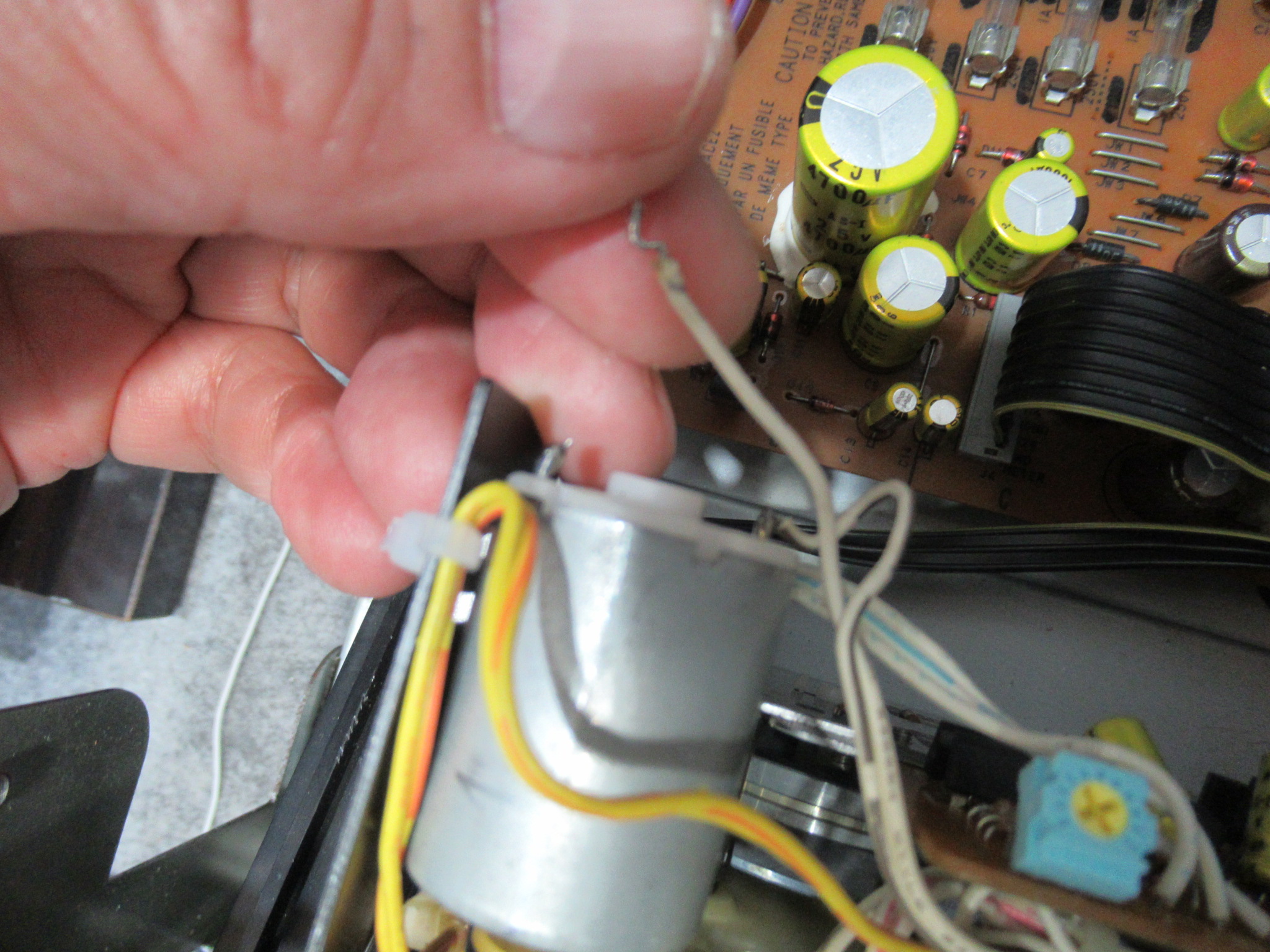 カバーを開けました。メカの背面のモーター基板には、カムモーターの動作を調整する半固定抵抗が取り付けられていますので、少し回してみると、正常な状態に戻りました。どうやら半固定抵抗に接触不良が起きて、ブレーキが掛かったままだったようです。