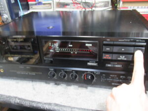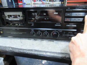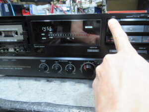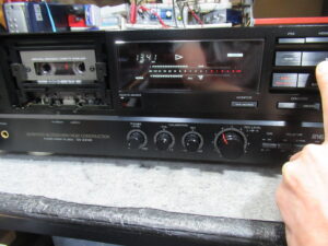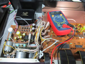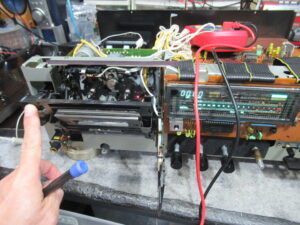 ひととおり点検を終え、修理完了です。・・・と思ったら、再生が勝手に停止したり、再生を始めてもリールが回転しないことがあります。初めは、テープがヘッドに貼り付いたのかと思っていましたが、テープを替えても同じです。モーターに印加されている電圧も正常(再生時3V、早送り巻き戻し時10V)です。