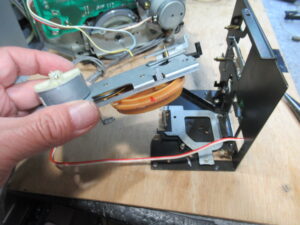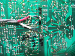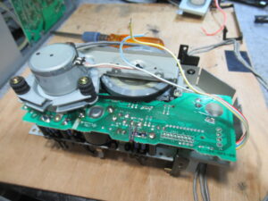まずは、底板を取り外して、基板に直付けのヘッドのケーブルを切り離します。過去に修理された方がマーキングされています。今はデジカメで撮影するだけですので、良い時代になりました。
