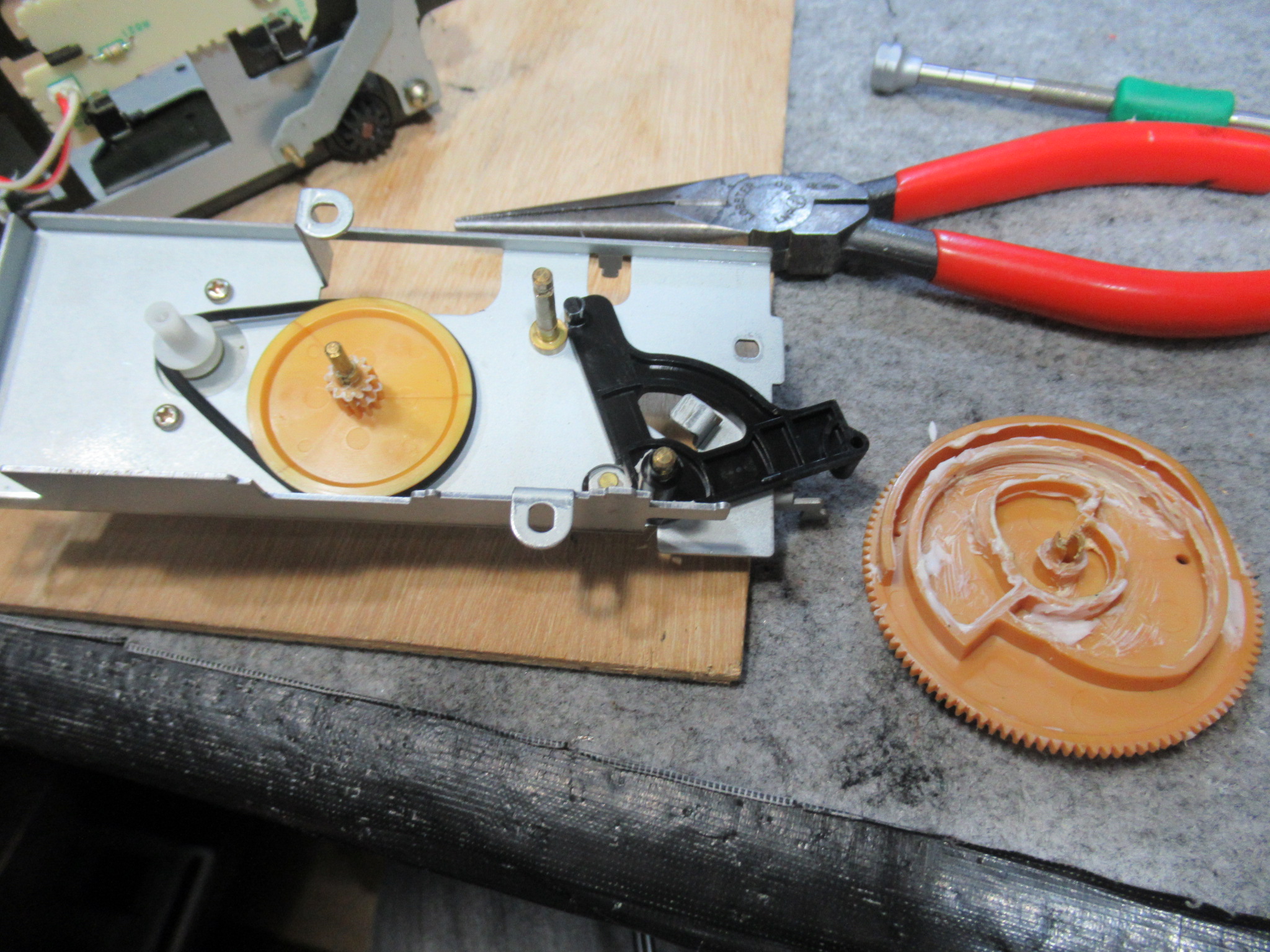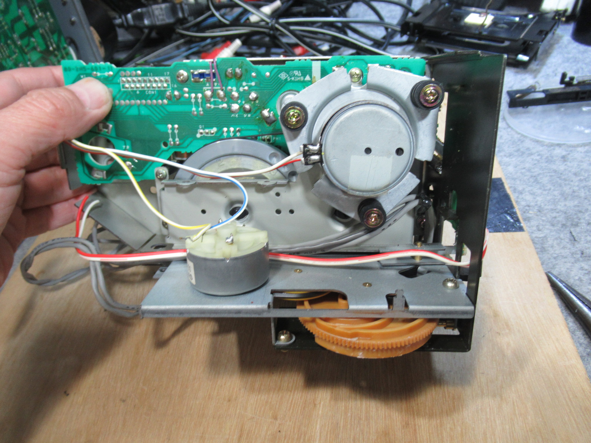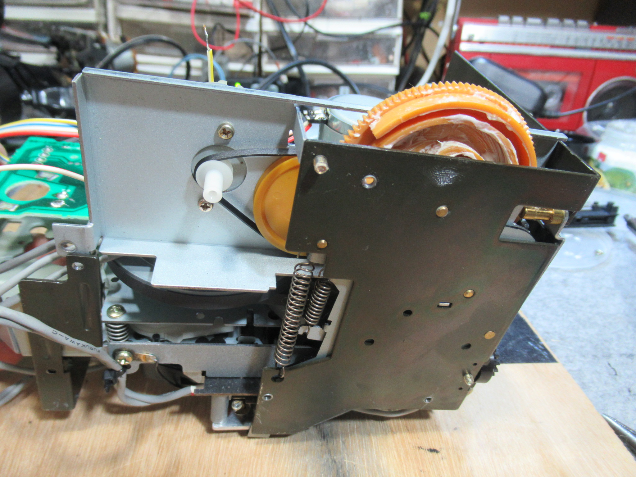 かなり久しぶりのXK-S7000です。 6年前に故障したものの、依頼した電器店に「修理できない」と断られ、現在に至るということです。 電動トレイが開きません。モーター音は聞こえます。 カバーを開けまし …