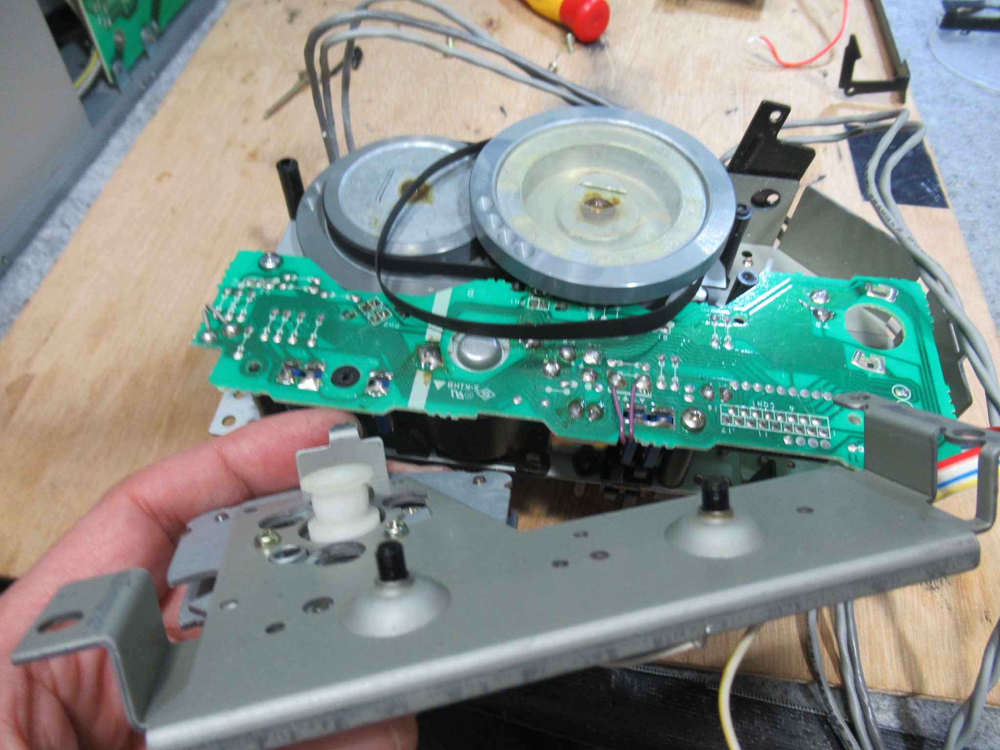 まずは、底板を取り外して、基板に直付けのヘッドのケーブルを切り離します。過去に修理された方がマーキングされています。今はデジカメで撮影するだけですので、良い時代になりました。