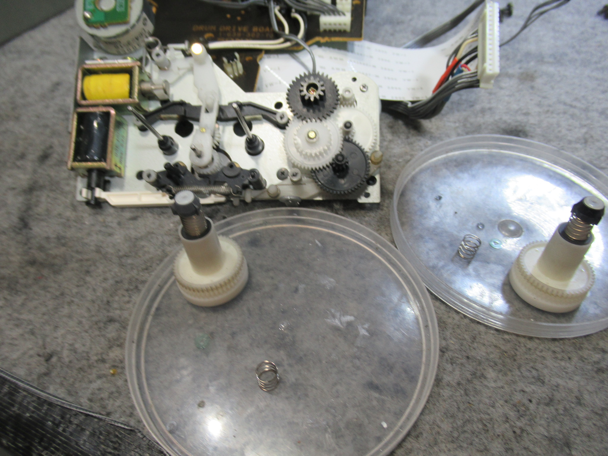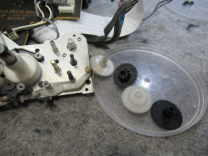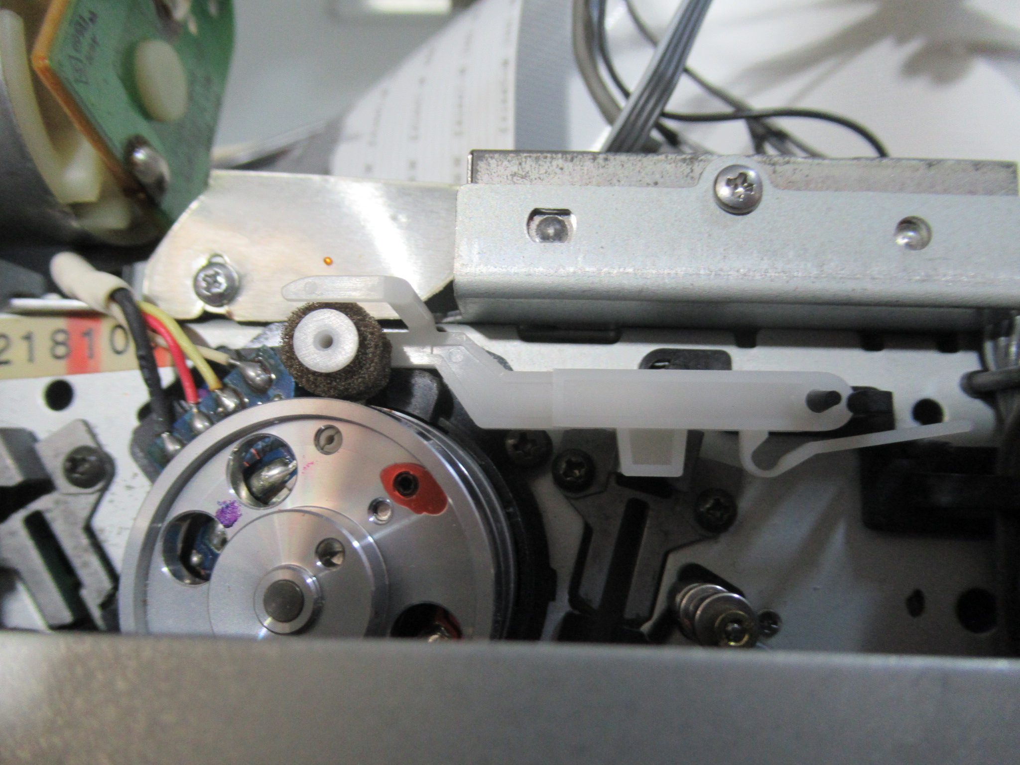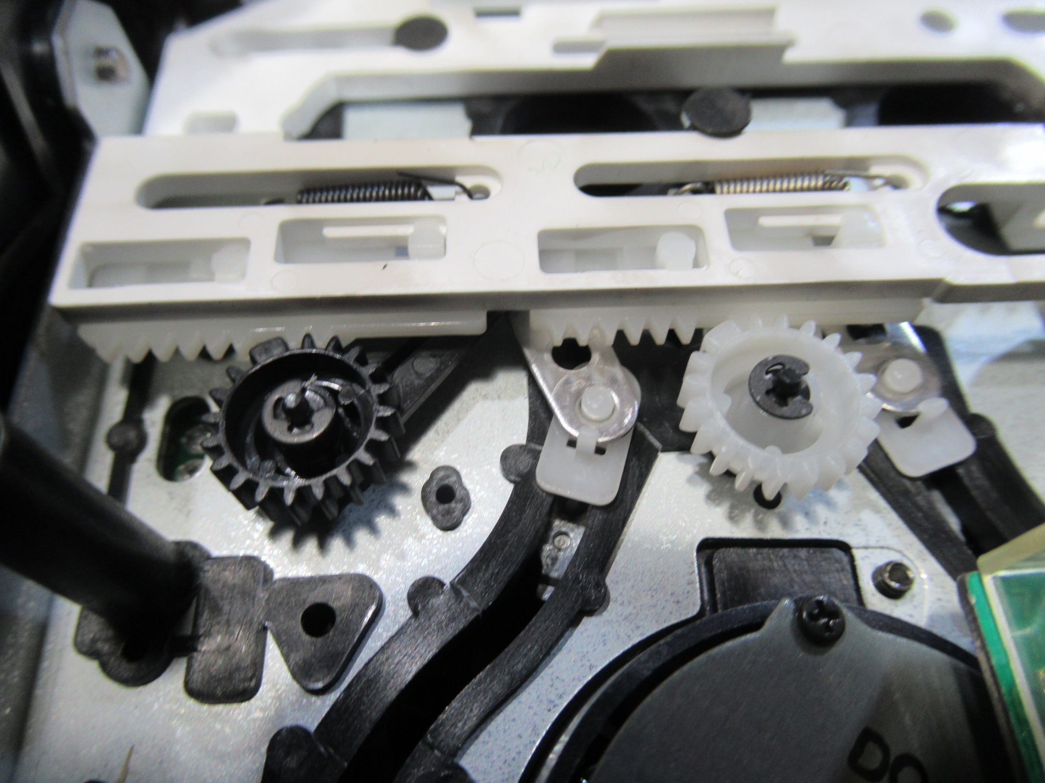 このメカの最大のウィークポイントは、白黒ギヤを固定している留め具です。この機体ではまだ健常でしたが、割れて脱落し動作不可となります。
