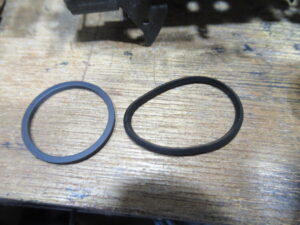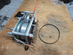 左側の新しいベルトを仮掛けし、組み付け時にモータープーリーに掛け直します。