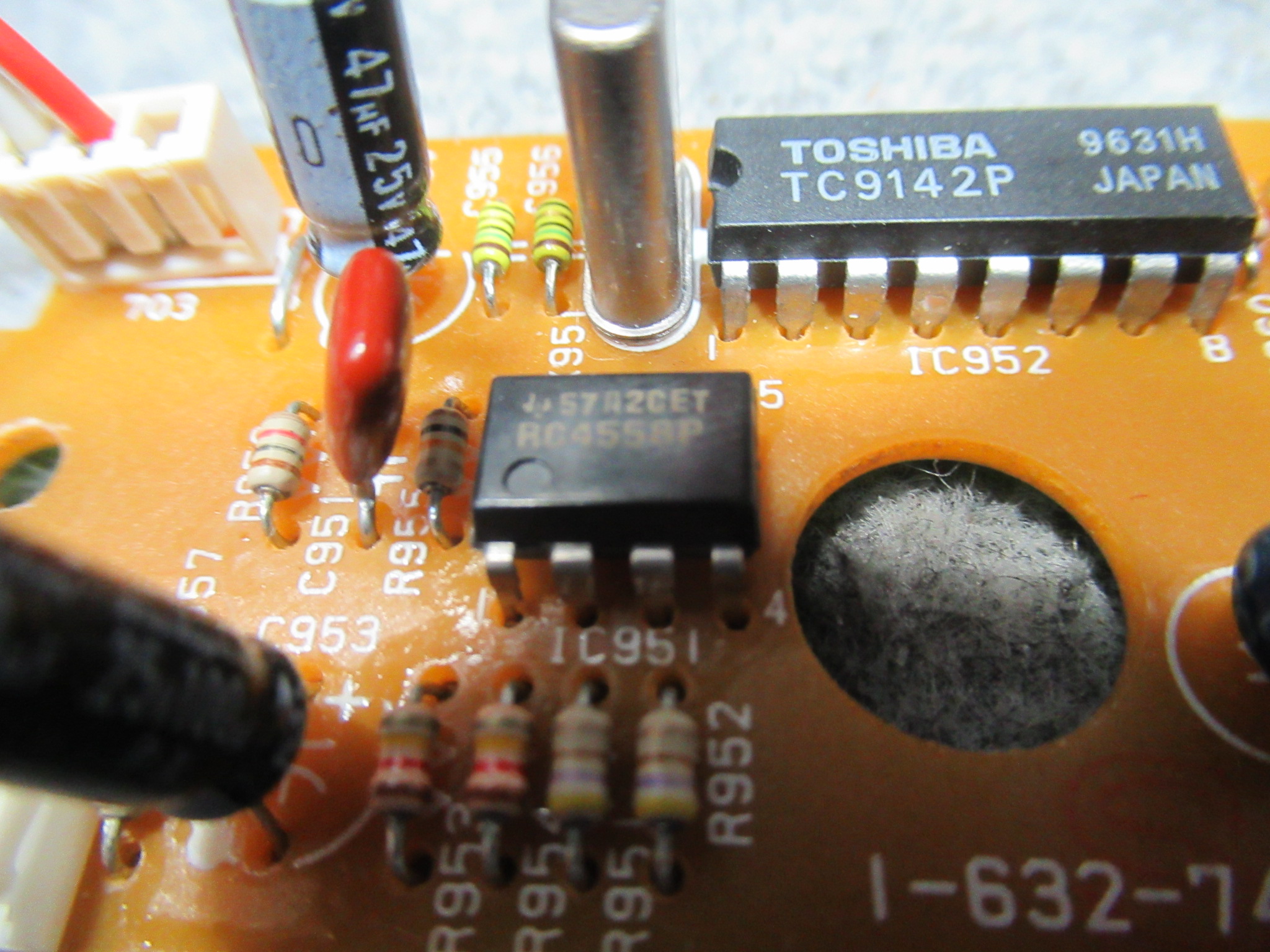 構成はシンプルです。最初に電解コンデンサーを交換しましたが、そうではありませんでしたので、次にIC(RC4558P)を交換しました。