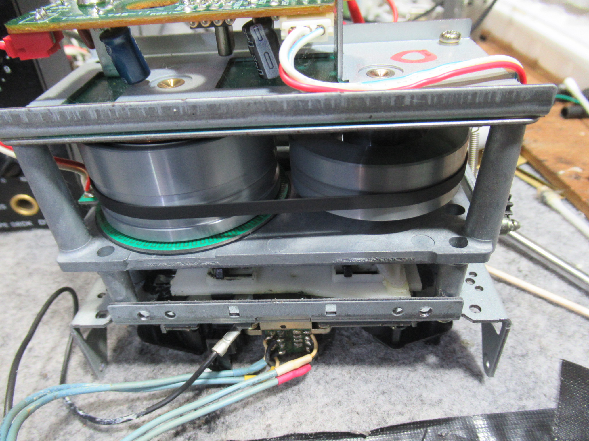 キャプスタンモーターは、クォーツロックのDD仕様となっていますが、フライホイール側にモーター基板、その裏側にもクォーツロックのための発振器が取り付けられた基板があります。