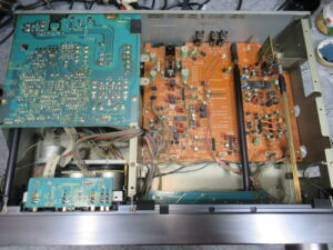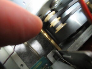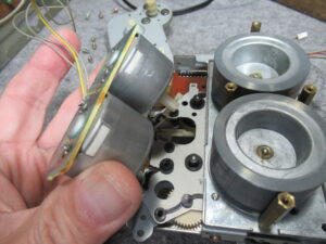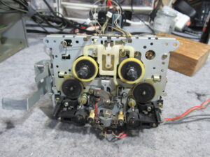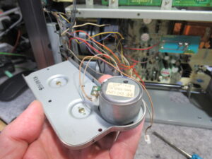 早速カバーを開けて点検を行います。この機種は、テープをセットするとキャプスタンモーターが回転し始める仕様ですが、停止したままです。そこで、指でモータープーリーを回してやると、回転し始めました。しかし、一旦停止するとまた同じ状況に戻ってしまいます。モーターに触れるとかなりの発熱でしたので、内部接点にトラブルが起きたようです。