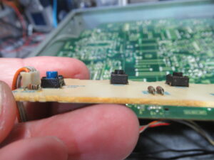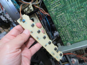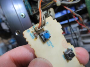 機器の内部から操作スイッチ基板を撮影したところです。テスターで点検した結果、切り替えスイッチの接触不良が起きていることがわかりました。そのため、マイコンが他のボタンを押したと誤認してしまうようです。