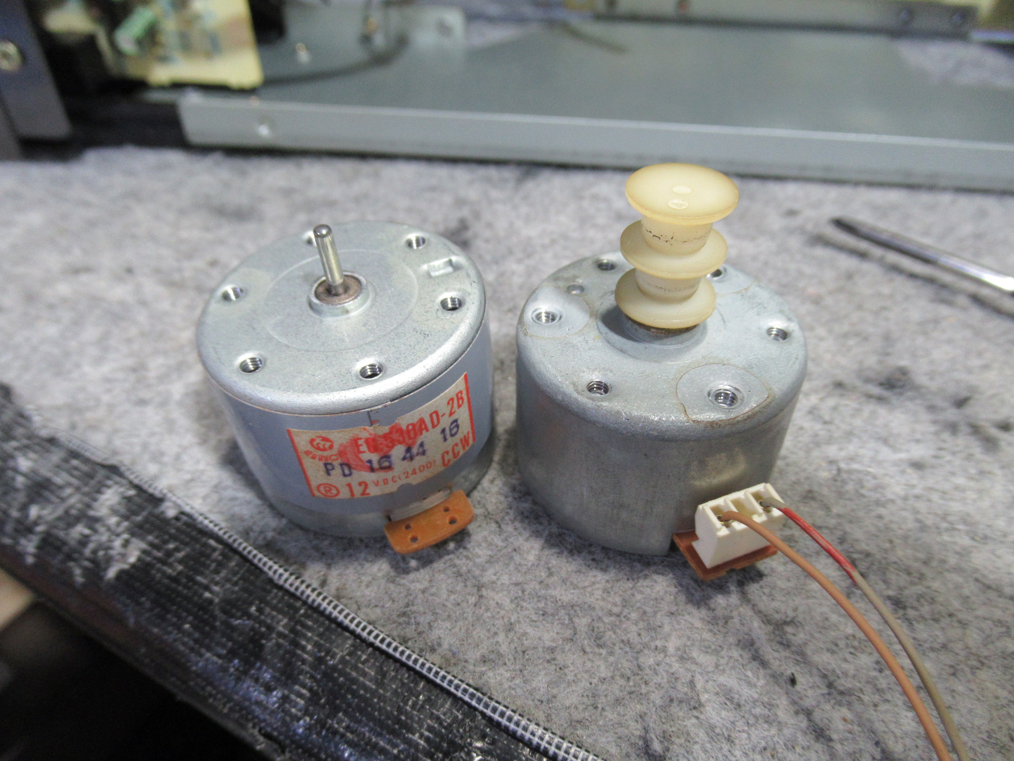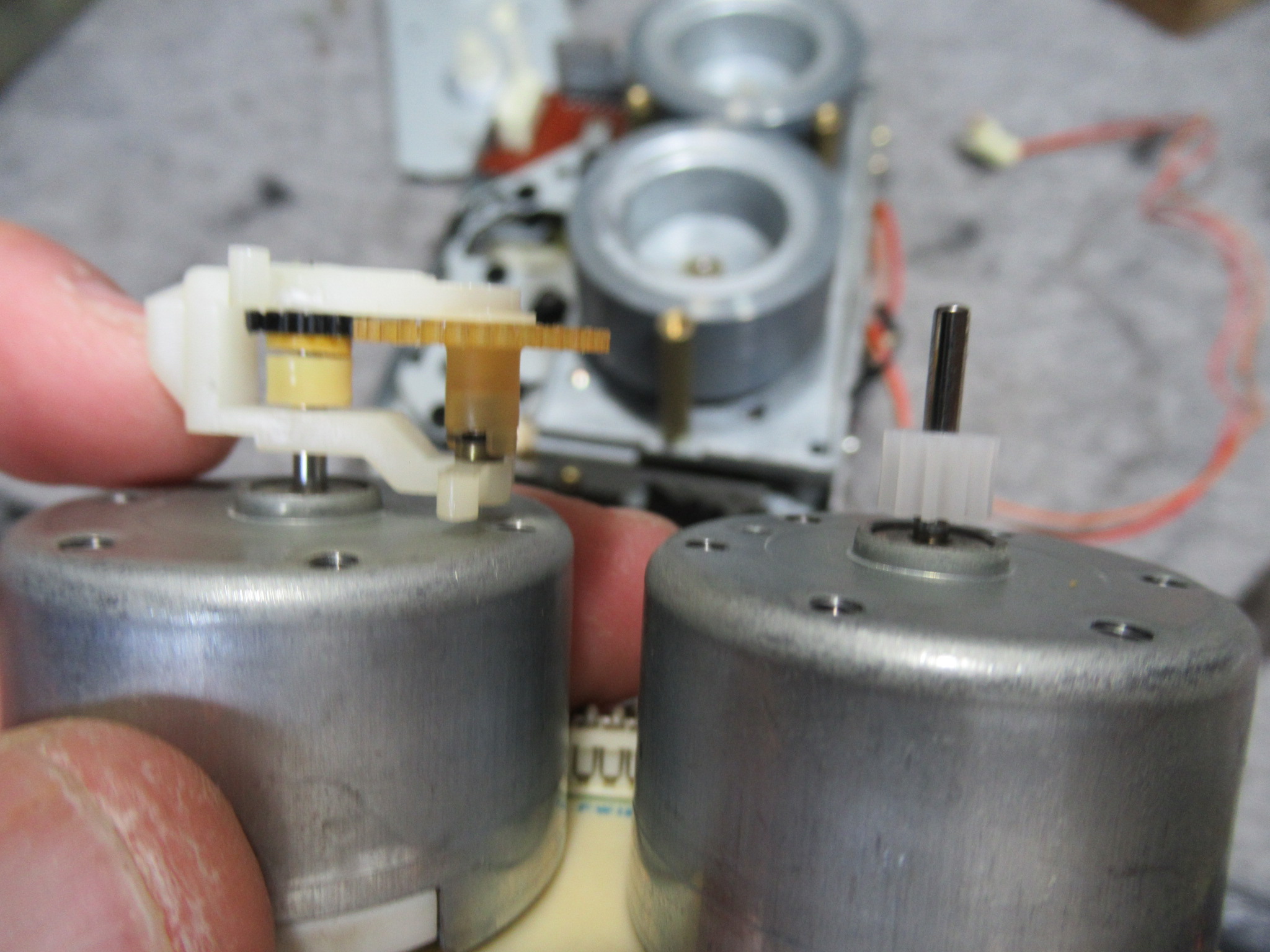 早速カバーを開けて点検を行います。この機種は、テープをセットするとキャプスタンモーターが回転し始める仕様ですが、停止したままです。そこで、指でモータープーリーを回してやると、回転し始めました。しかし、一旦停止するとまた同じ状況に戻ってしまいます。モーターに触れるとかなりの発熱でしたので、内部接点にトラブルが起きたようです。