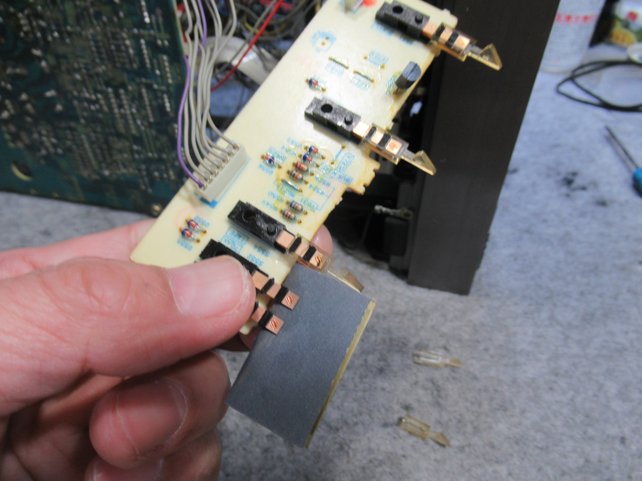 形状が他のものと異なります。フロントパネルと干渉するために首の長いものを使用していると思われますが、同じものは入手できませんので、交換は諦めて接点復活剤を処置します。