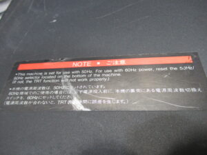 ACモーターが使用されていた時代は、このように東日本と西日本で何らかの処置が必要なことがありましたが、この機種のモーター自体はDCモーターですので、切り替えても動作には影響はありません。ただし、天板に写真のような注意書きがあり、その地域に合った周波数にセットしないと、カウンター表示に狂いが出るようです。