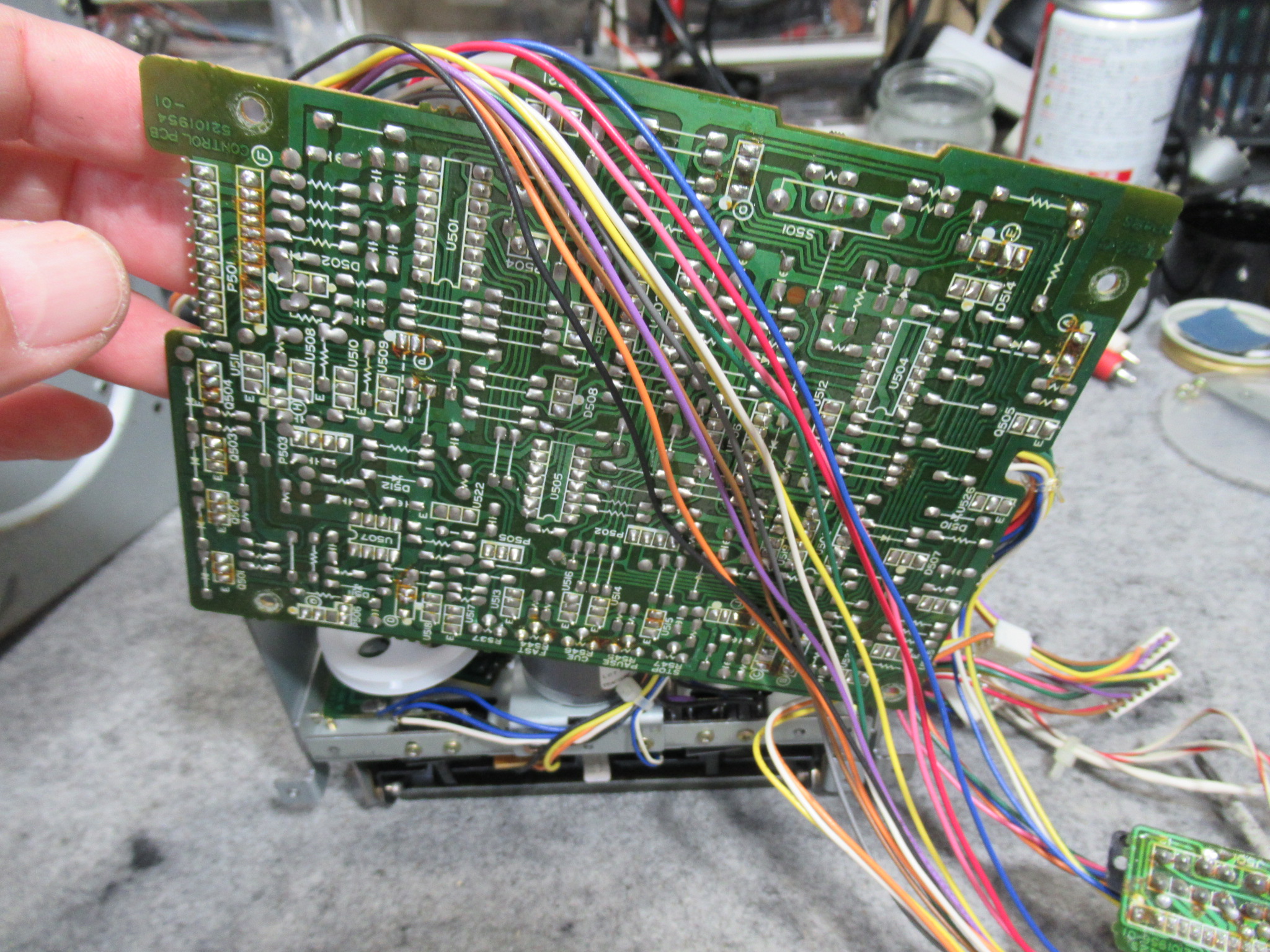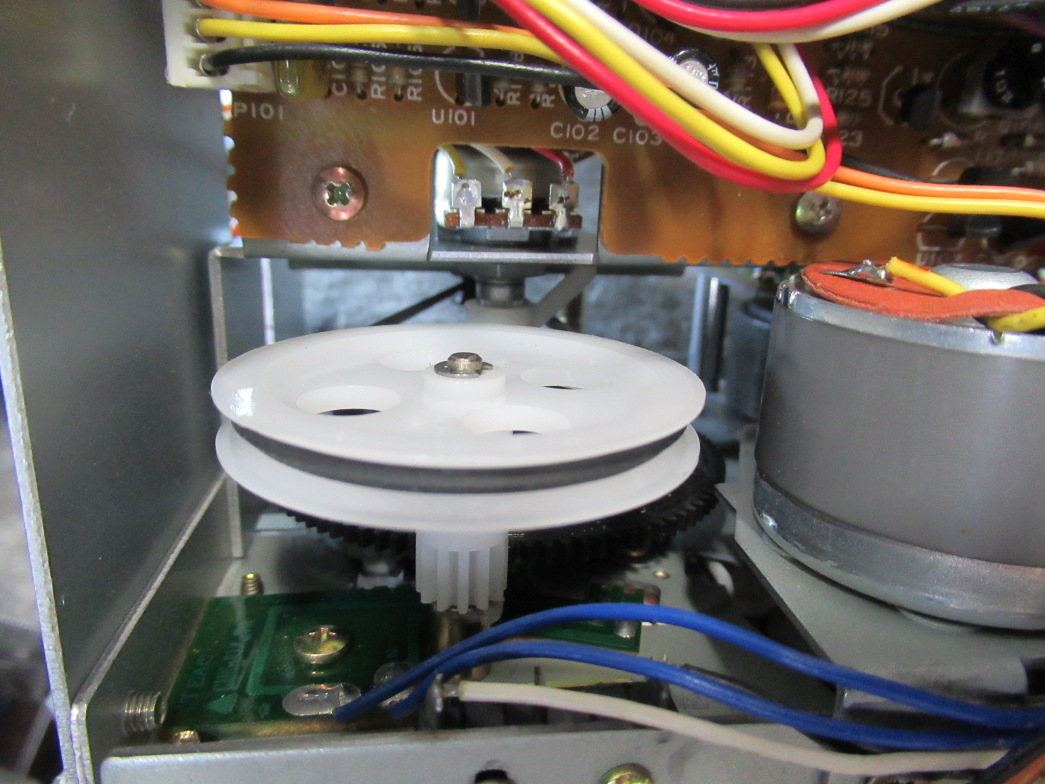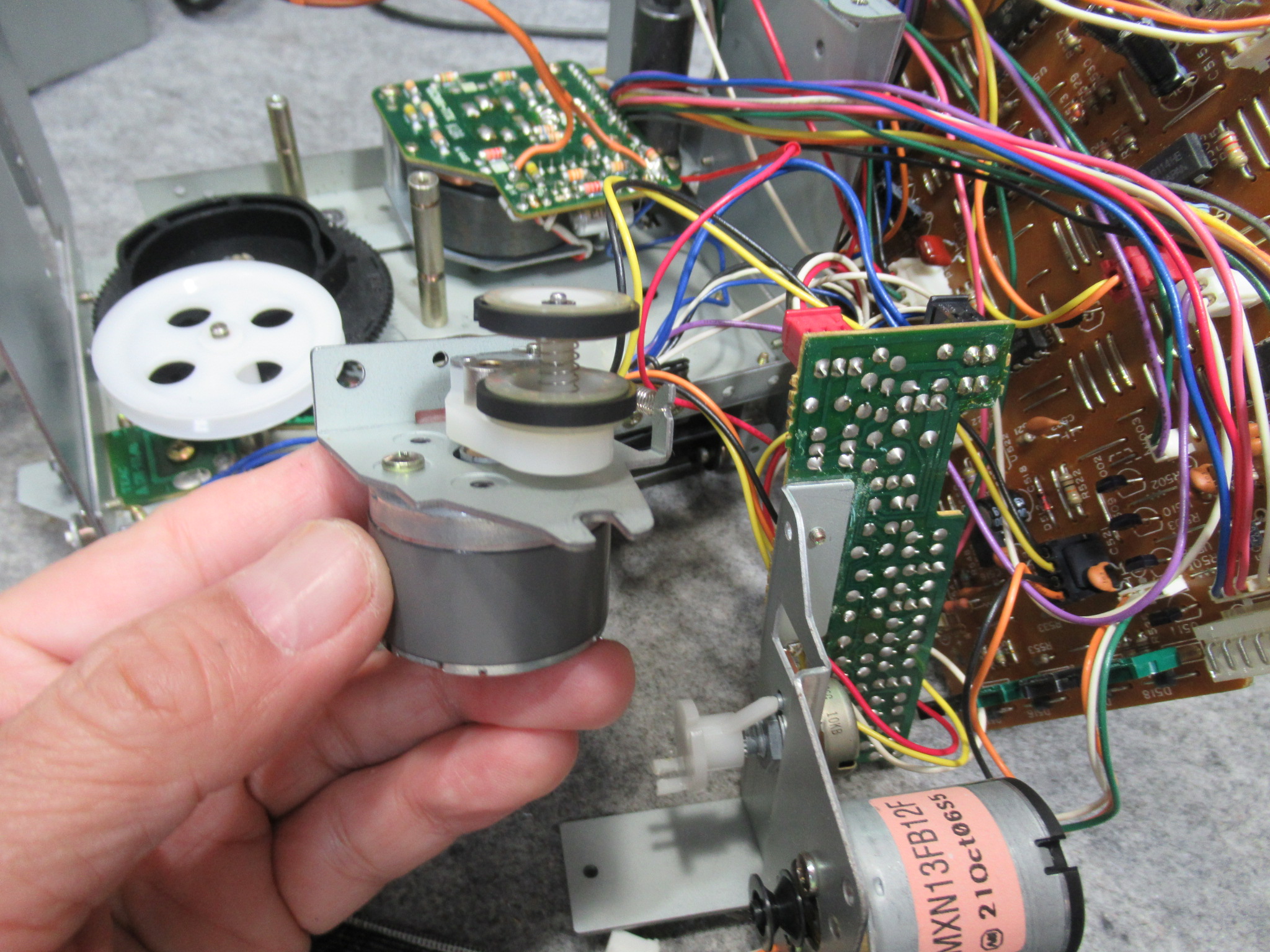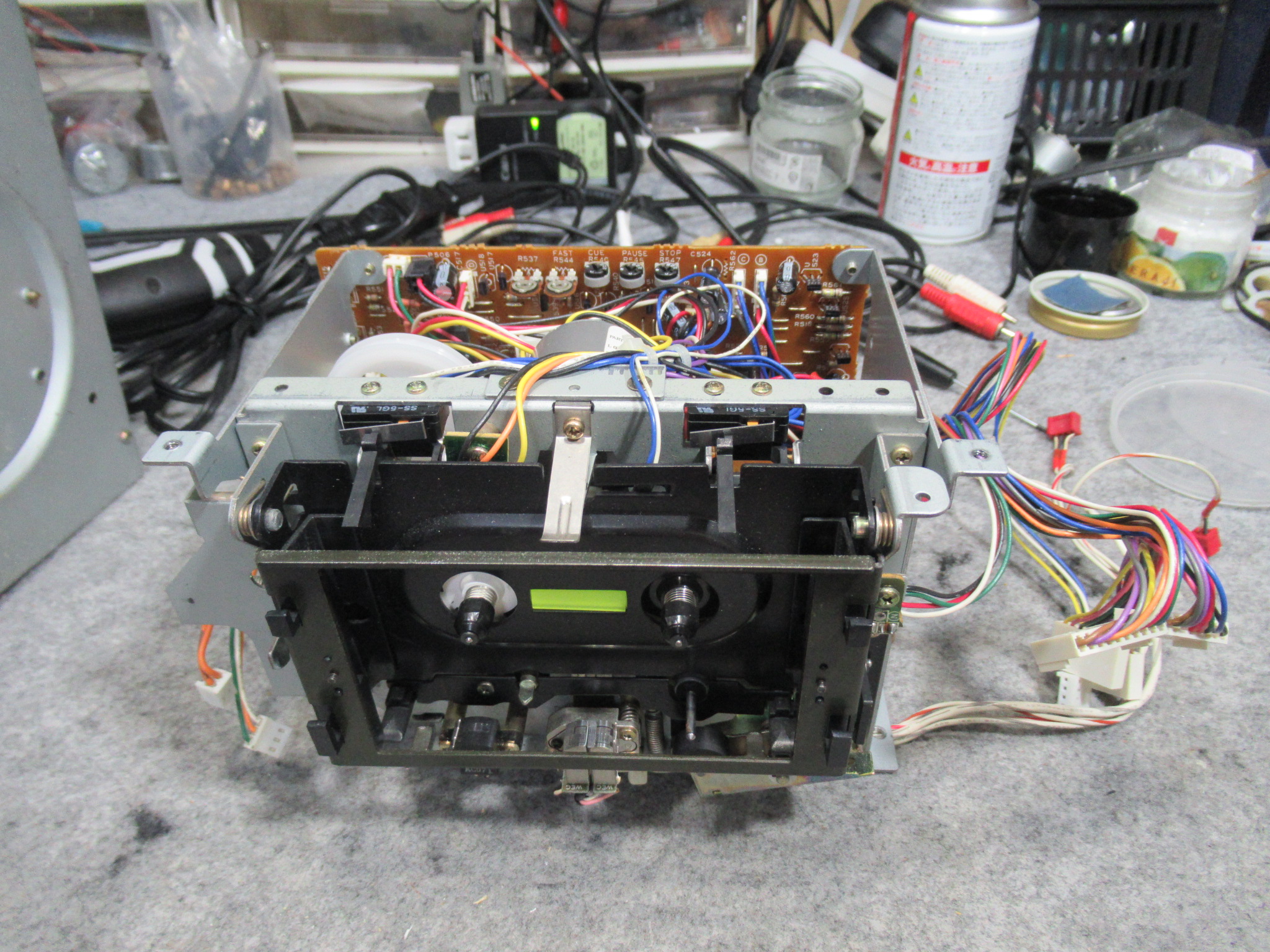 キャプスタンモーターは今まで見たものと異なりますので、他機種用と換装されているようです。そのためか、ケーブルが一度切断されて再接続されています。