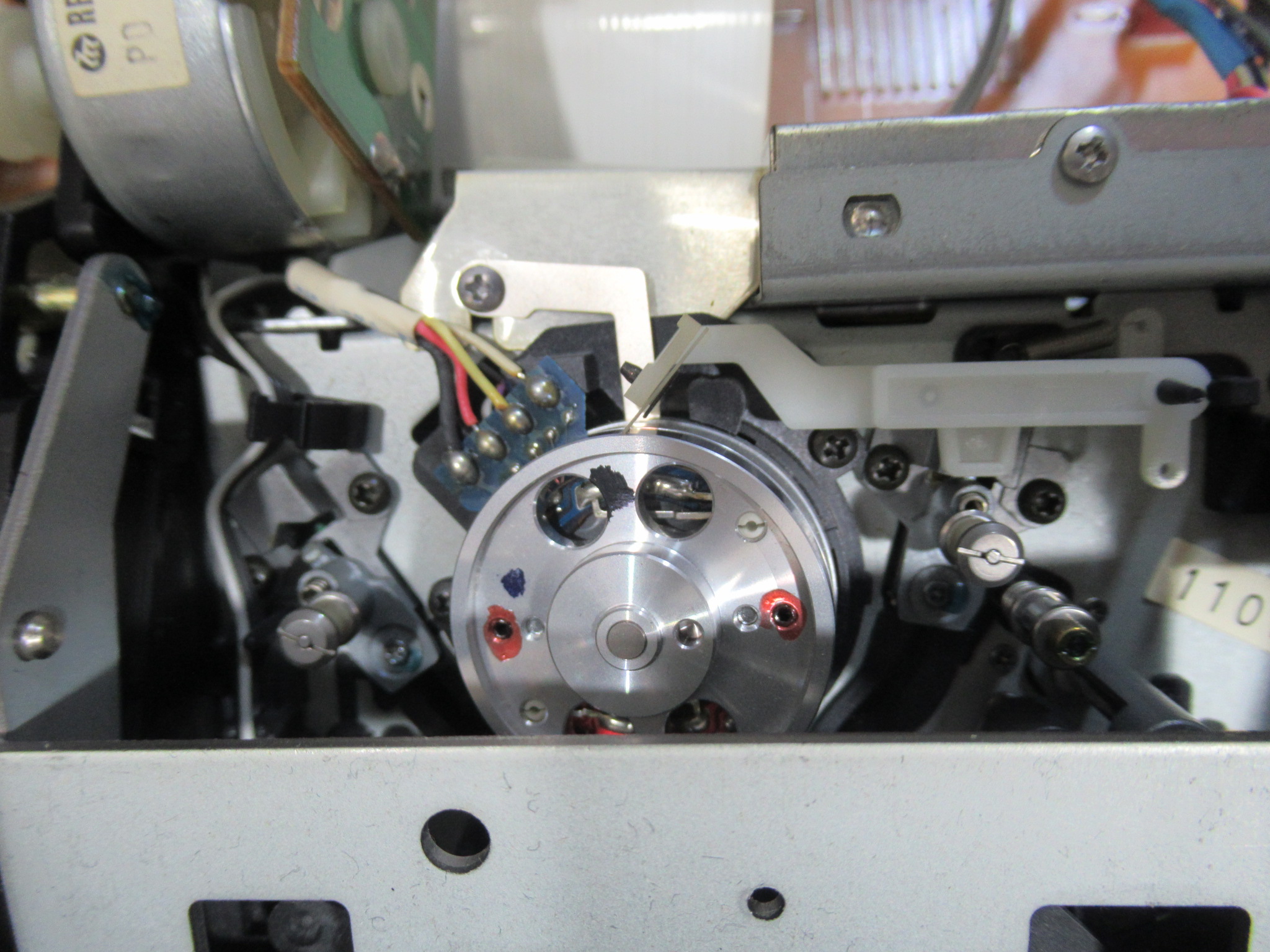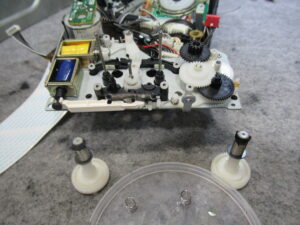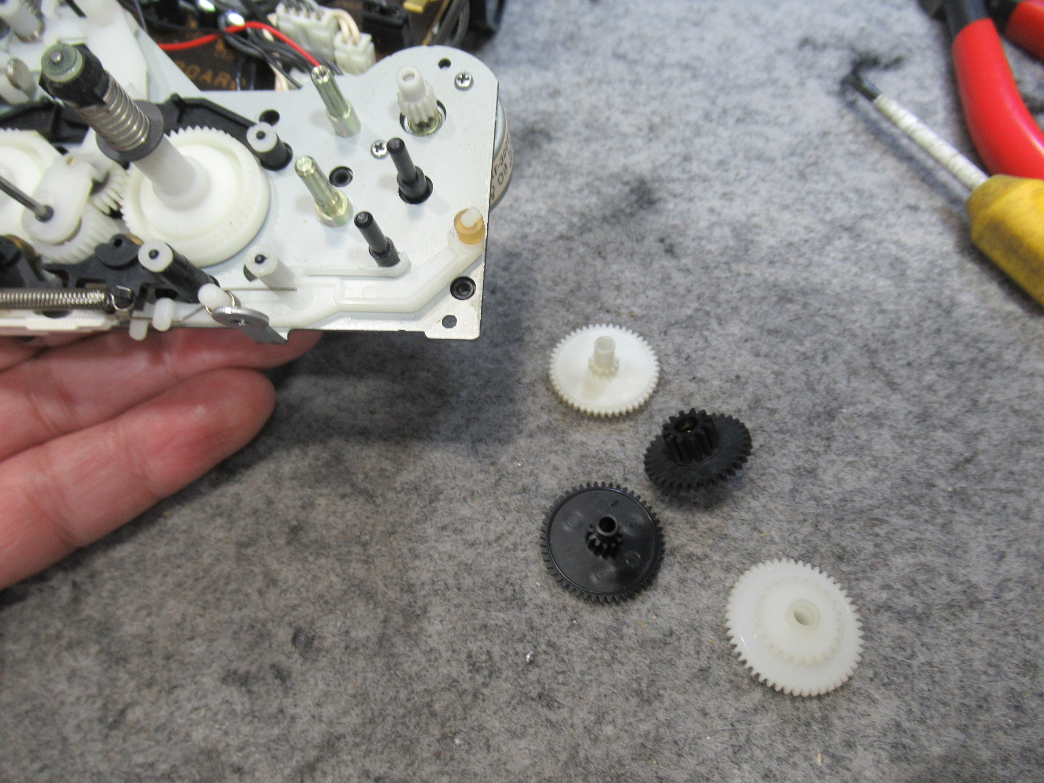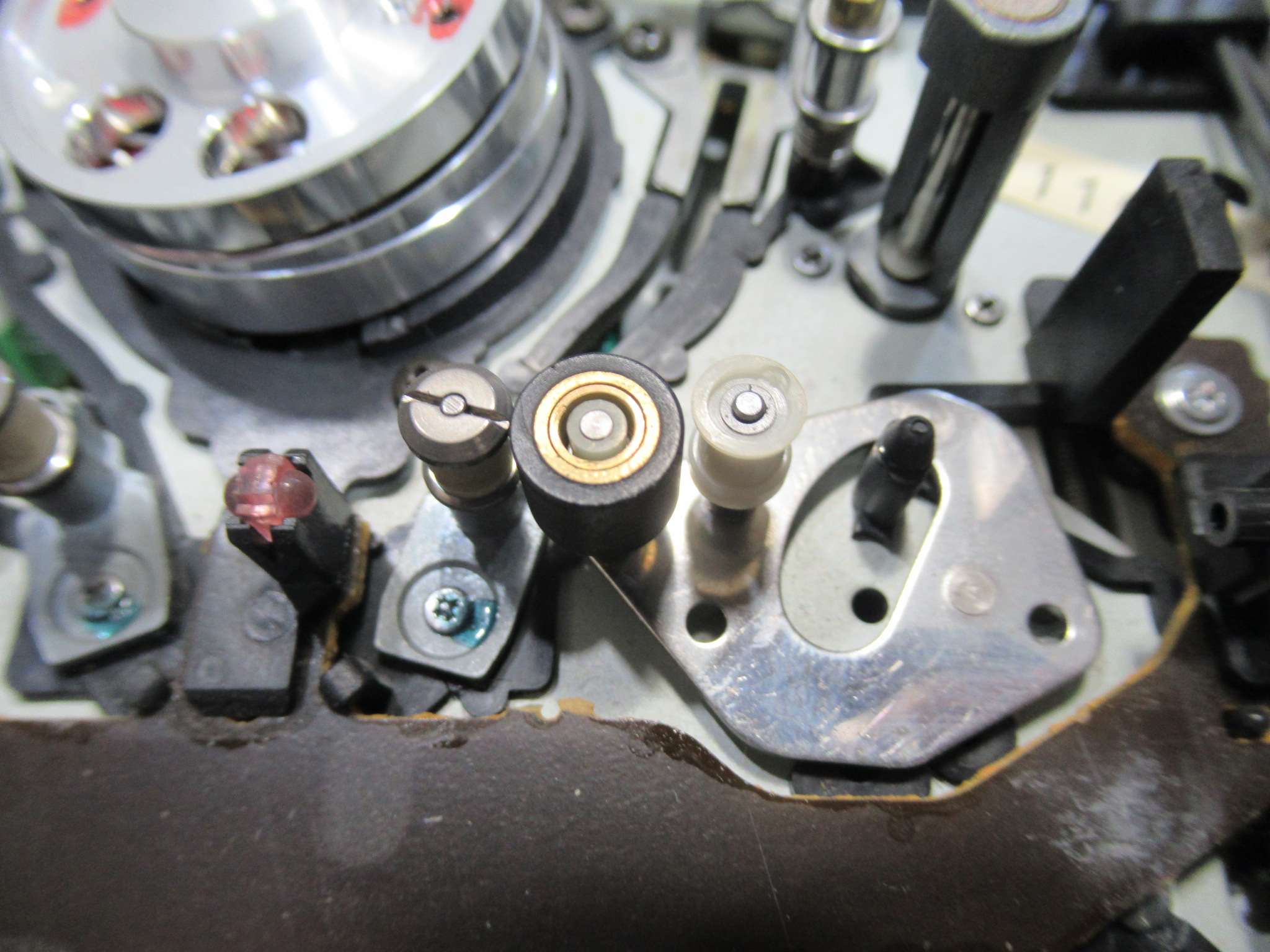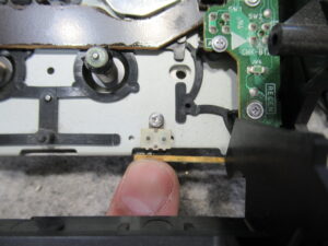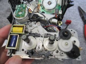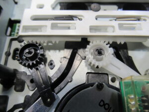 可動式テープガイドを駆動する白黒ギヤの固定用留め具が割れています。