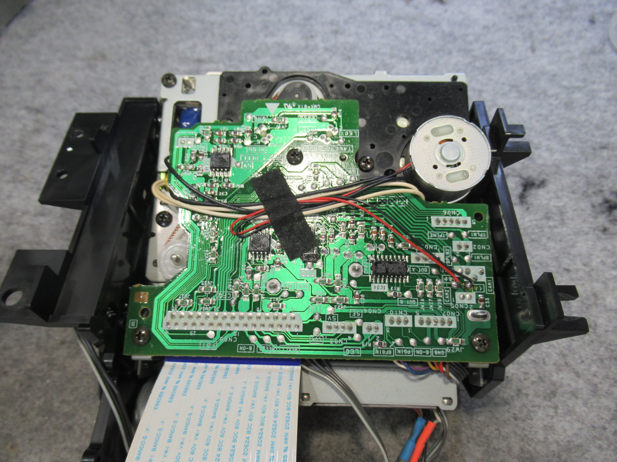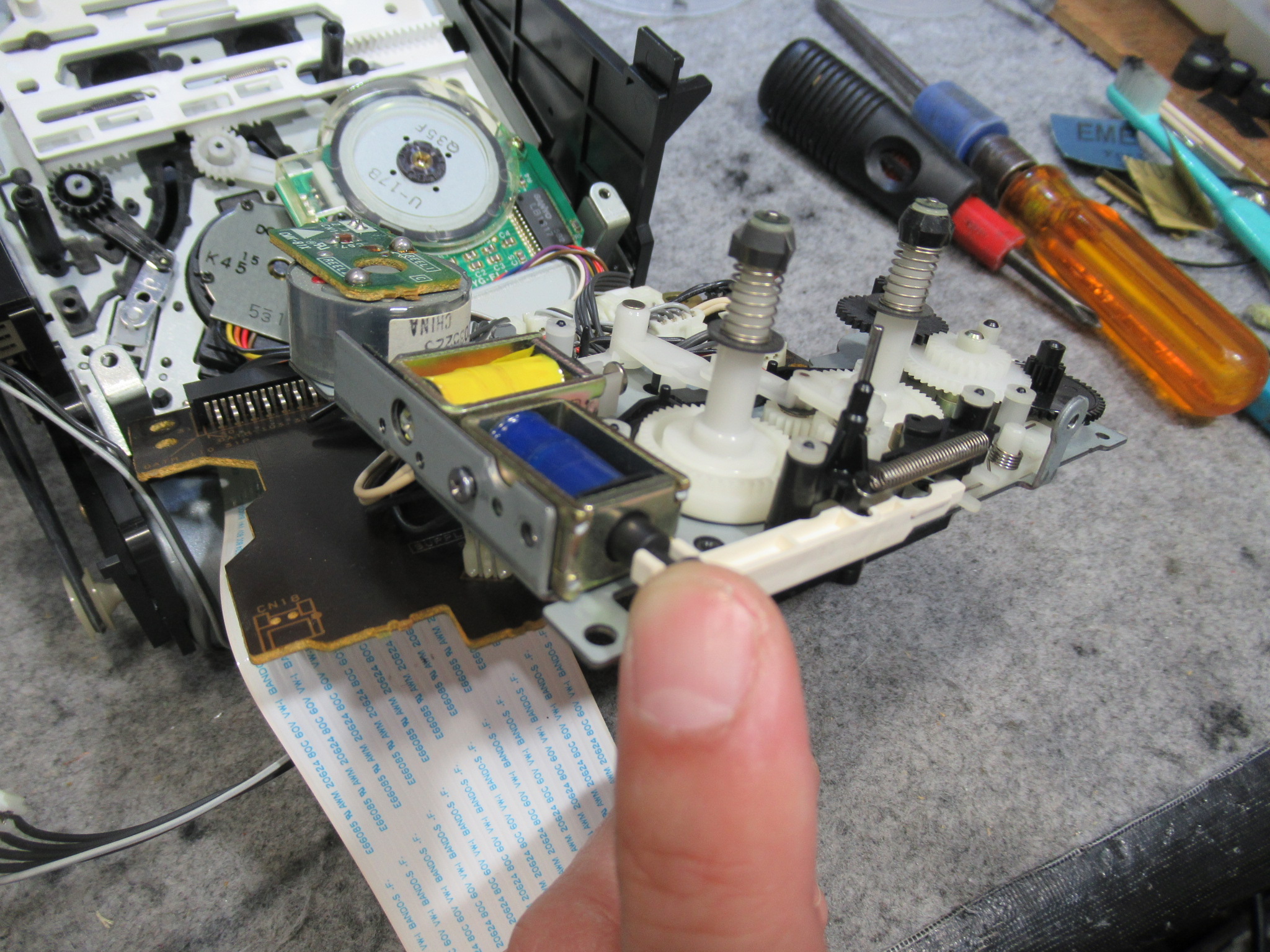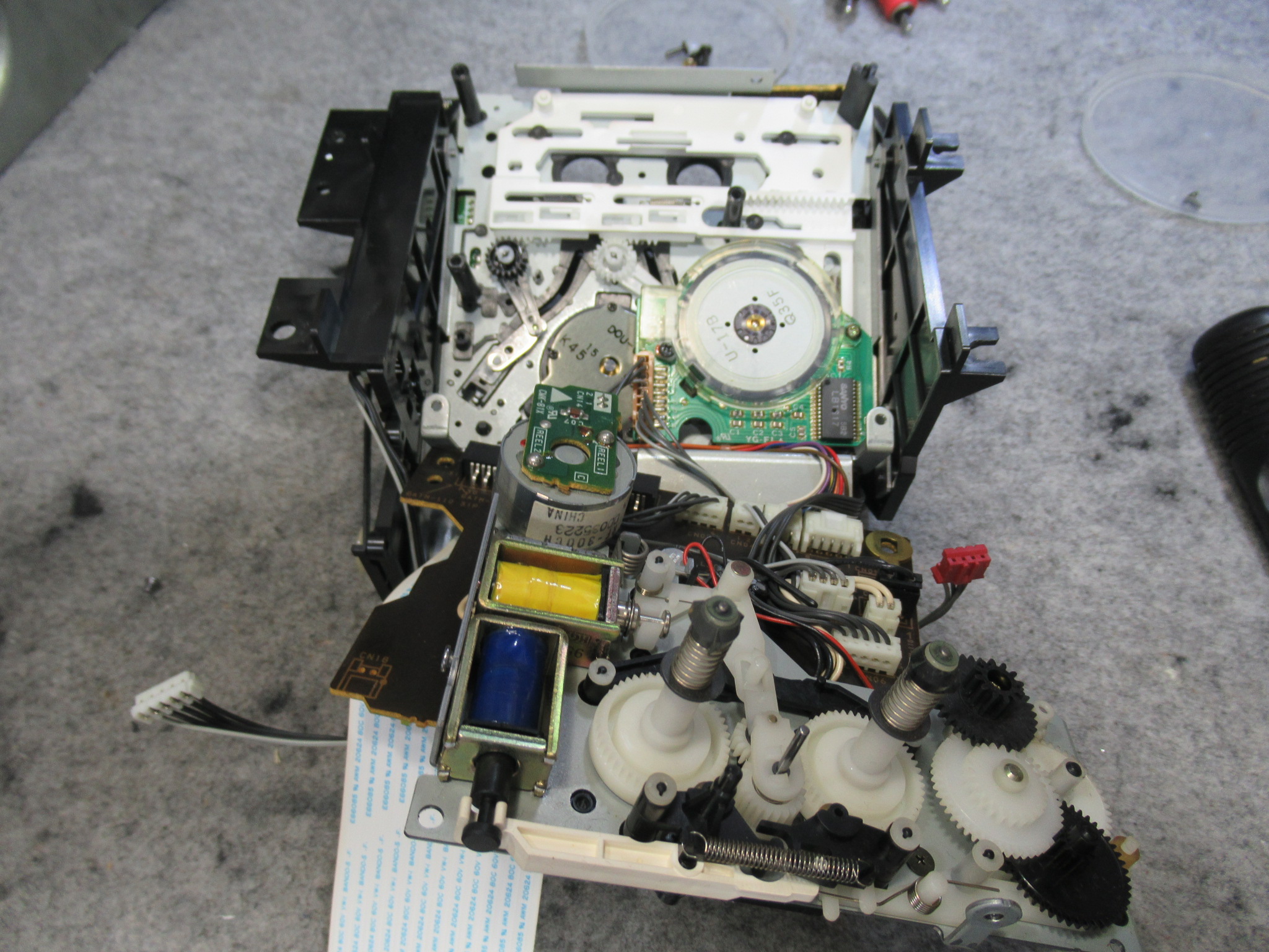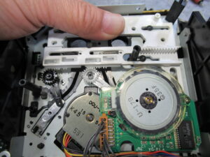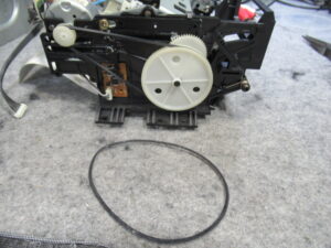 可動式テープガイドを駆動する白黒ギヤの固定用留め具が割れています。