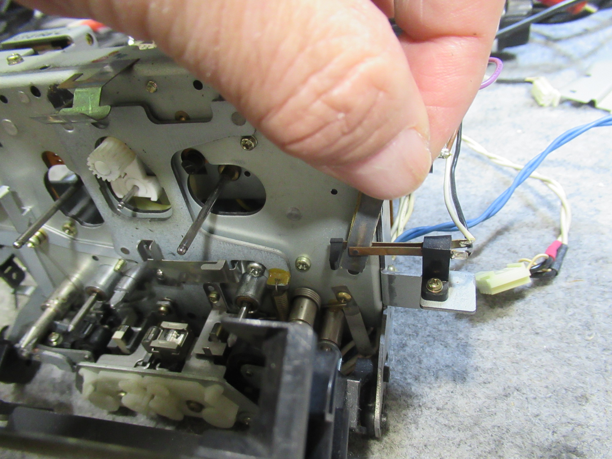 トレイ開閉を検知するスイッチ接点を磨きます。