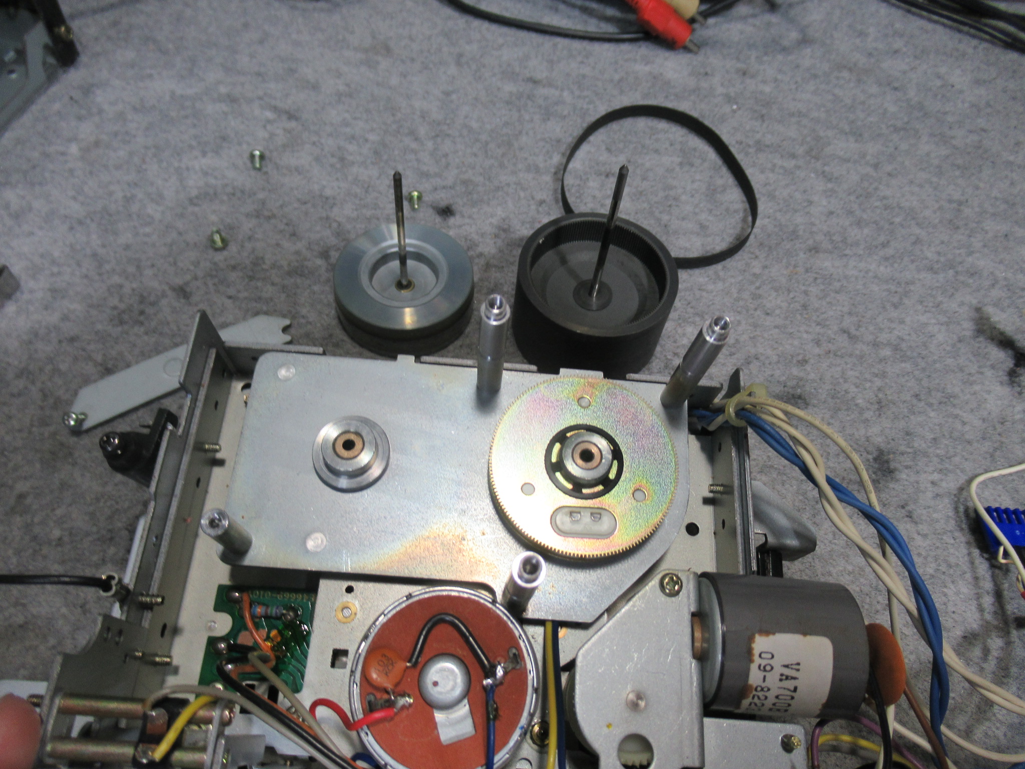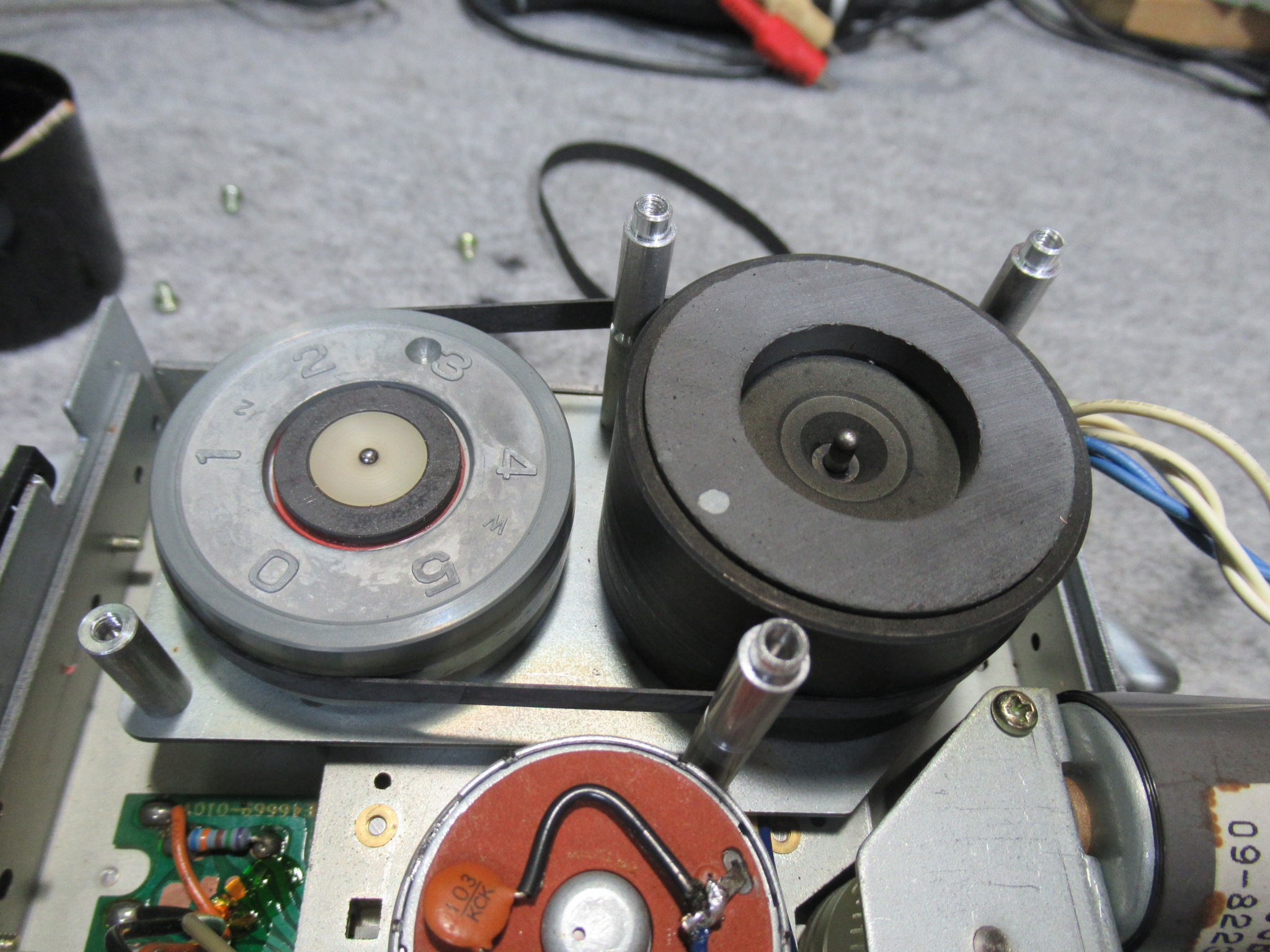 キャプスタンにグリスを処置し、新しいベルトを掛けて組み立てます。