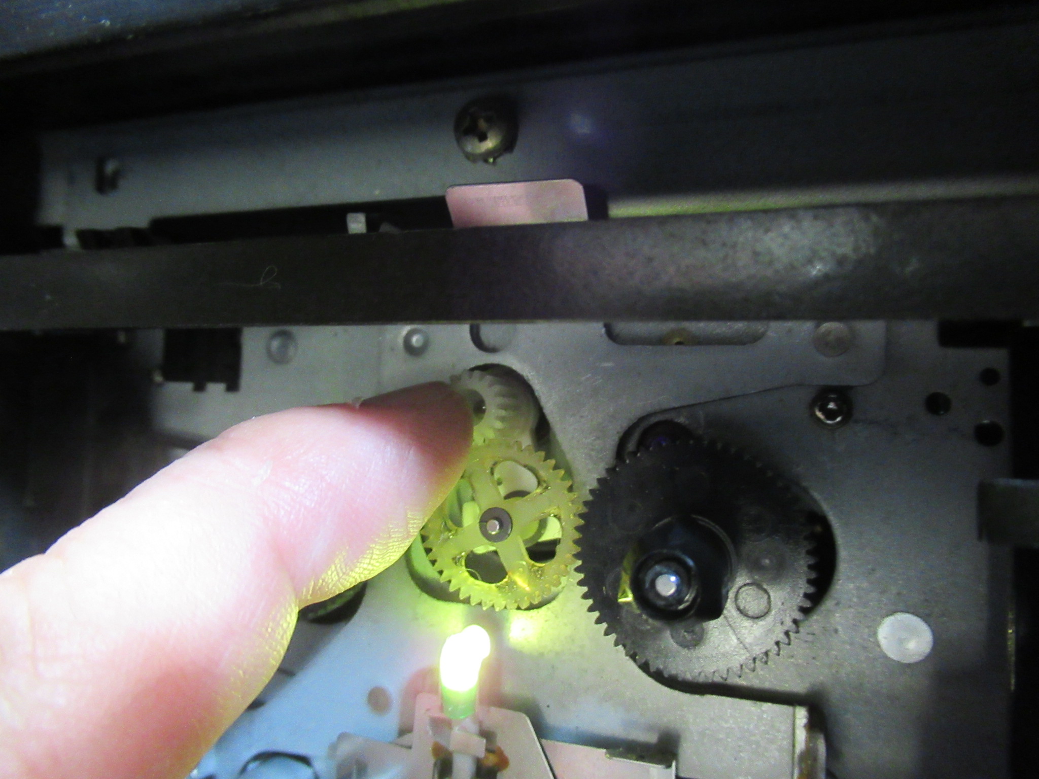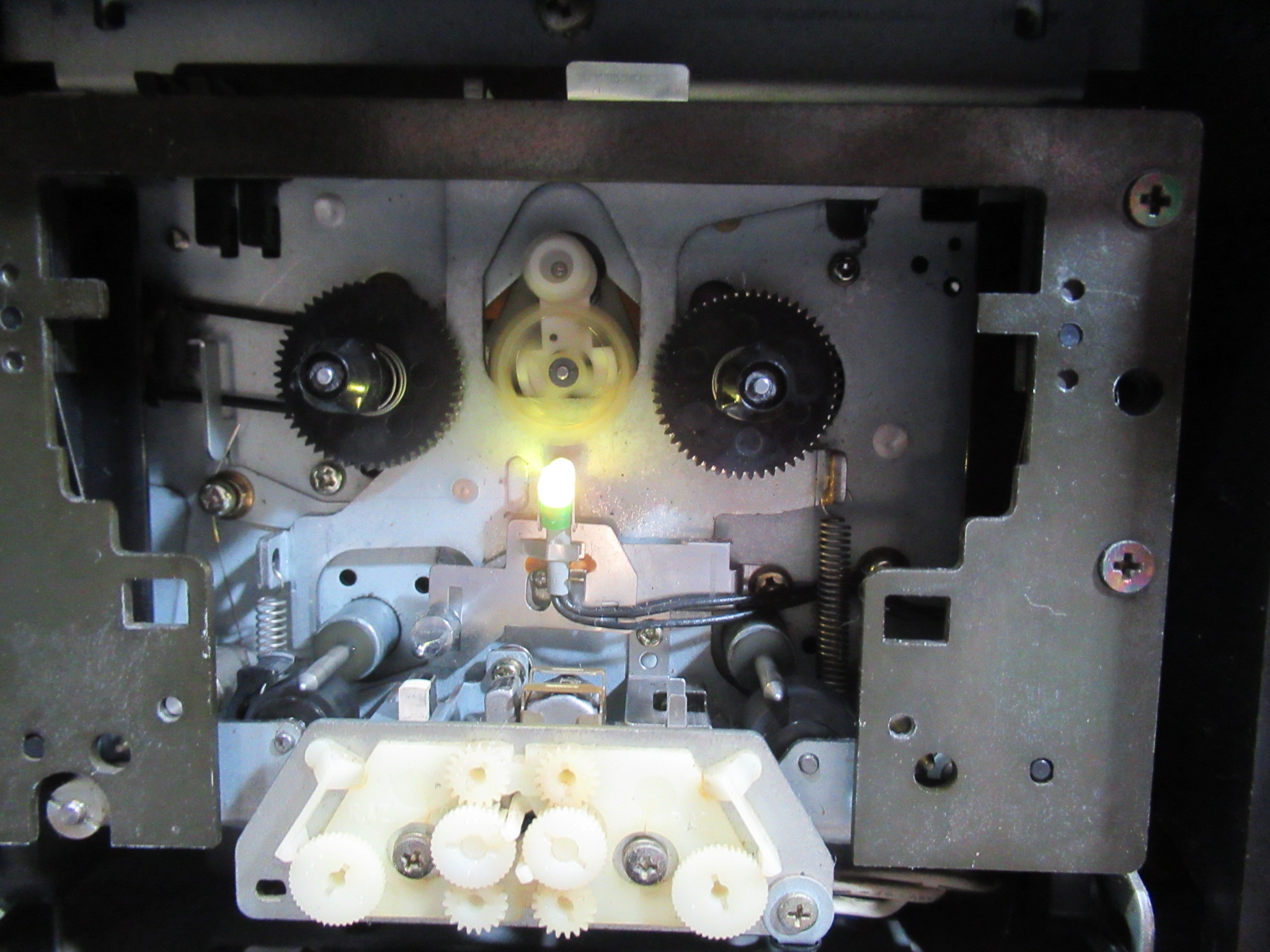 化粧パネルを取り外して動作状況を目視で確認したところ、再生時は、アイドラーギヤが写真のような状態で、右側リールと接触しません。