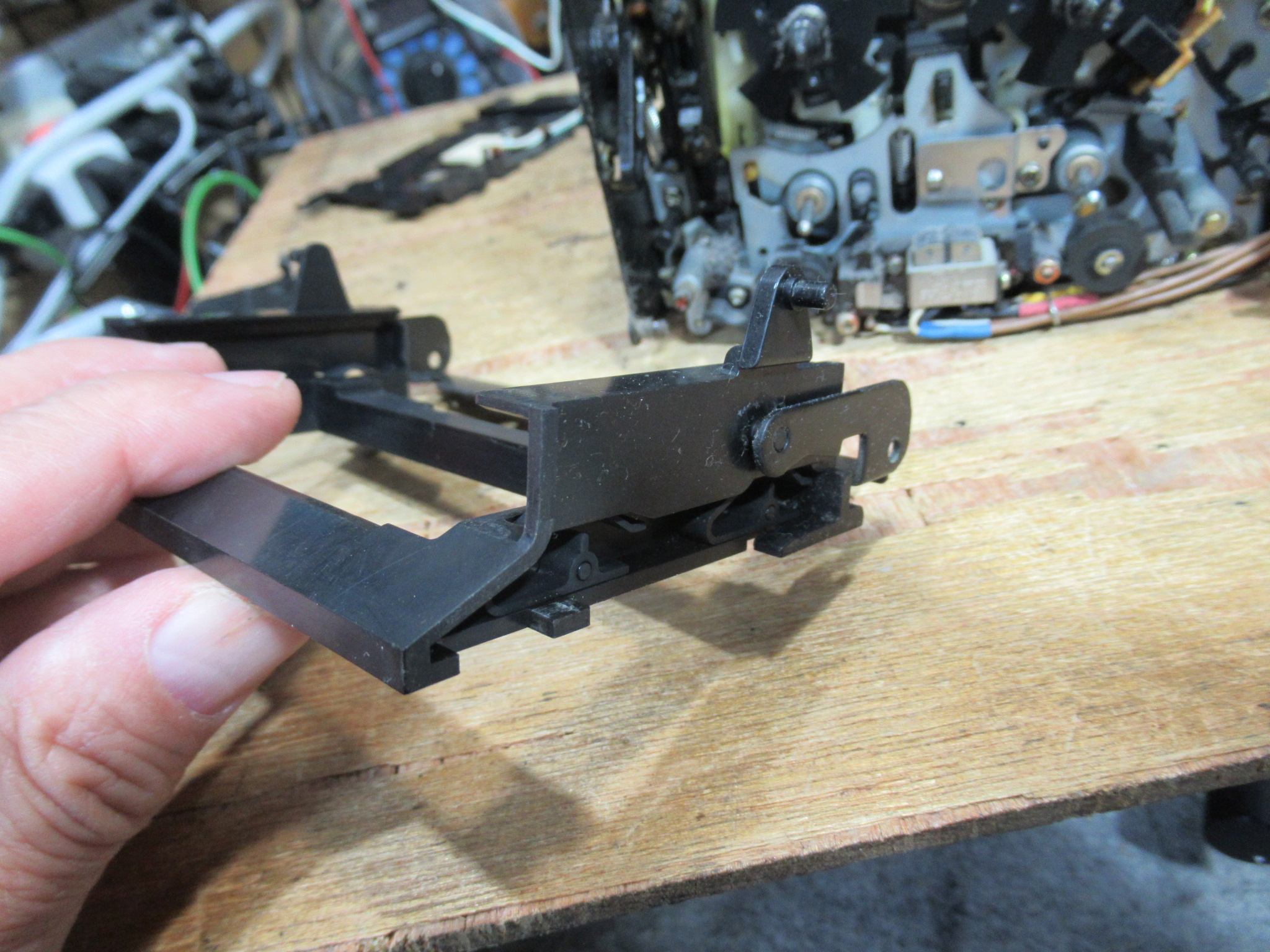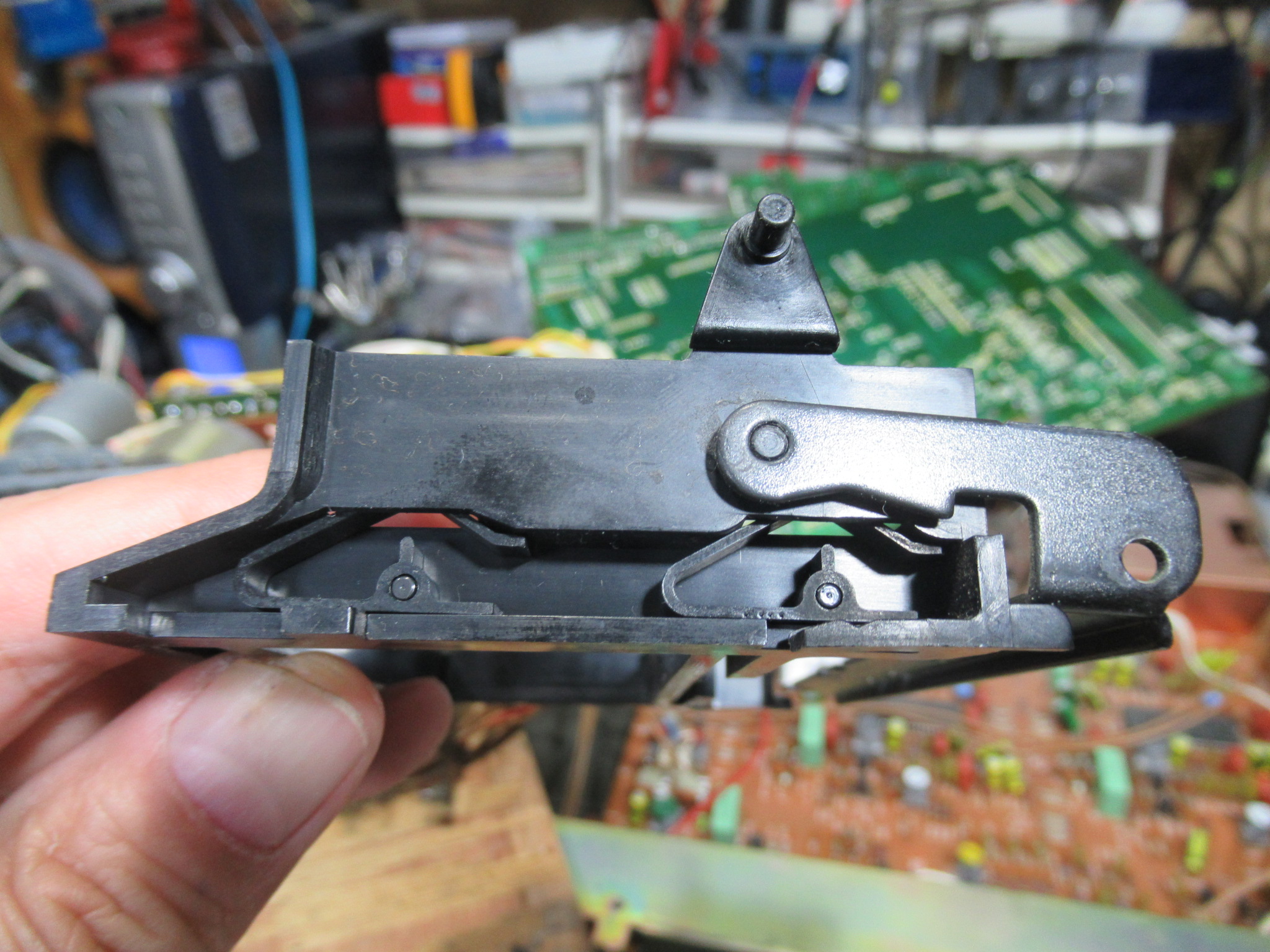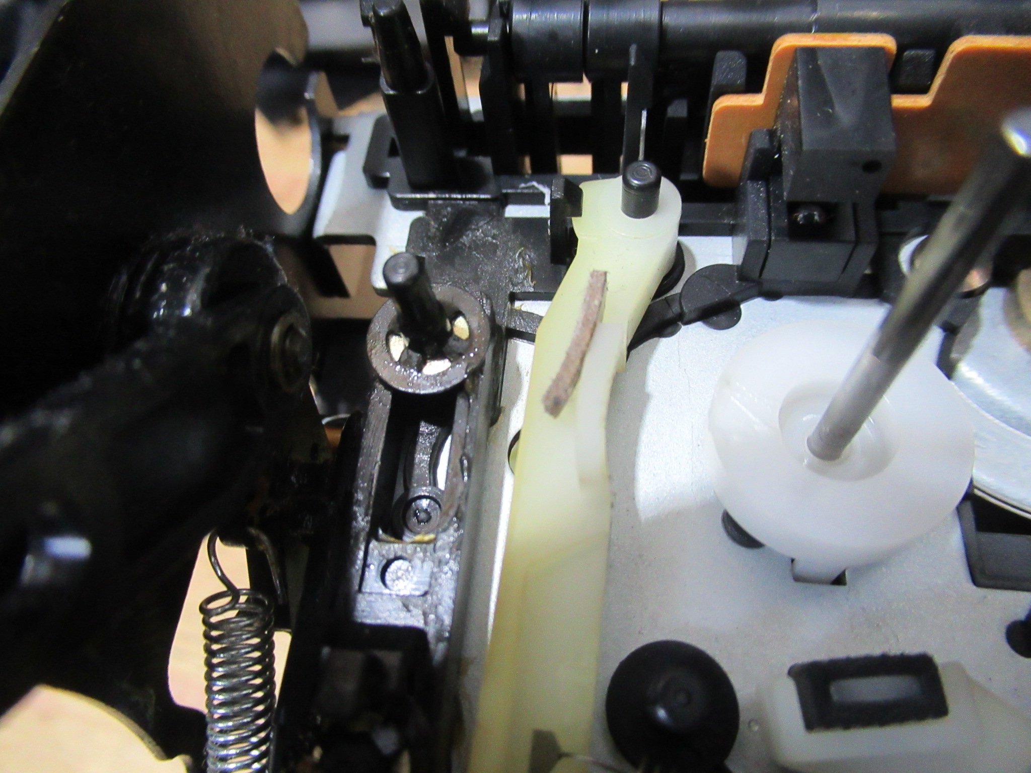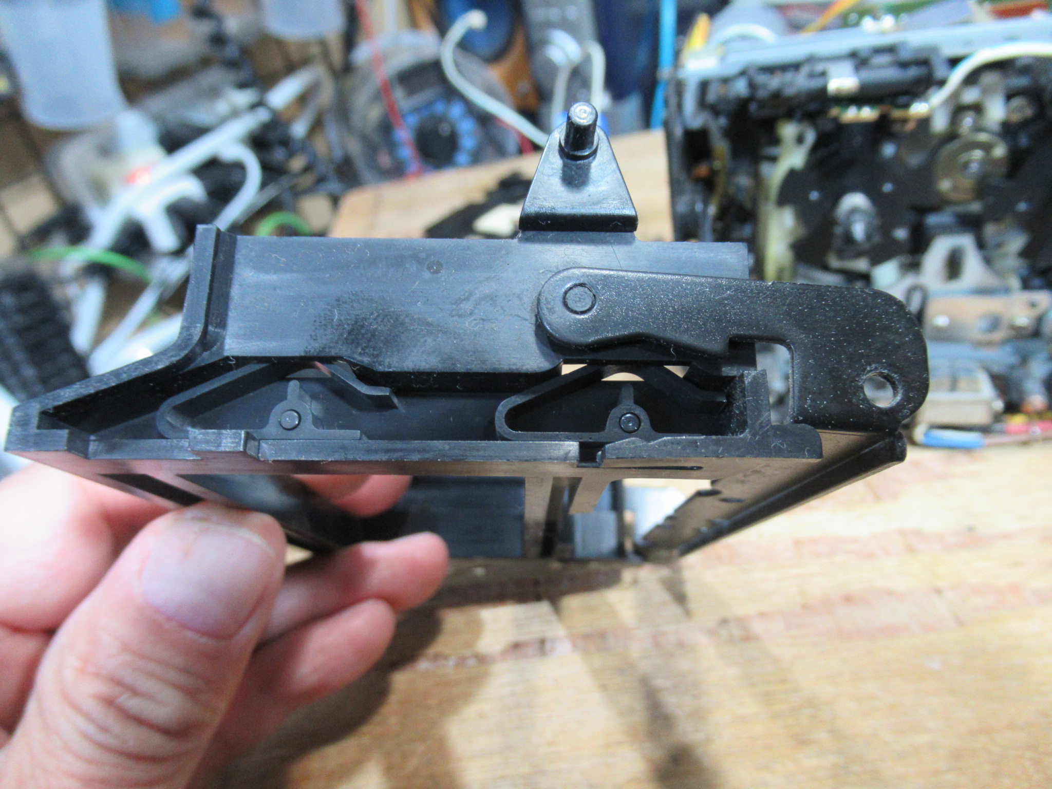ホルダーの両脇には、カセットを押さえ付ける樹脂製のバネが内蔵されていますが、長年の使用によりヘタっています。
