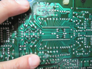 指先の部分が汚れています。右写真は基板の下側です。ここも間違いなく液漏れしています。