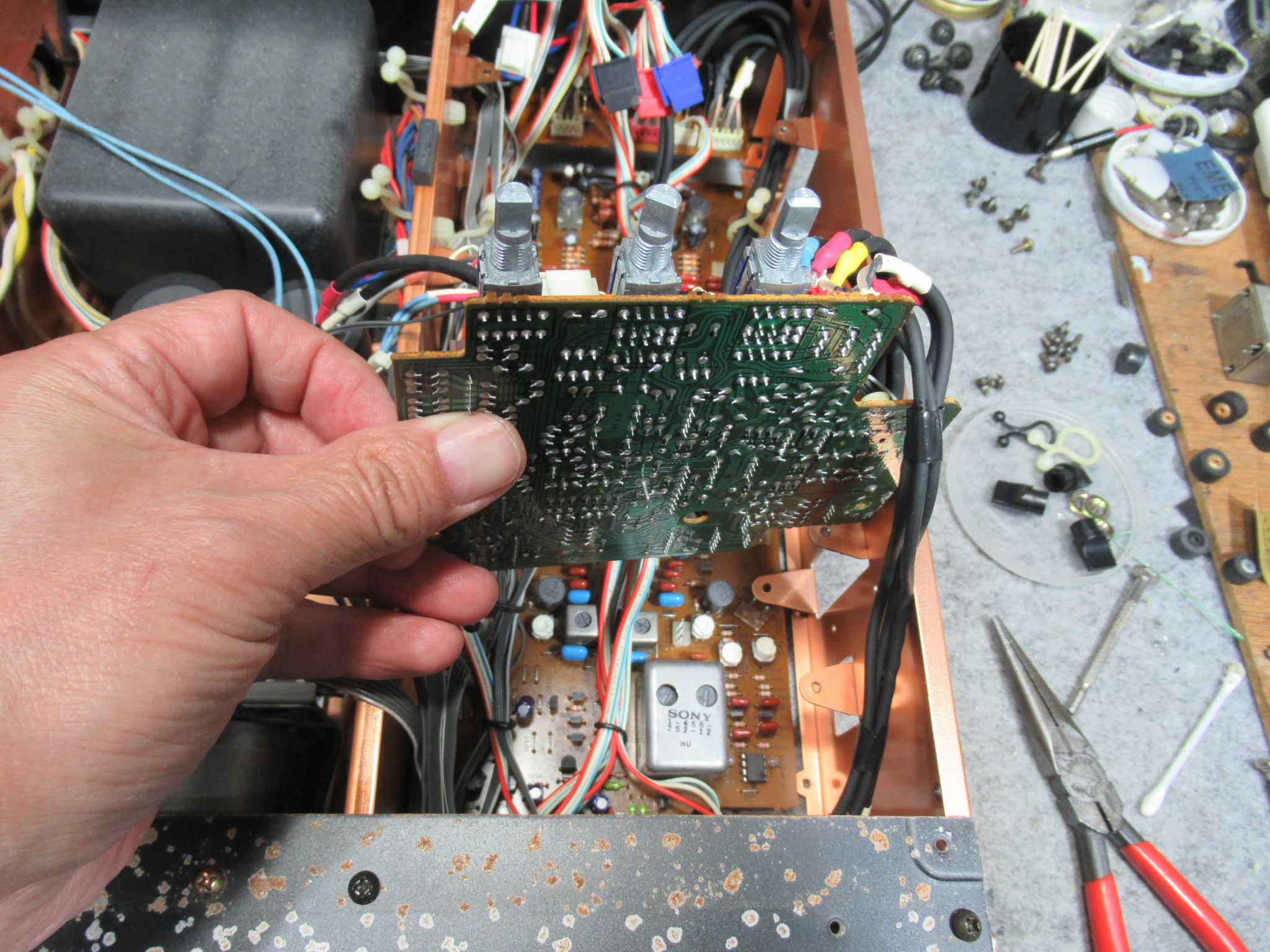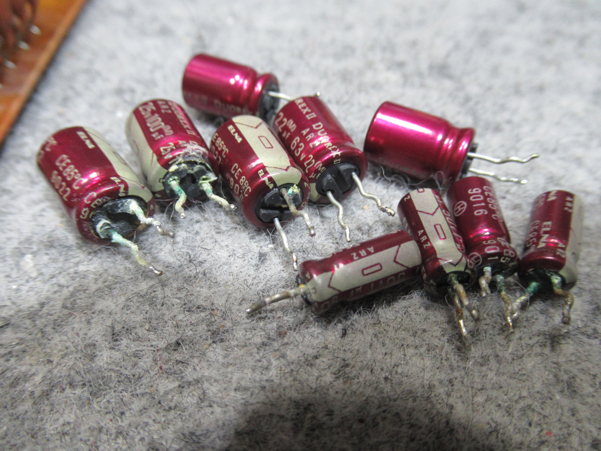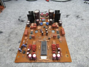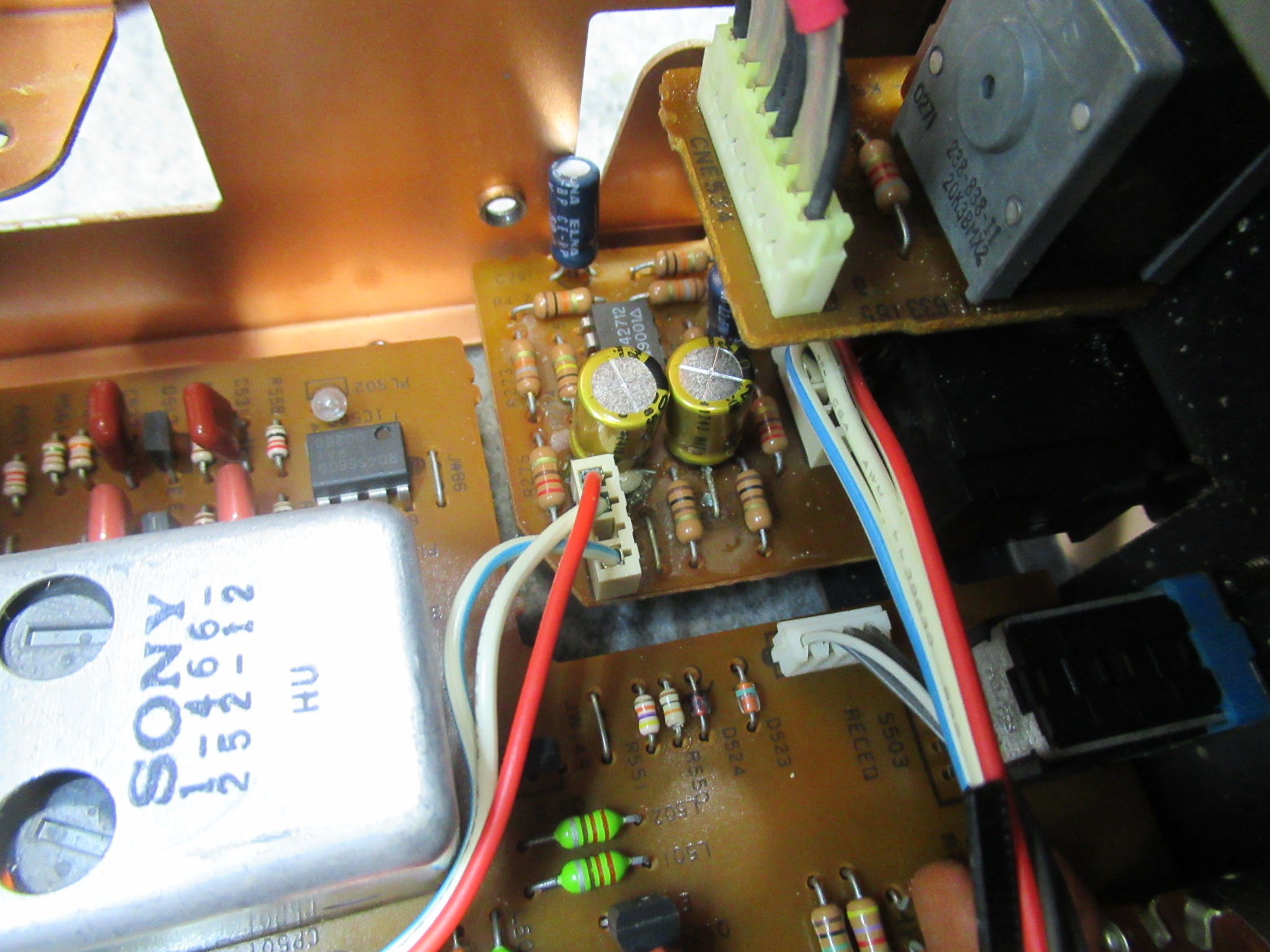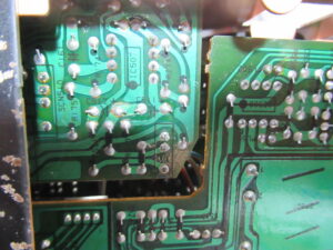 録音基板です。ELNA社製の電解コンデンサー取付部が液漏れで白く汚れています。