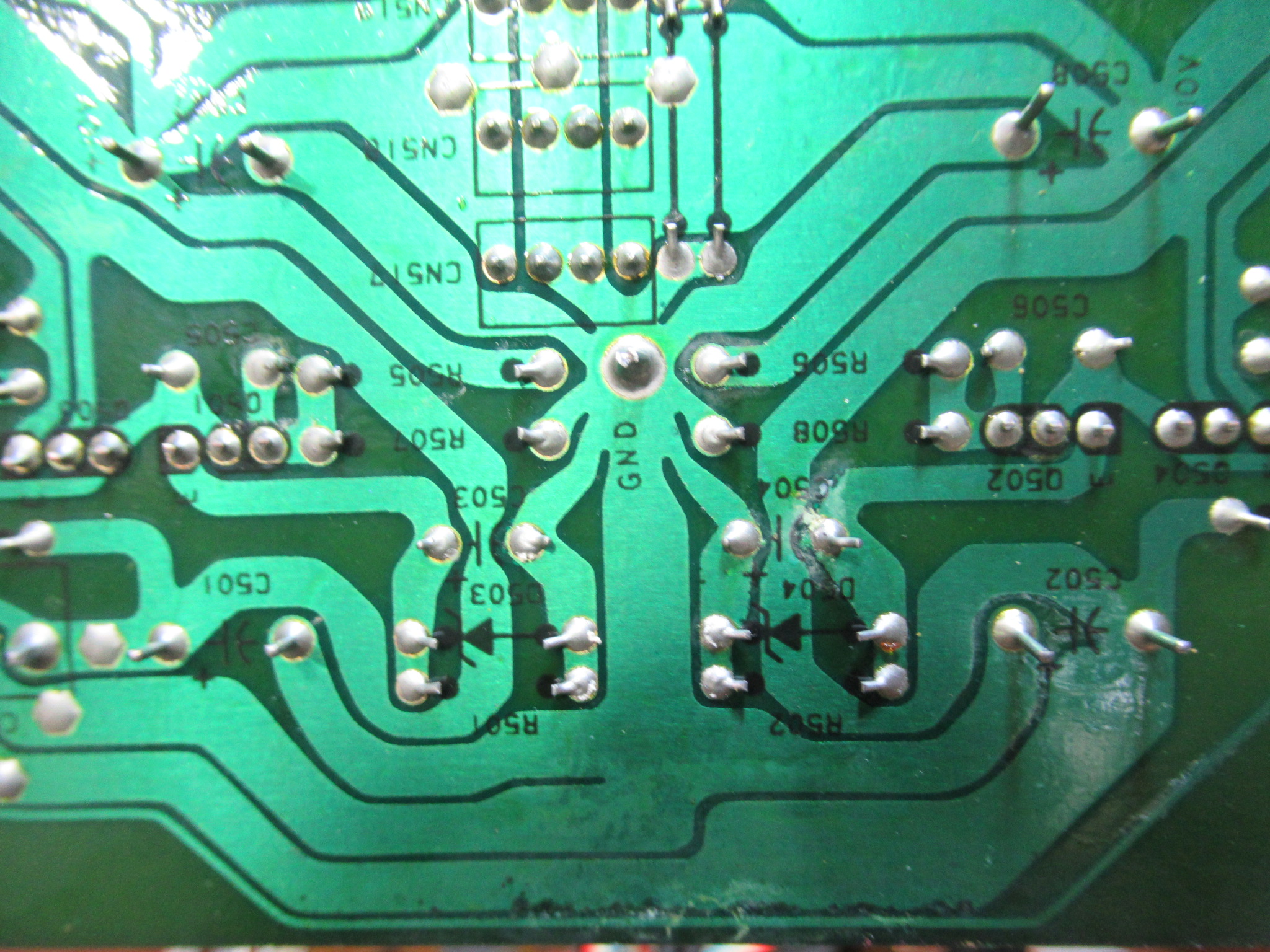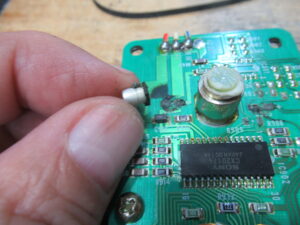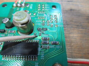 もう片方の電解コンデンサーも触ると簡単に外れてしまいました。基板のダメージが心配ですので、テスターで導通を確認したところ、3か所ほど絶縁していました。