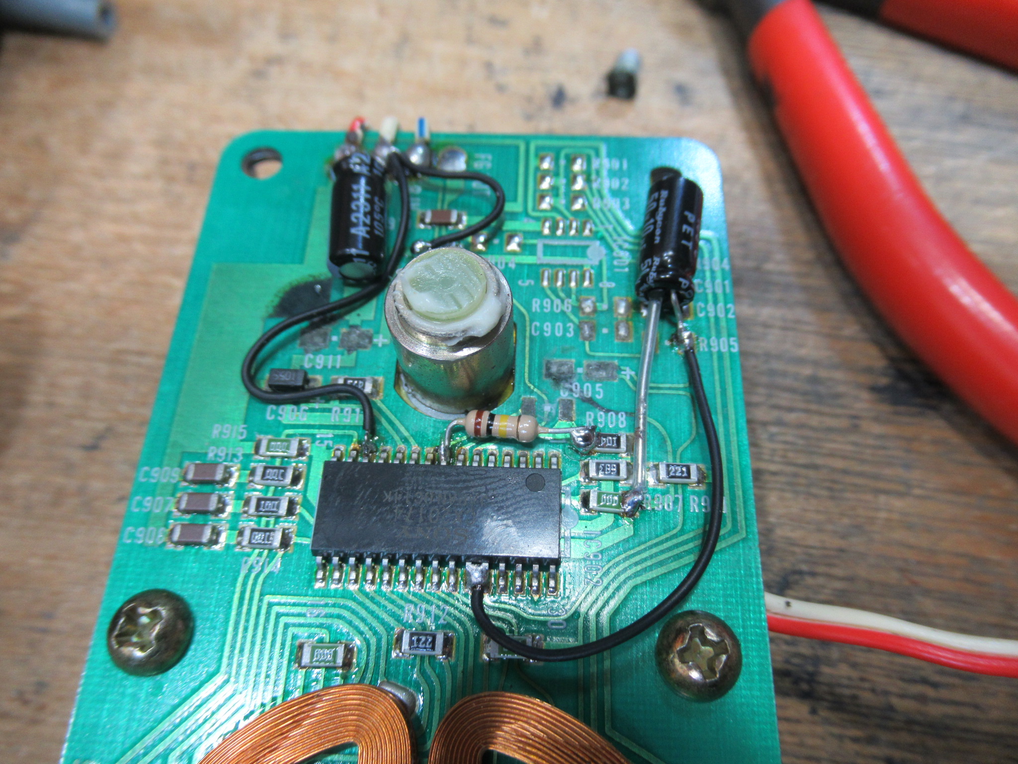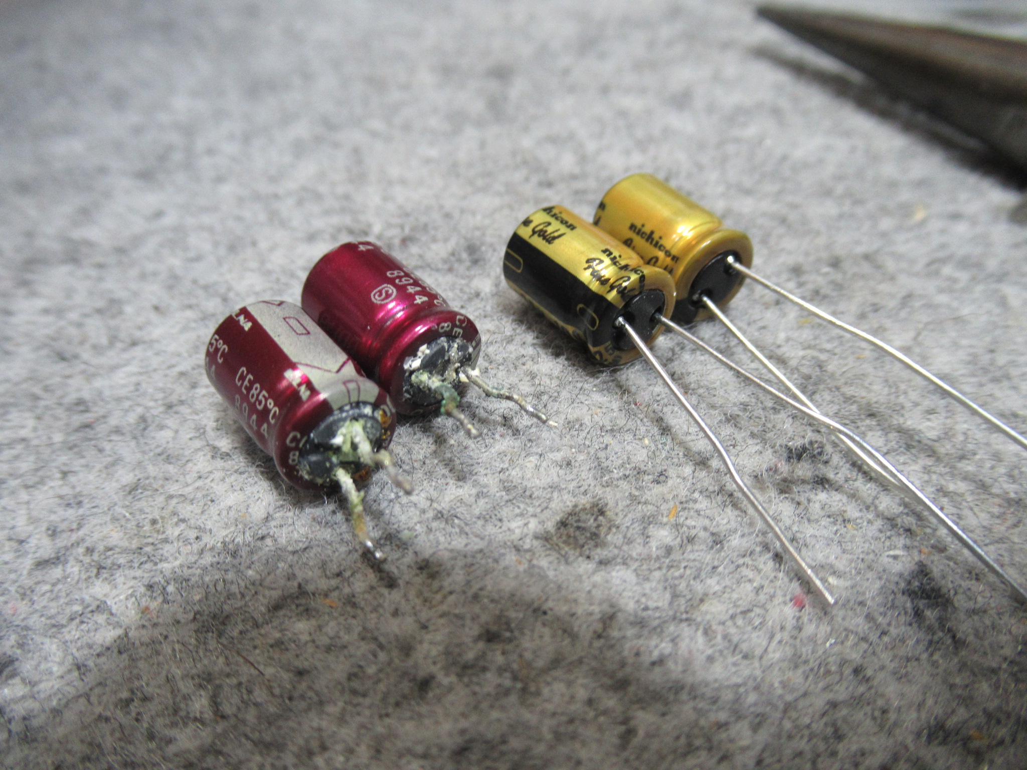 抵抗と電解コンデンサーを取り付け、液漏れによって絶縁してしまった箇所をバイパス処置します。