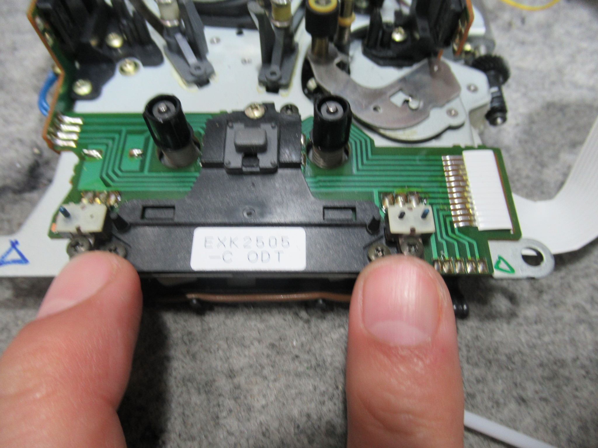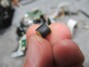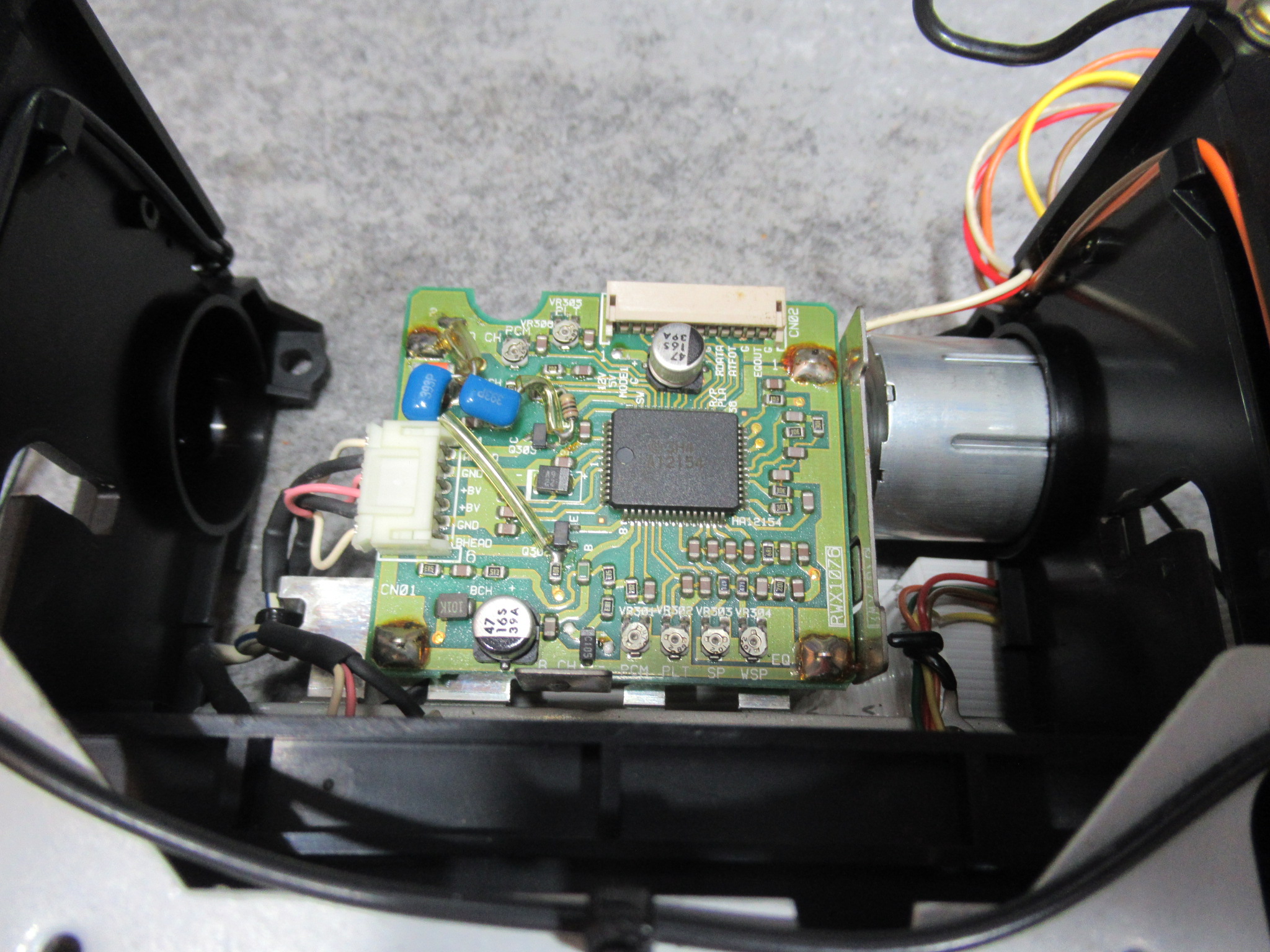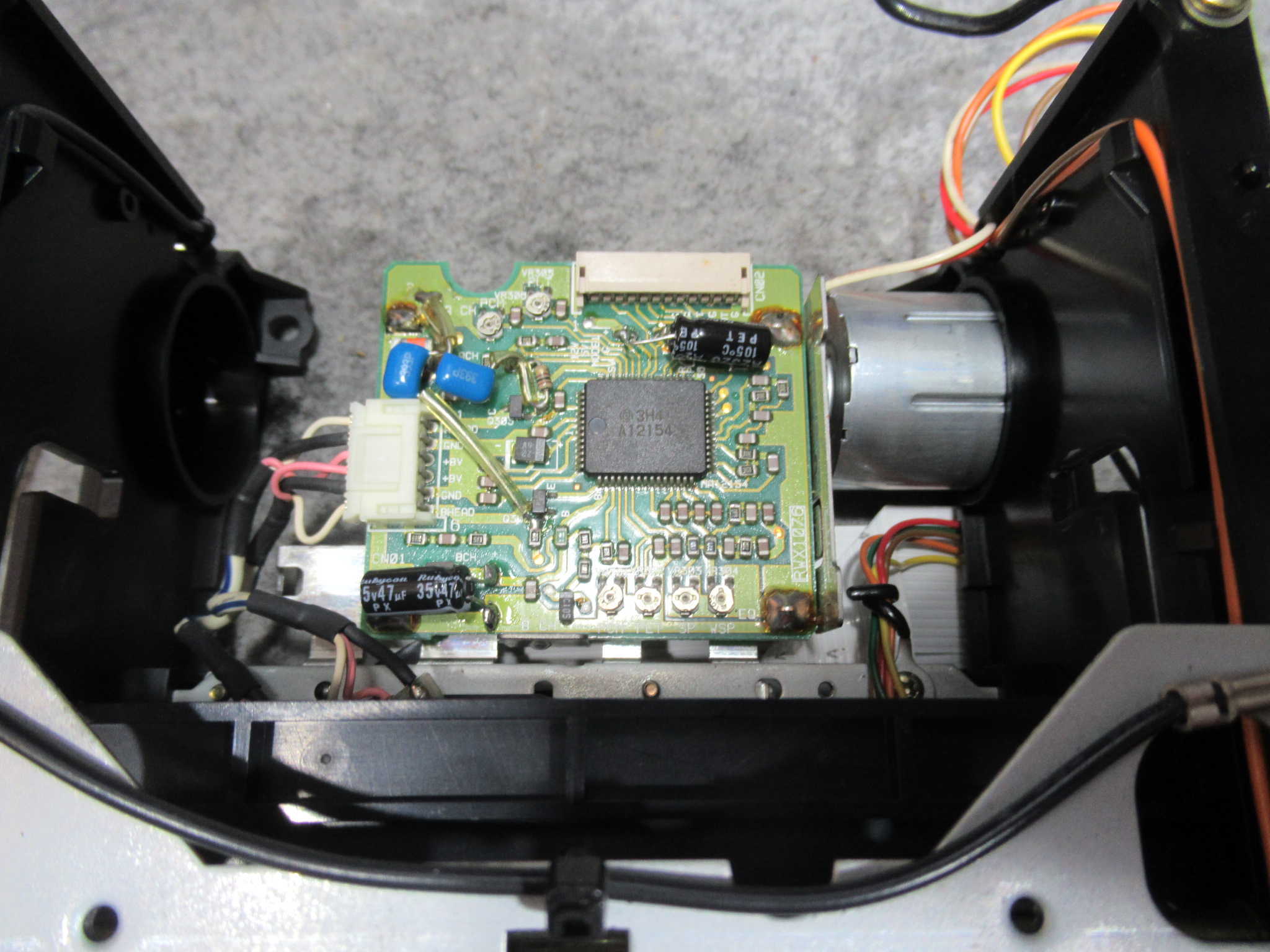 メカ後部には、ヘッドの信号を処理するRFユニットが取り付けられていますので、基板面の電解コンデンサーを交換します。
