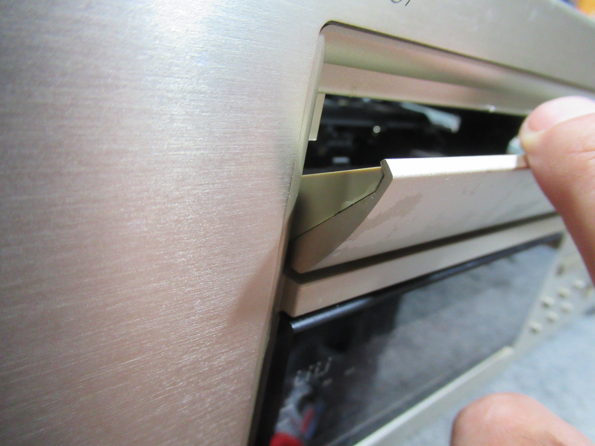 これはD-07のウィークポイントです。リッドがフロントパネルと干渉し、途中で引っ掛かりを感じます。放置しておくと開閉不良の原因になったり、場合によってはリッドが外れてしまいますので処置を行います。