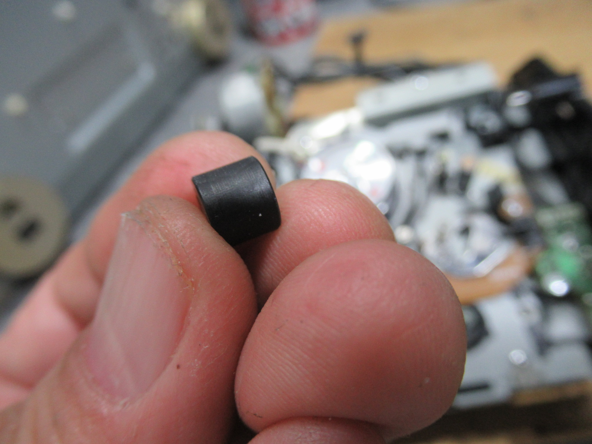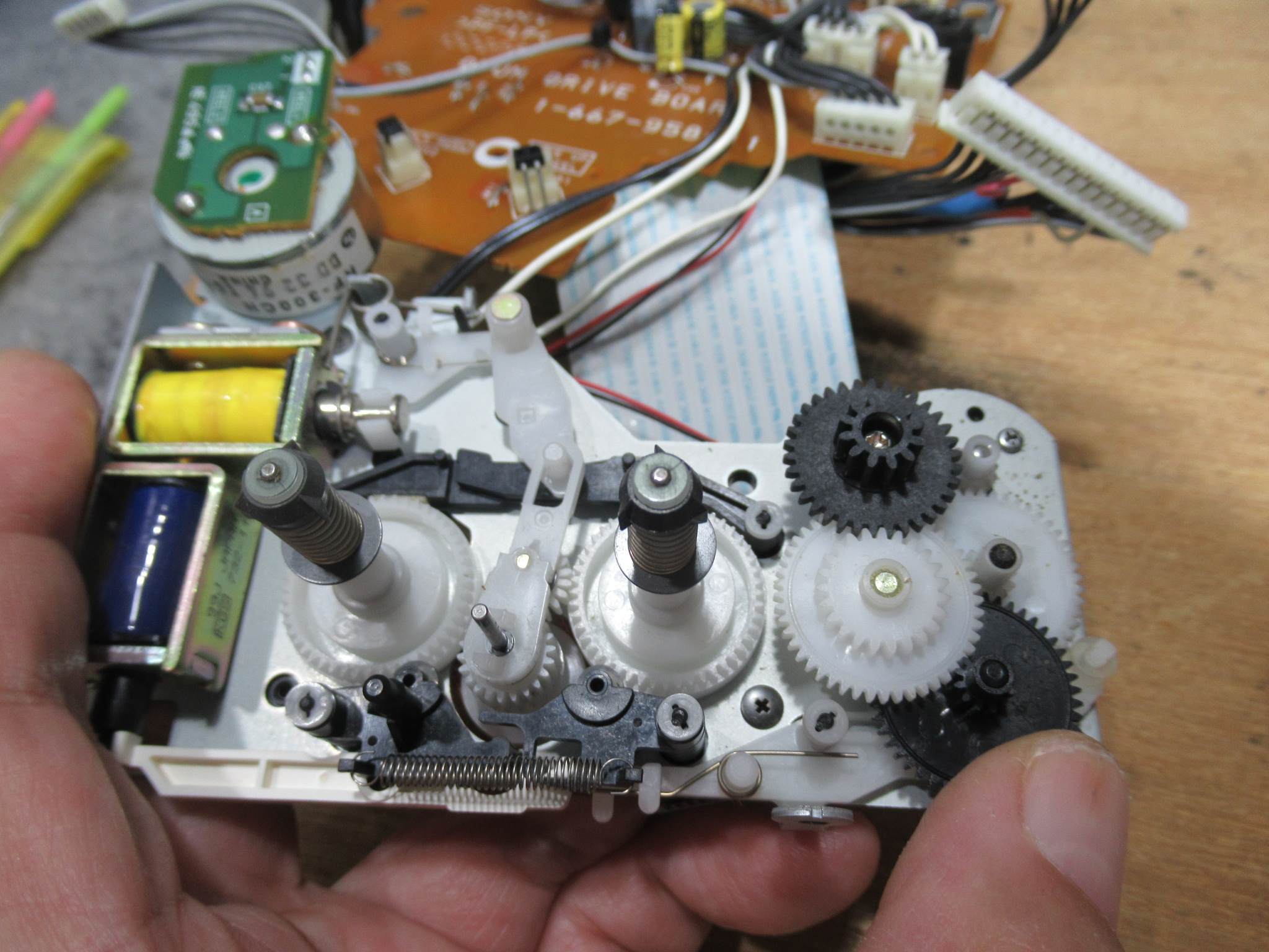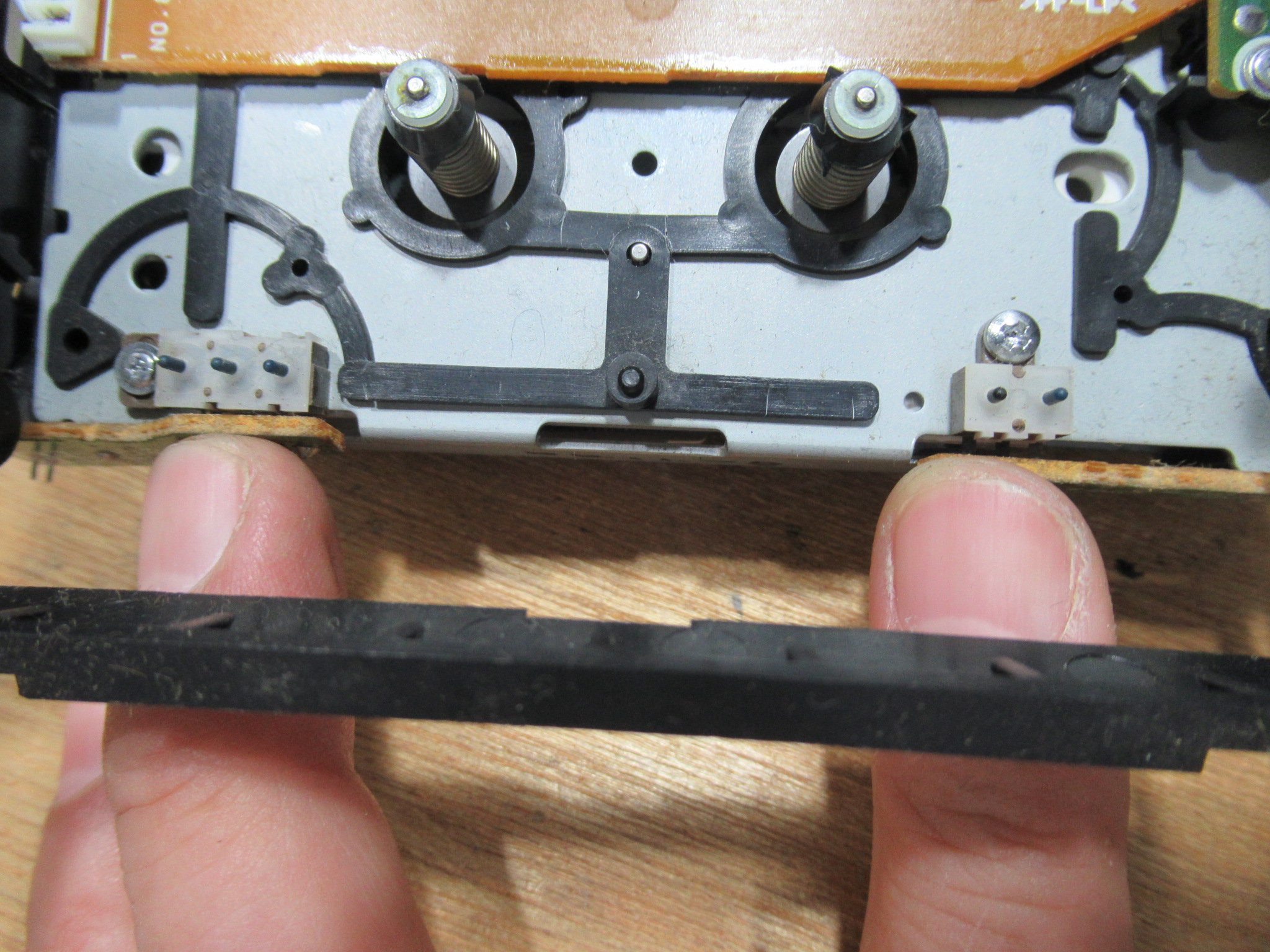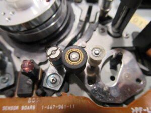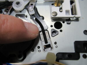 キャプスタンモーターユニットを取り外し、ガイドレールが変形によって狭くなっている箇所を修正します。