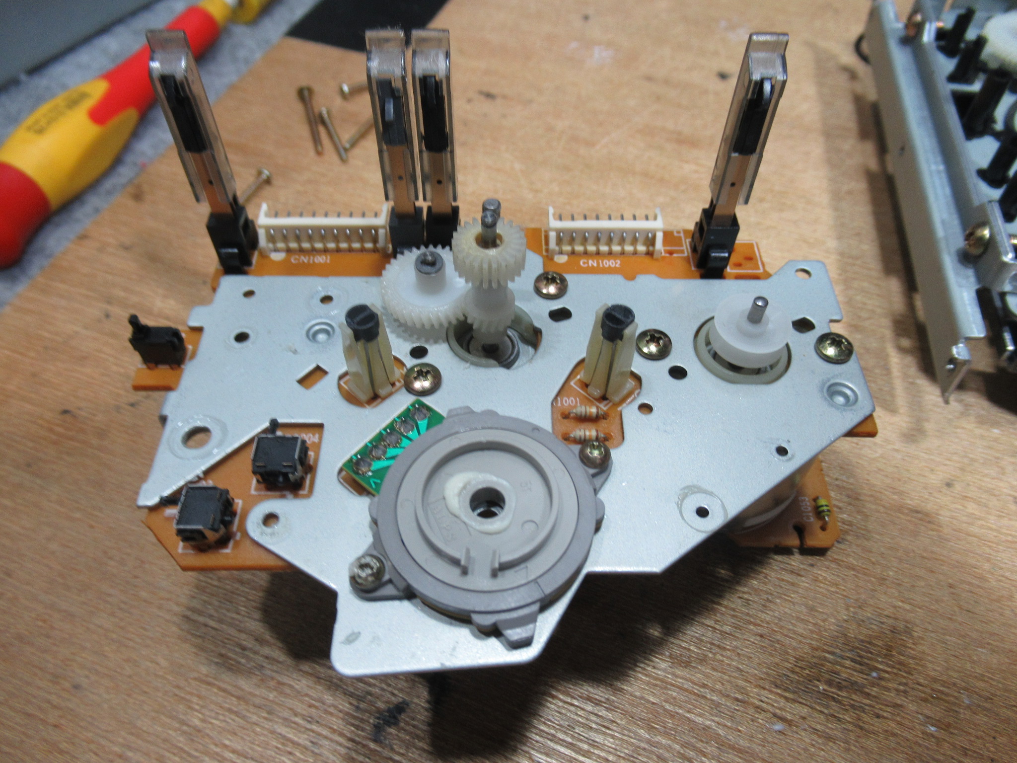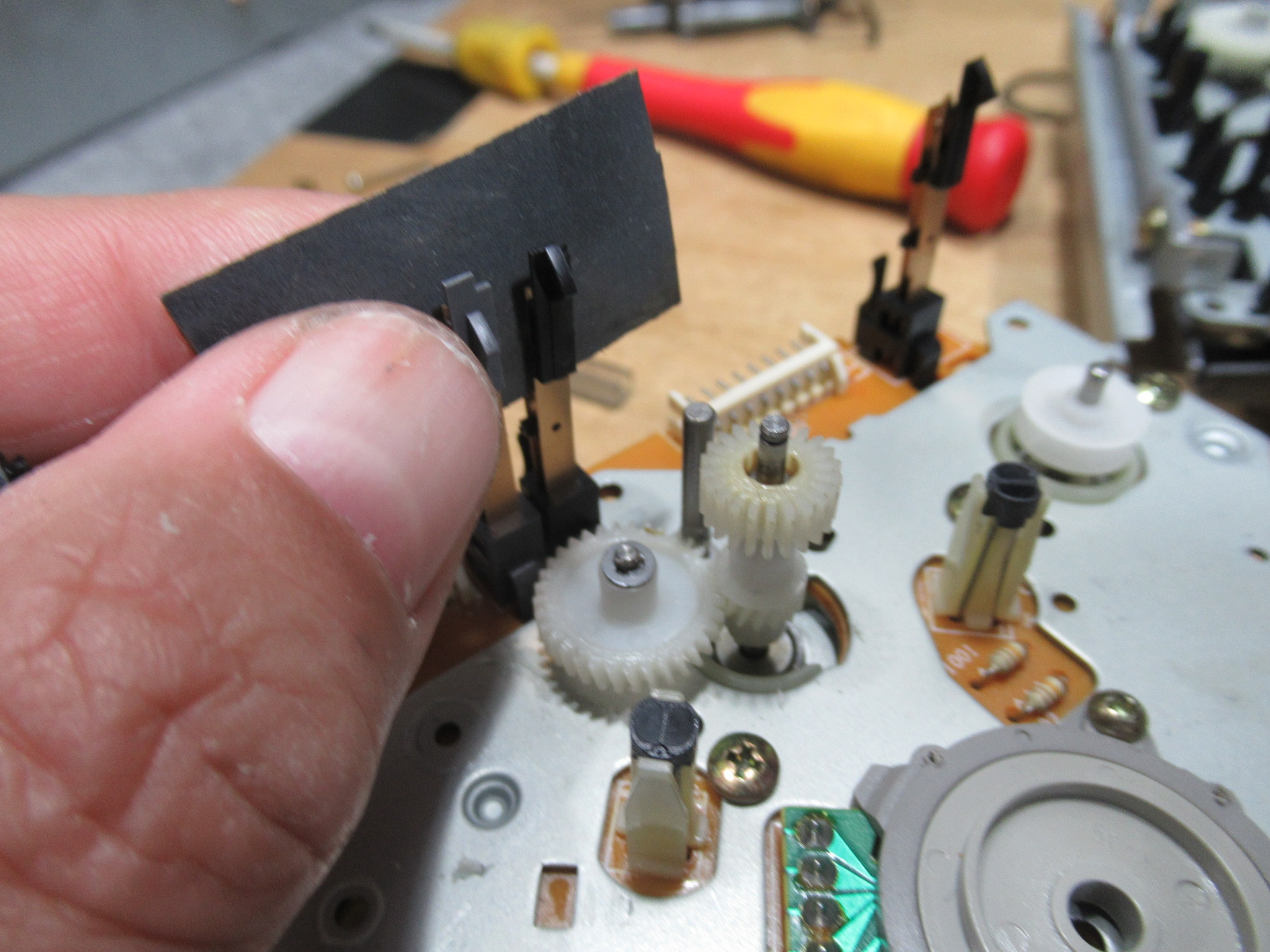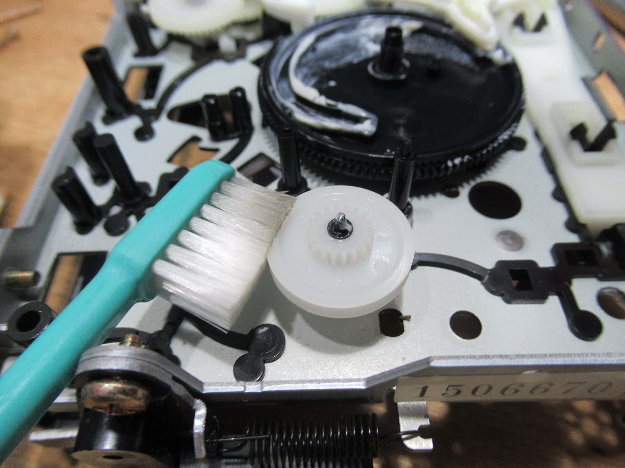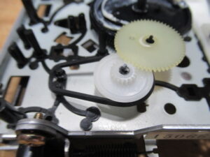 分解を進めます。黒色のアイドラーギヤは見たことがありませんので、過去に代替品と交換されたのでしょうか?