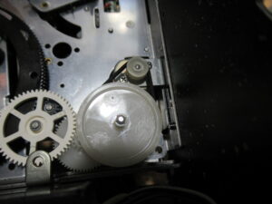 純正のスポンジ製ヘッドクリーナーは、回転ドラム表面を侵すことがありますので撤去します。すでに性状が変化してボロボロになっていました。