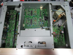 TEACの3ヘッドデュアルキャプスタンカセットデッキ、V-6030Sの修理依頼をいただきました。 電源を入れると、モーターの音が鳴り響きます。トレイ開閉にも不具合があるということでしたが、この段階では …