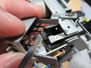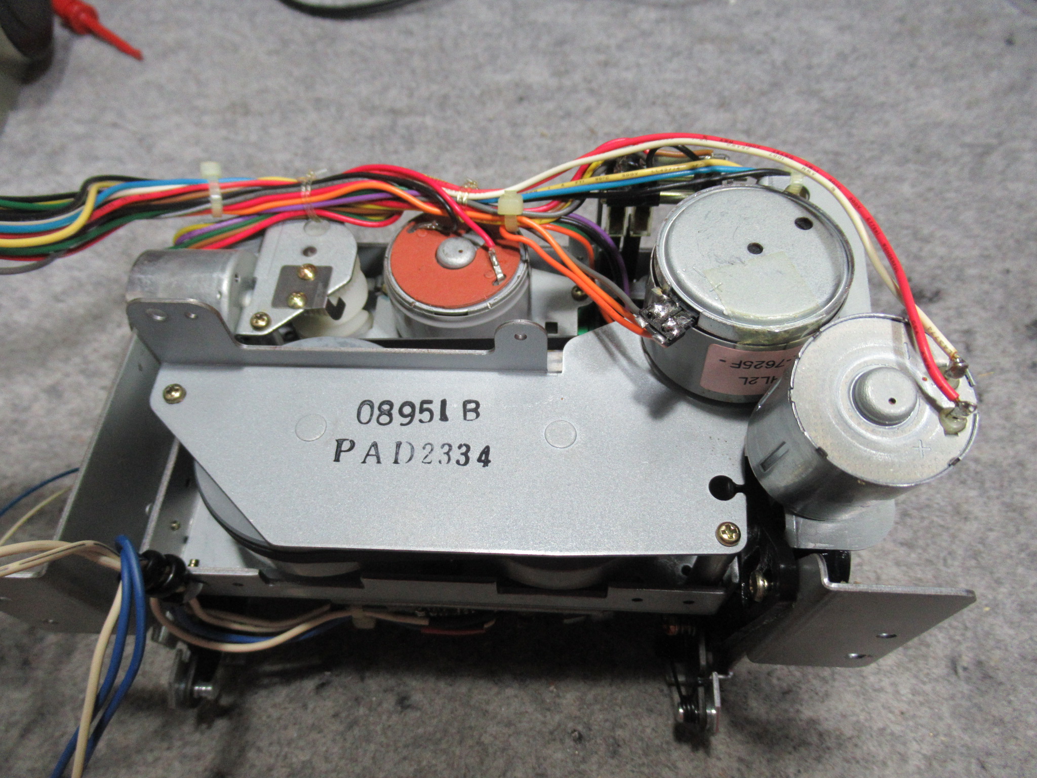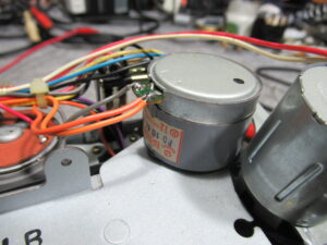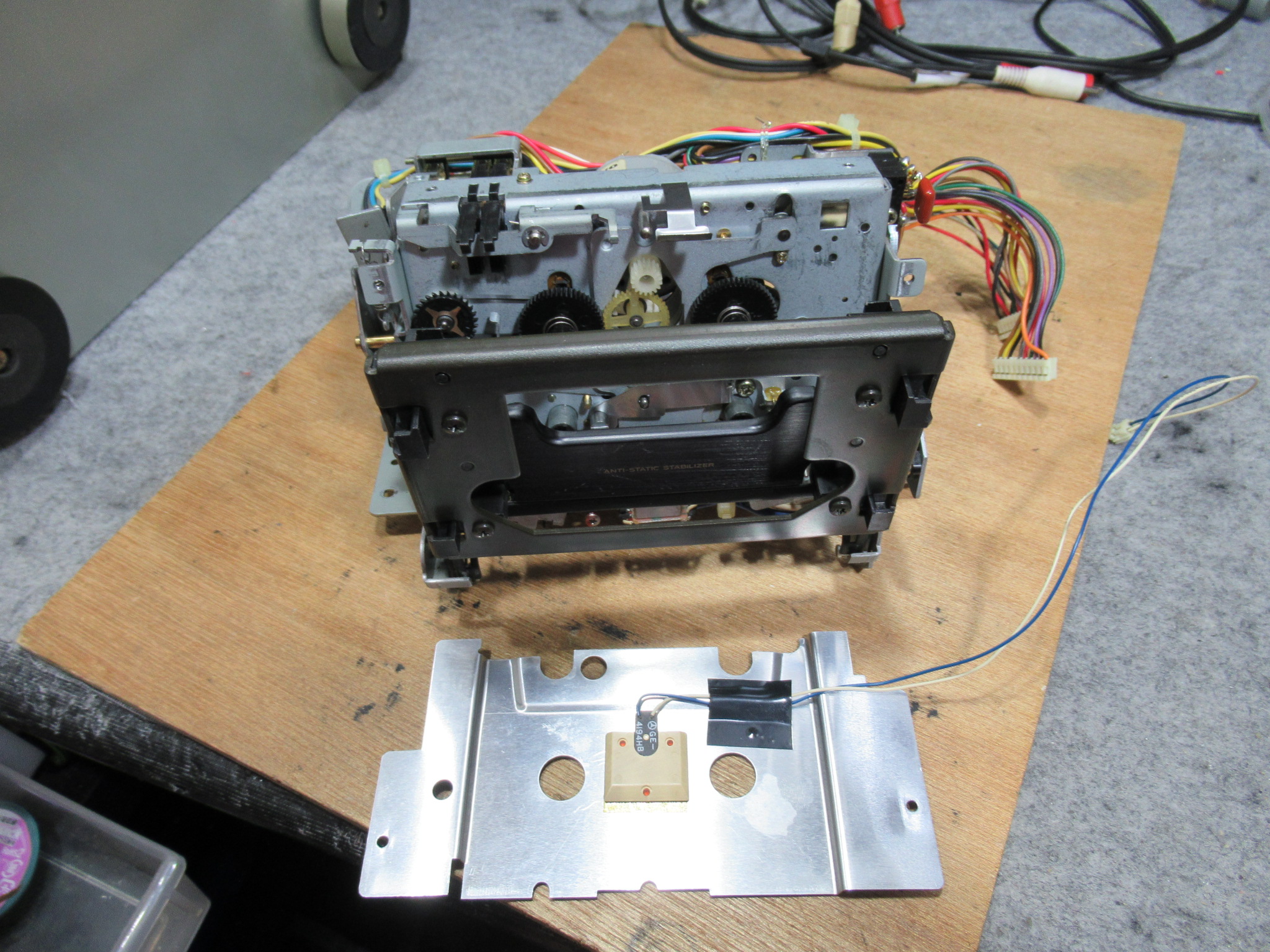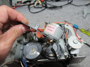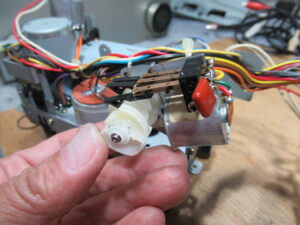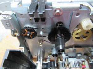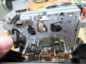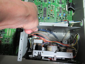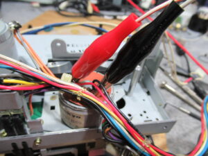 一旦メカを元に戻して動作確認を行いましたが、動作音が大きいのが気になりました。原因は、モーターが高速回転しているためでした。アンプに接続したところ、再生音は出力されますが、超早回しです。