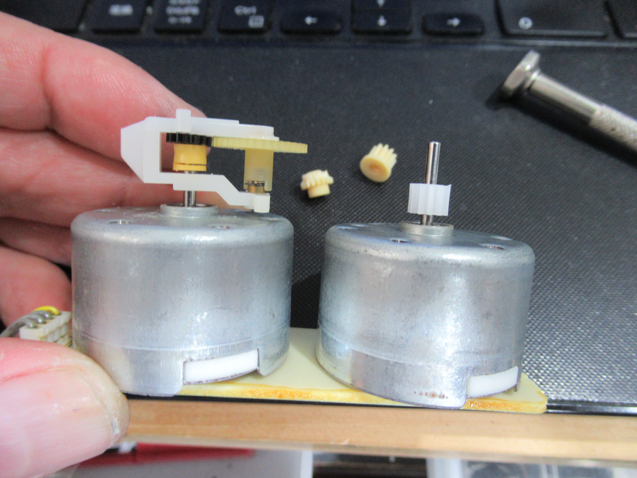 モーターユニットを取り外して破損しているピニオンギヤを代替品と交換します。もう片方も併せて交換します。
