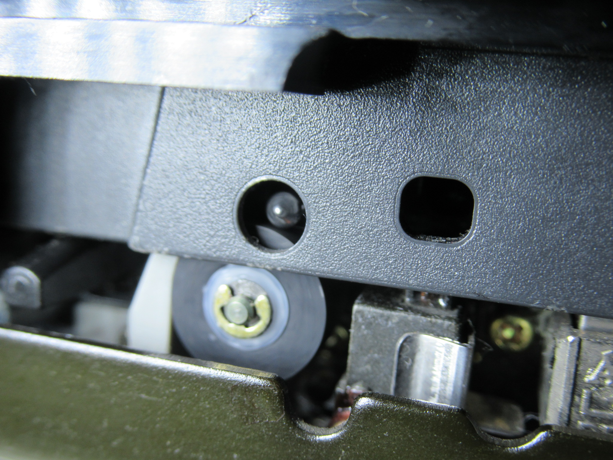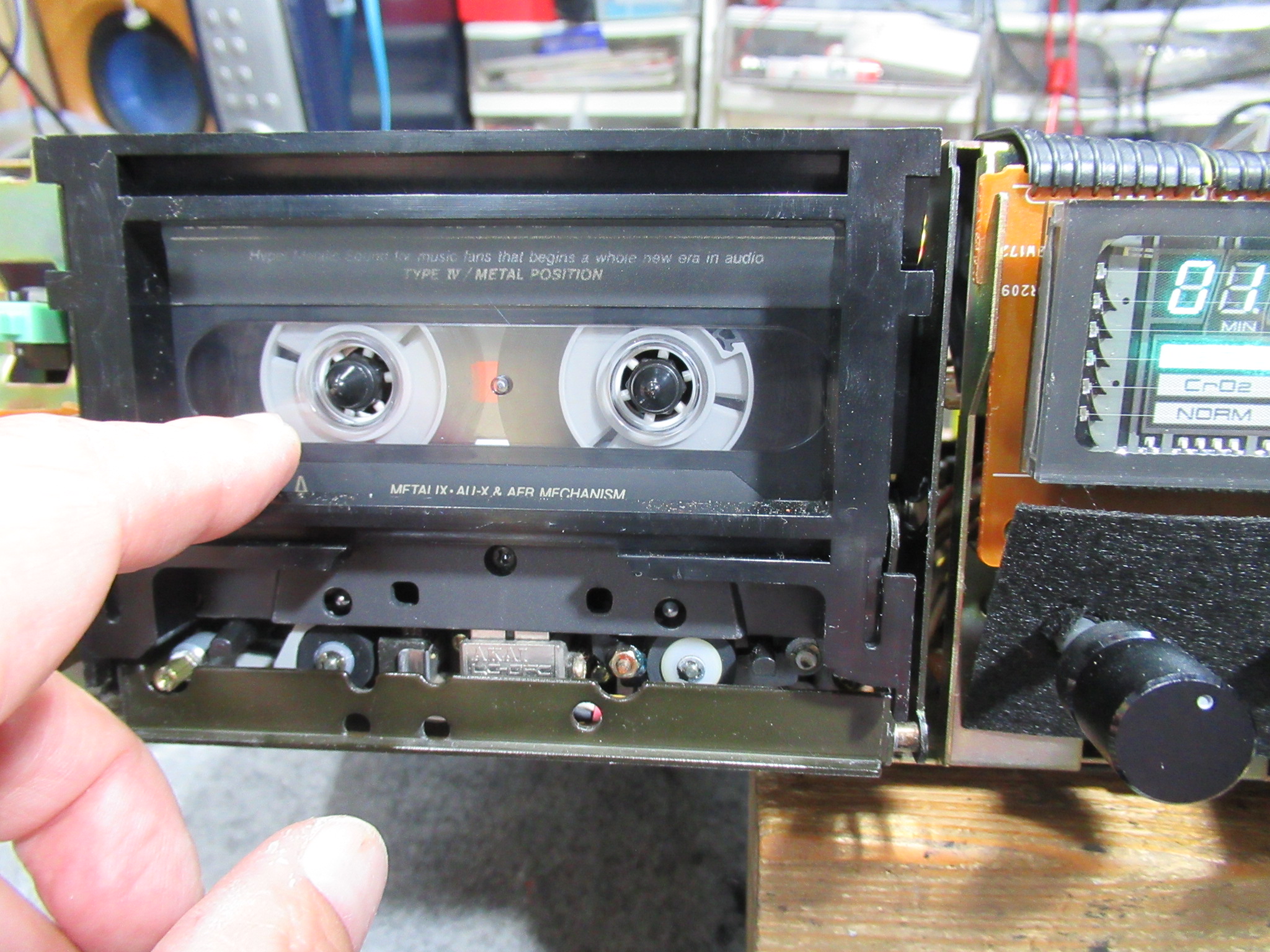 ホルダーが閉まっているときに、テープを軽く押し付けると、わずかに奥に移動します。これまでも何度か同じ状態のもの見たことがありますが、ホルダーがガタついて、カセットが不安定な状態になっているということです。常時この状態であれば気がつきやすいのですが、テープによっては完全に閉まることもありましたので、原因に気付くのが遅れました。摩耗や変形が原因と考えられますので、本来は部品交換が望ましいところですが、現在ではそれは叶いませんので、企業秘密の処置を施します。