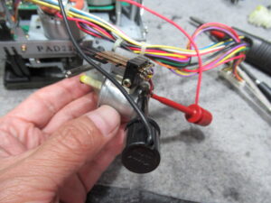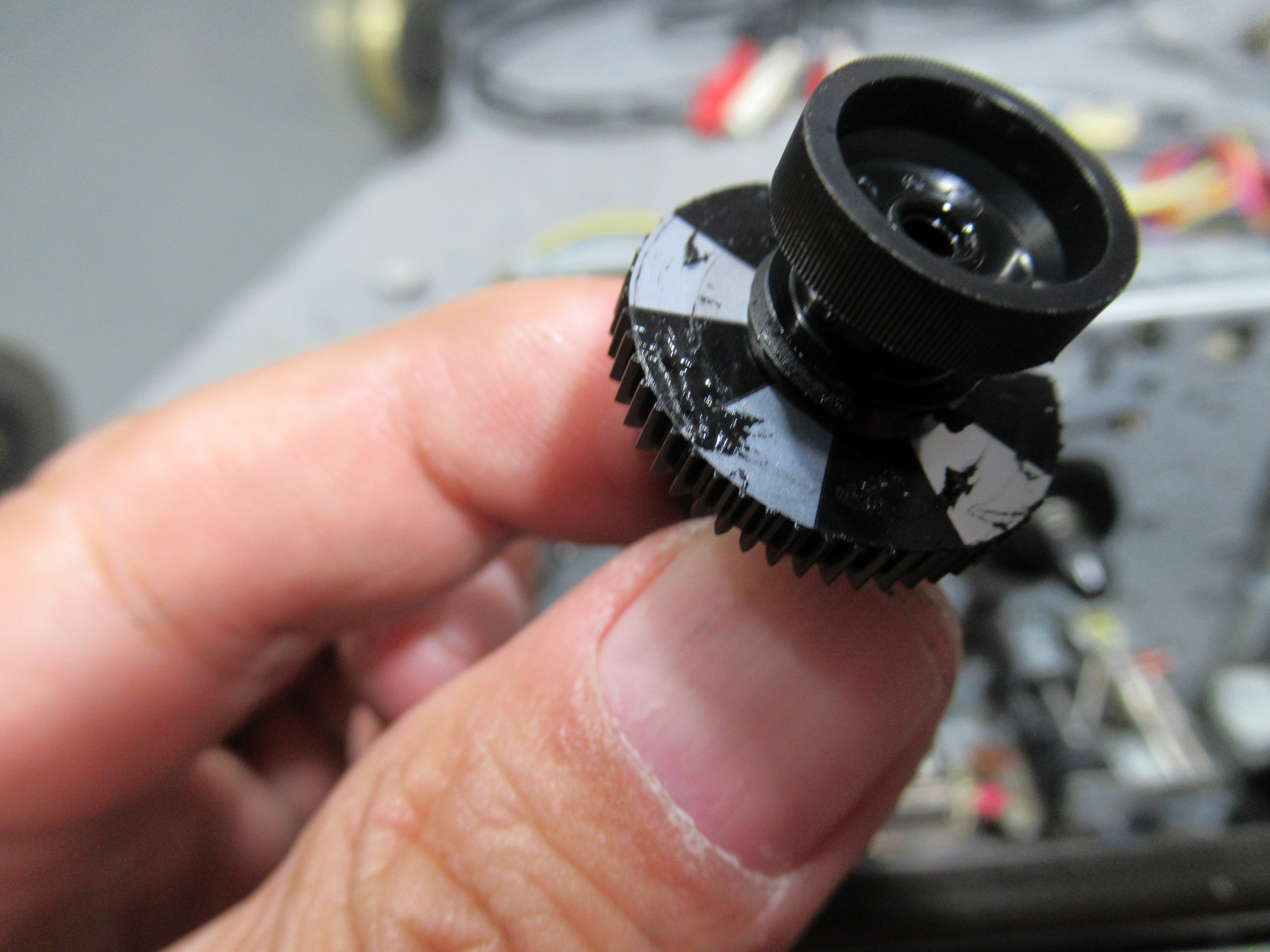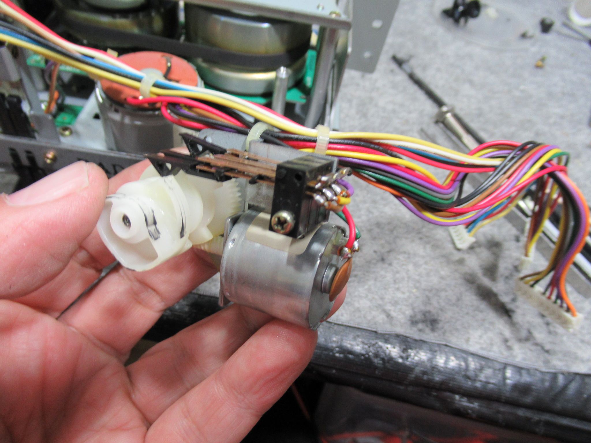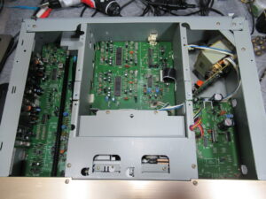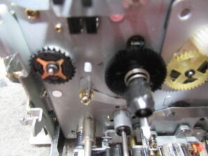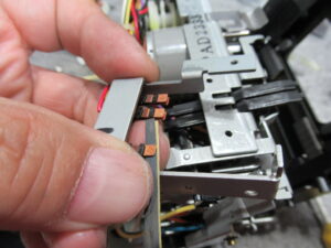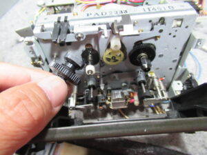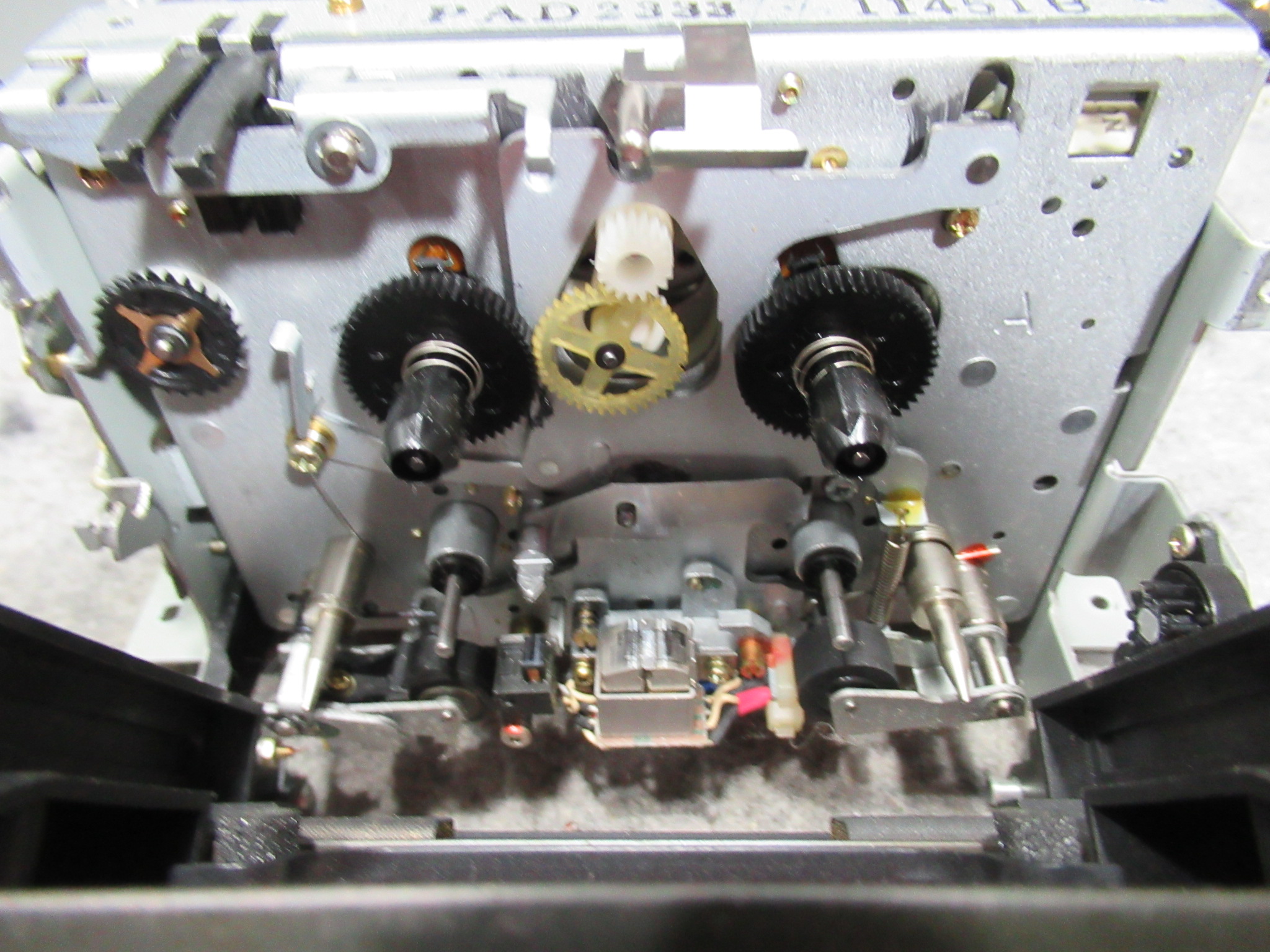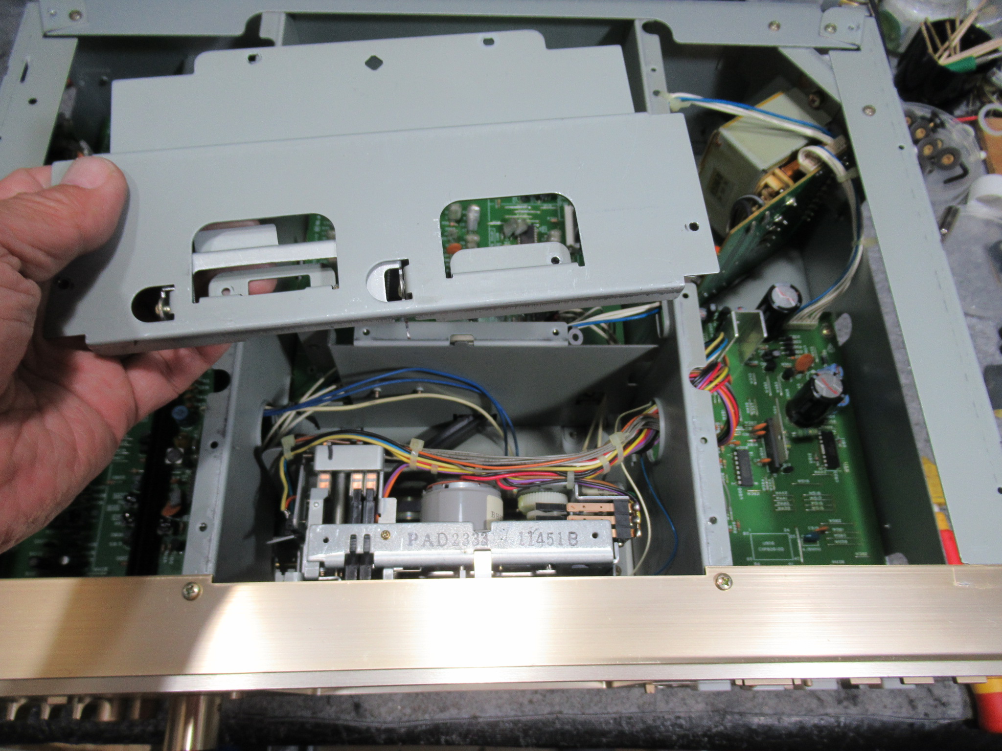 カバーを開けます。メカ上部のプレートを取り外します。このプレートは、アース兼、トレイが開くときにオートセレクタ用スイッチを持ち上げる役割を担っています。