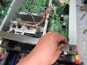 フロントの化粧パネルを取り外し、フロントパネルを少し前方に引き出すとメカを取り出しやすくなります。