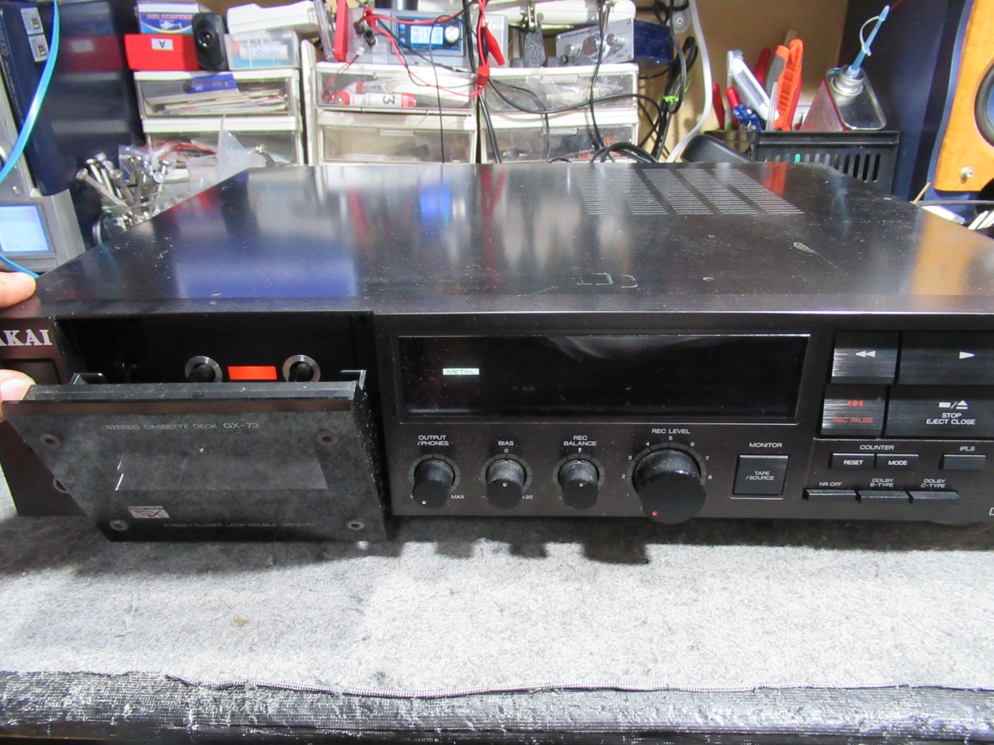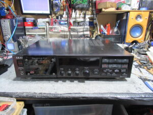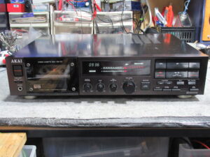 AKAI製3ヘッドデュアルキャプスタンカセットデッキ、GX-73の修理依頼をいただきました。 故障の状況ですが、「EJECT CLOSEボタンを押してもカセットホルダーが途中までしか閉まらない」「テー …