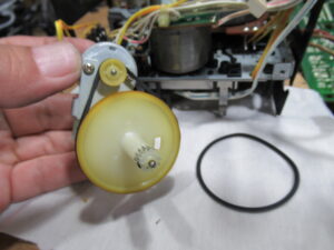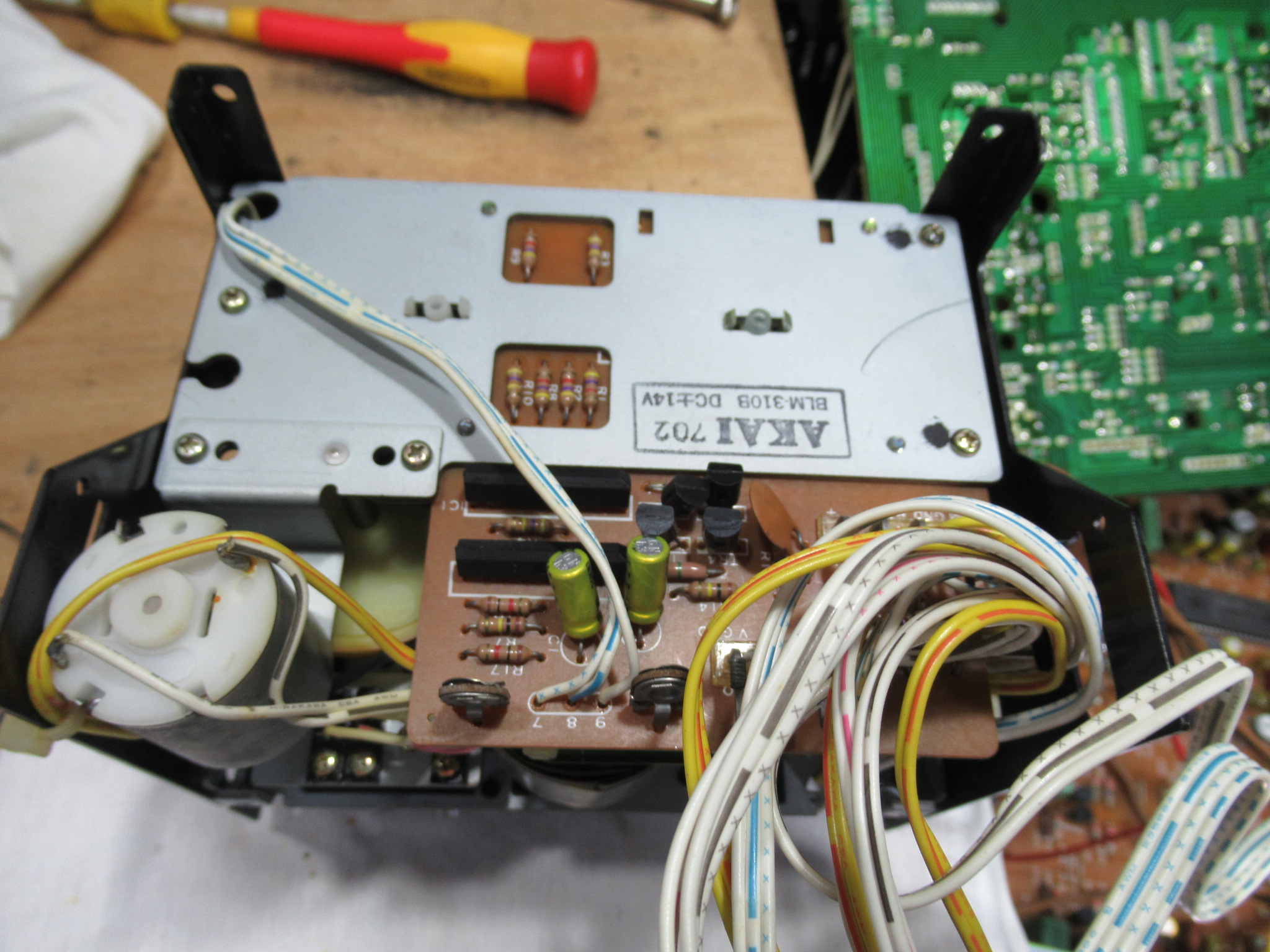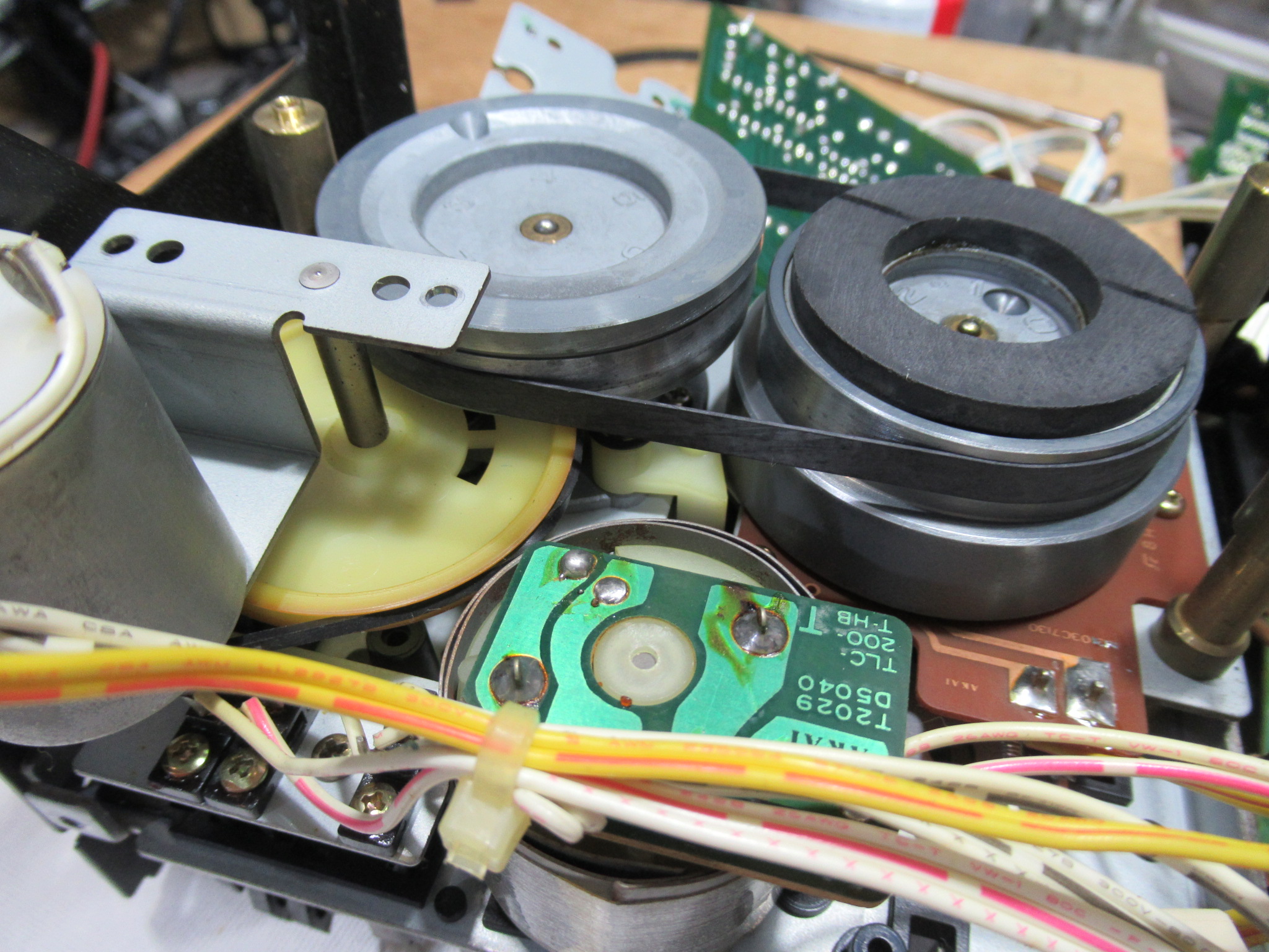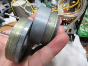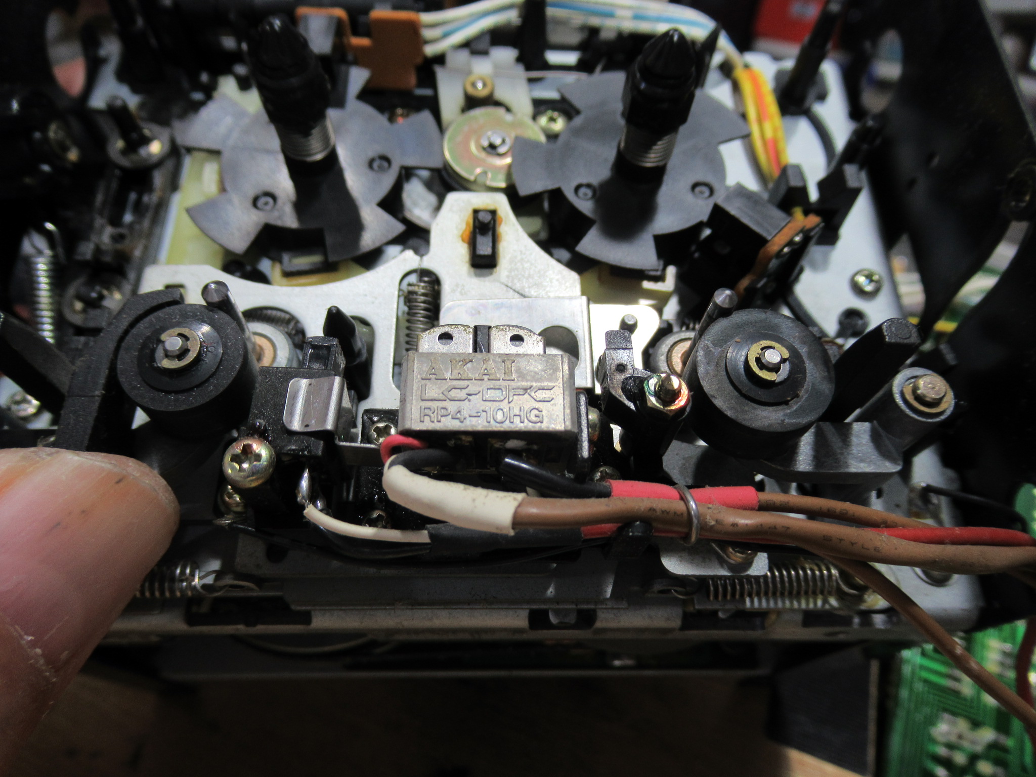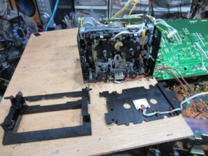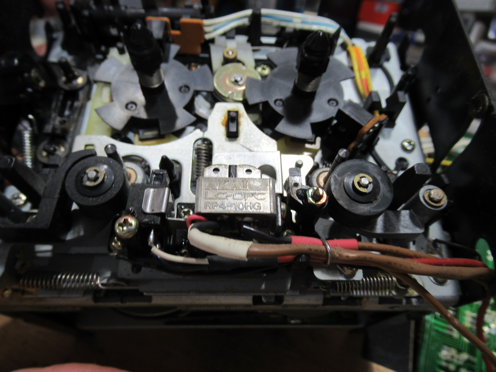 AKAI製3ヘッドデュアルキャプスタンカセットデッキ、GX-73の修理依頼をいただきました。 不動ということです。 電源を入れると、カムモーターが「ギーーーーー」と延々と鳴り続けます。トレイは開きませ …