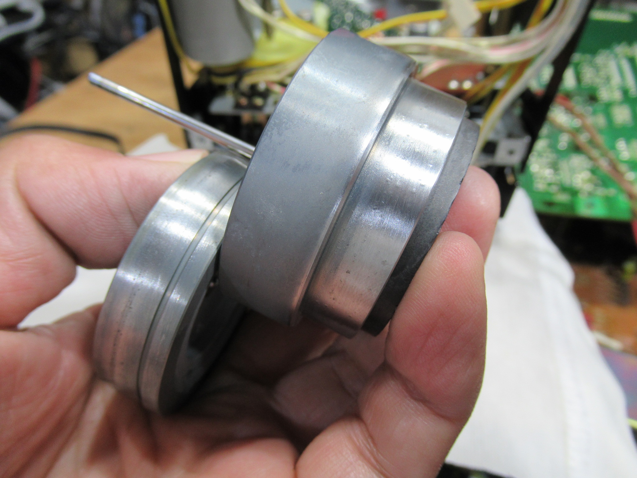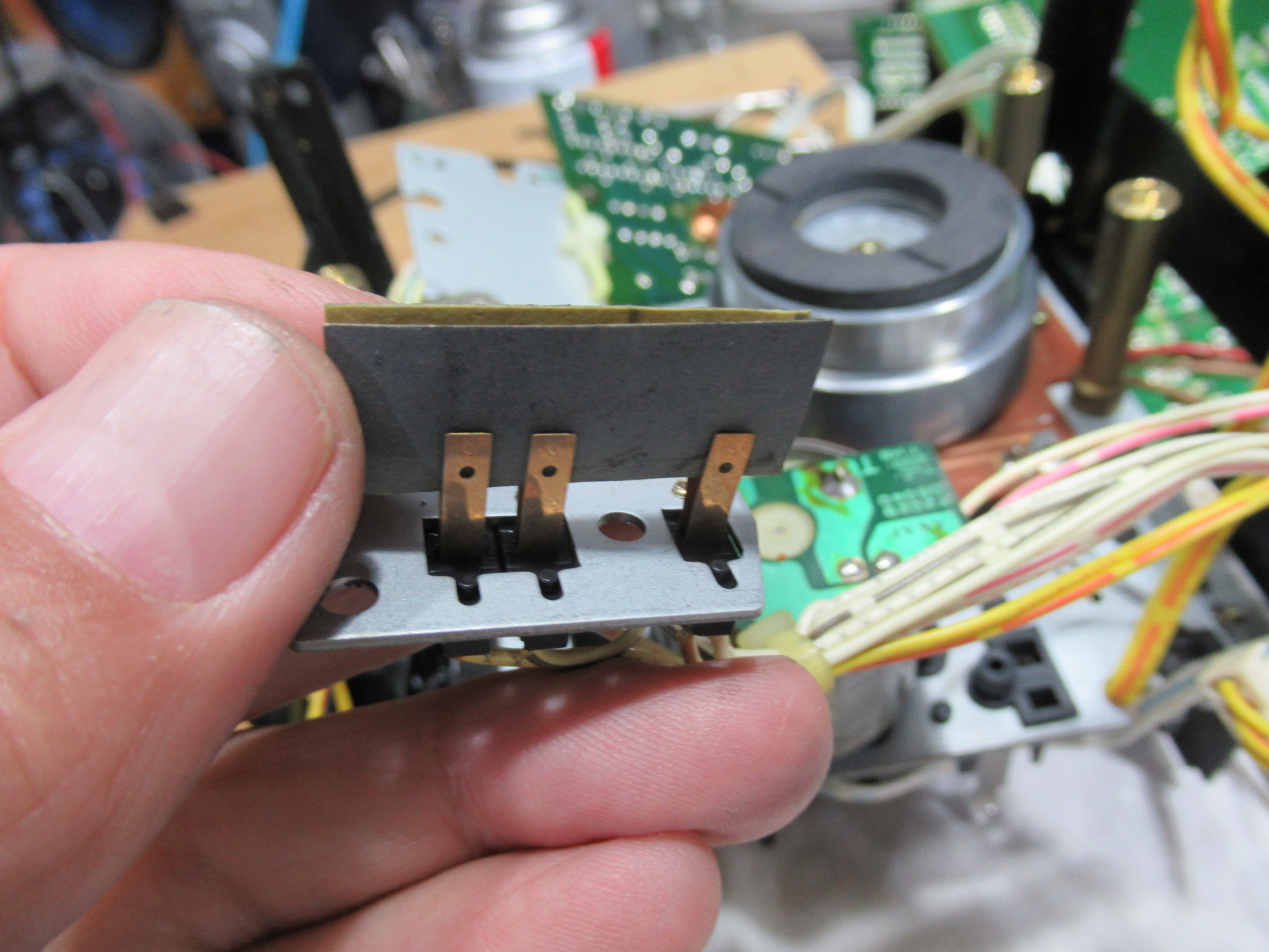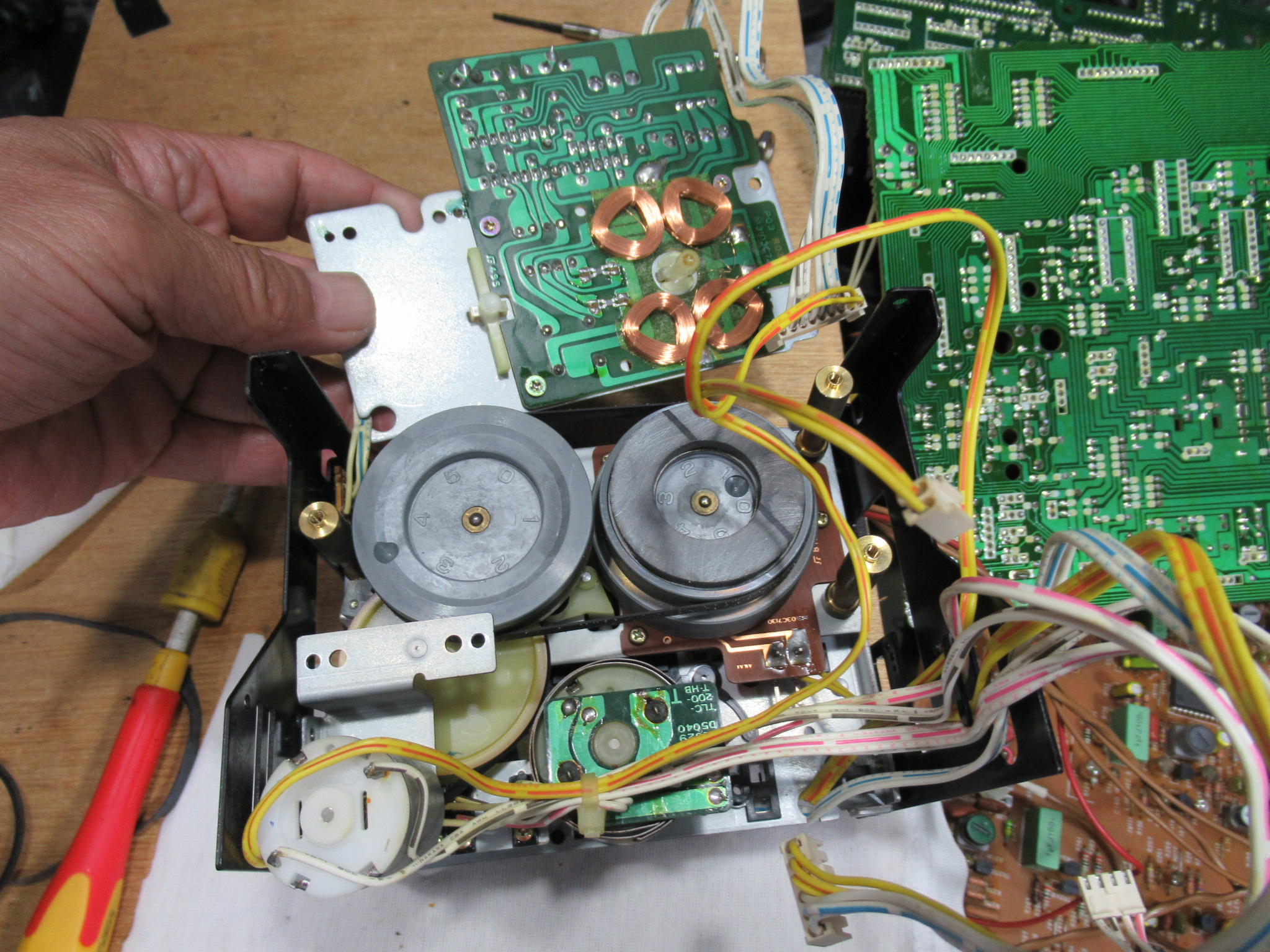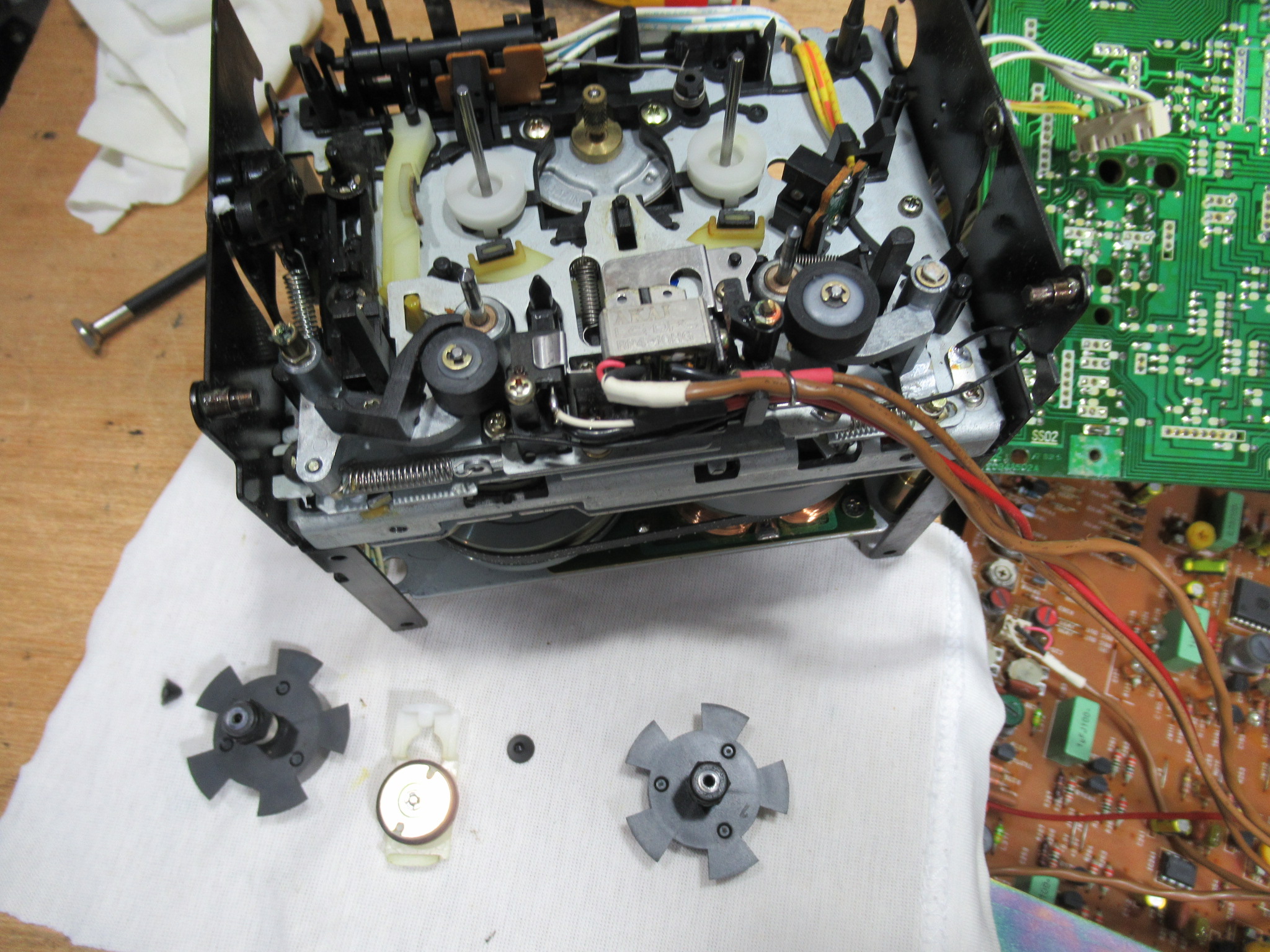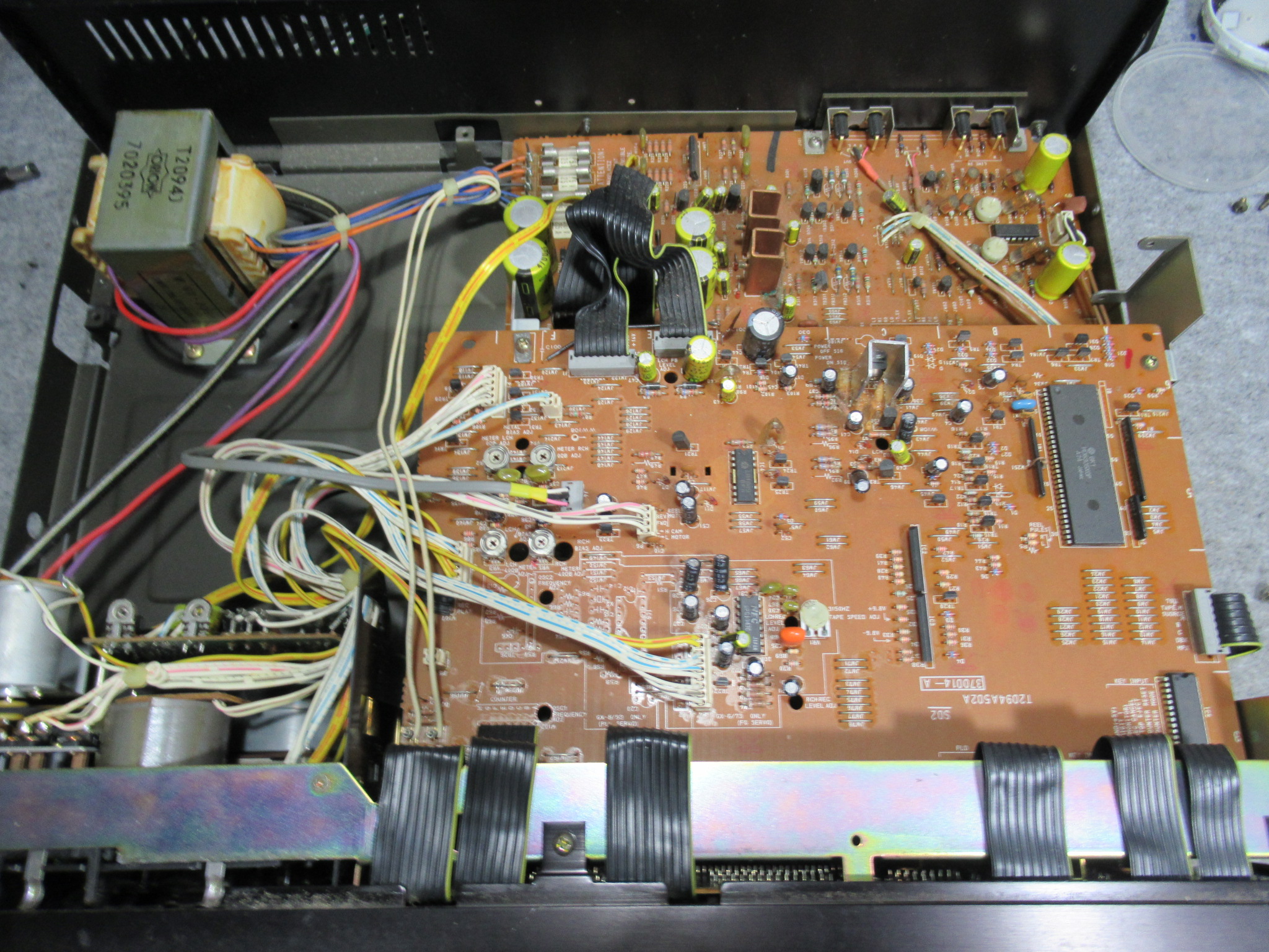 AKAI製3ヘッドデュアルキャプスタンカセットデッキ、GX-73の修理依頼をいただきました。 不動ということです。 電源を入れると、カムモーターが「ギーーーーー」と延々と鳴り続けます。トレイは開きませ …