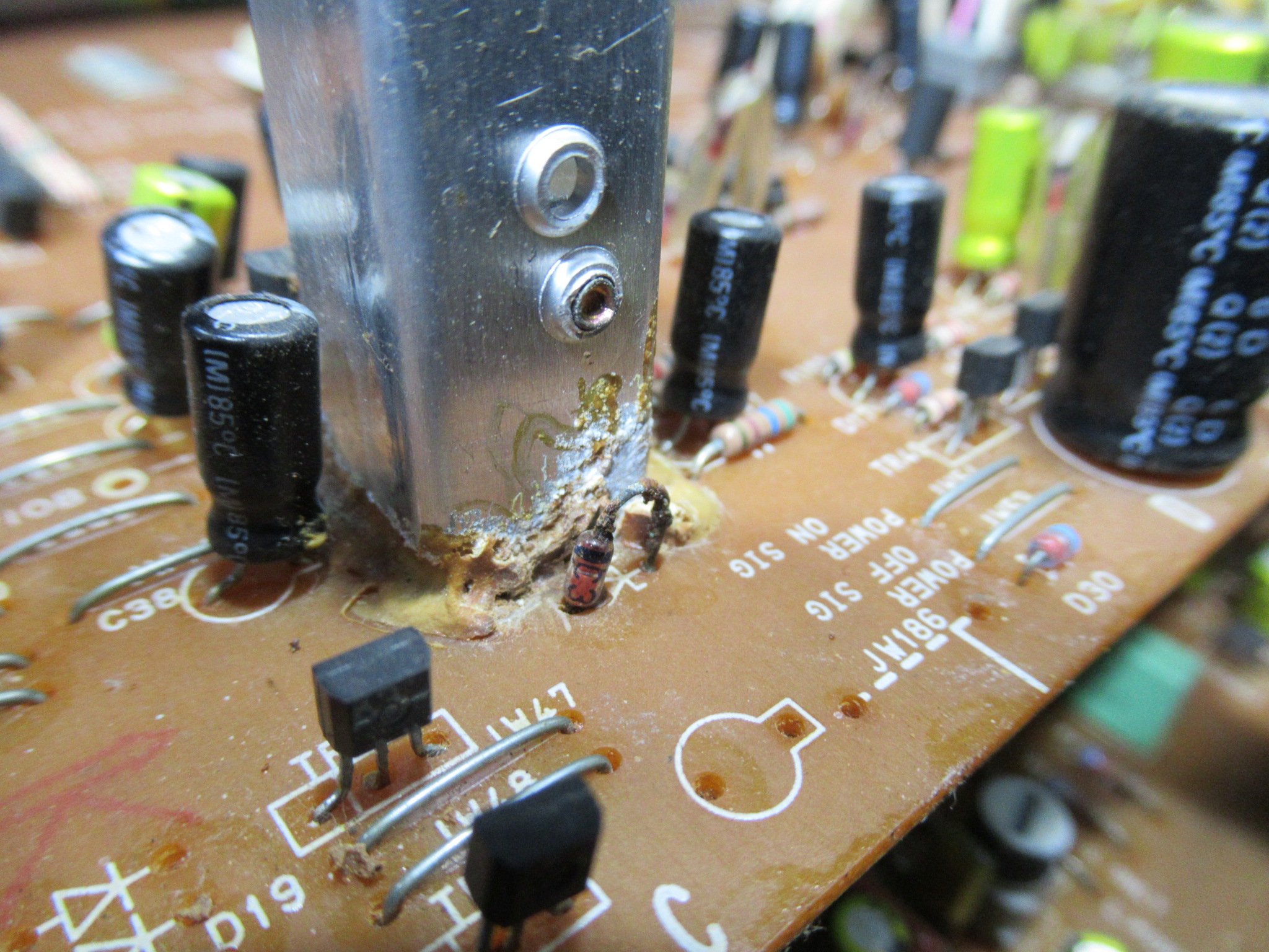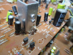 少し前に修理したGX-93と同じく、電源ラインのトランジスタ放熱板を固定している接着剤が、すぐ後ろのダイオードにまで塗られていました。