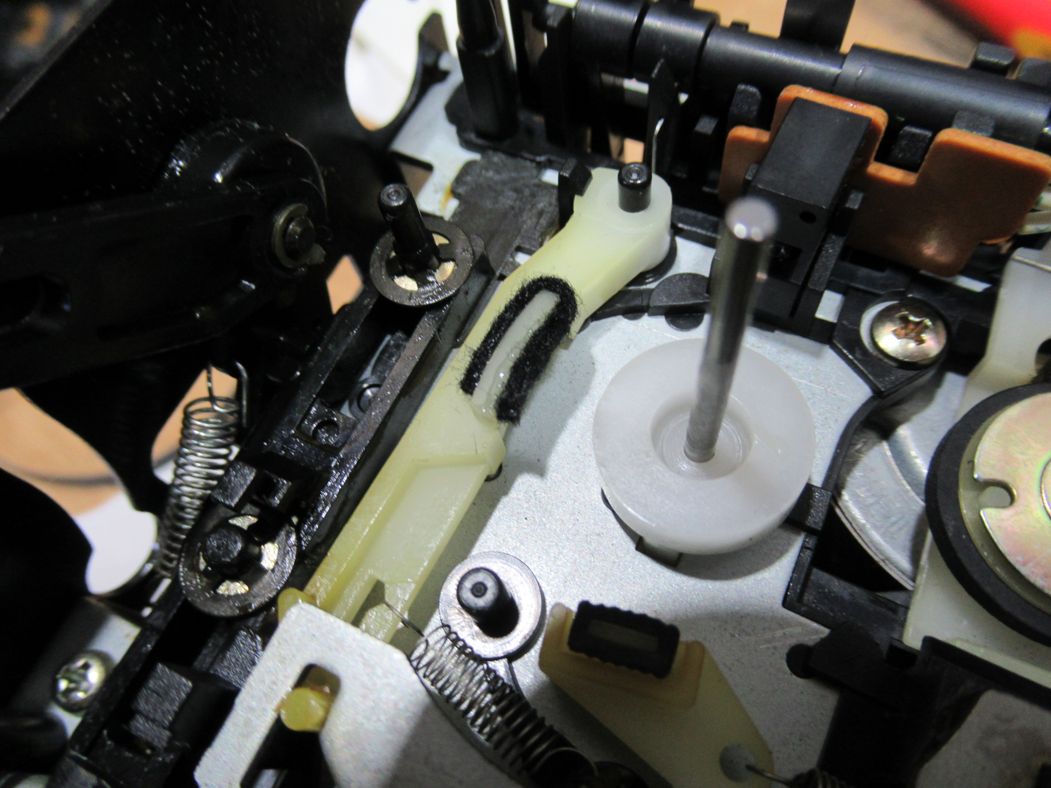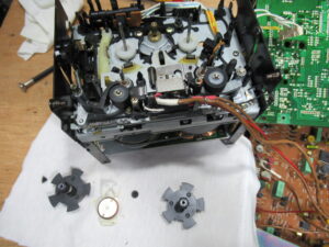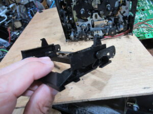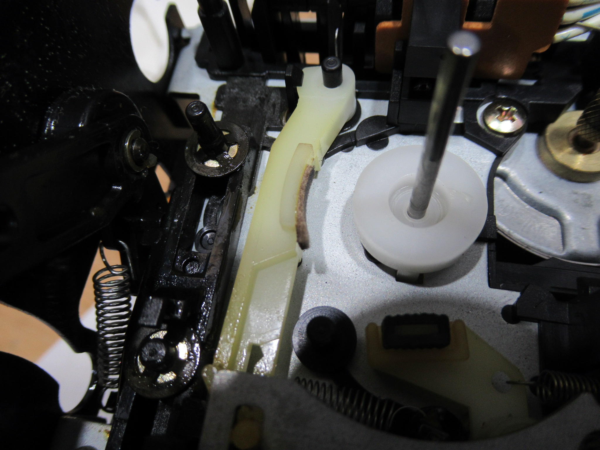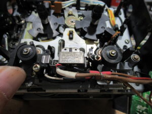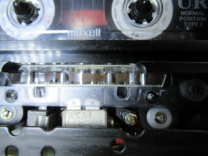 カセットホルダー両脇にはテープを押さえるためのバネが内蔵されていますが、長年の使用により圧縮変形しています。