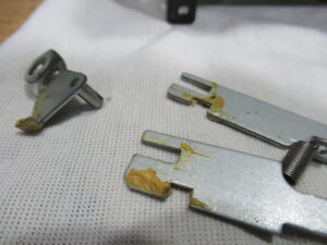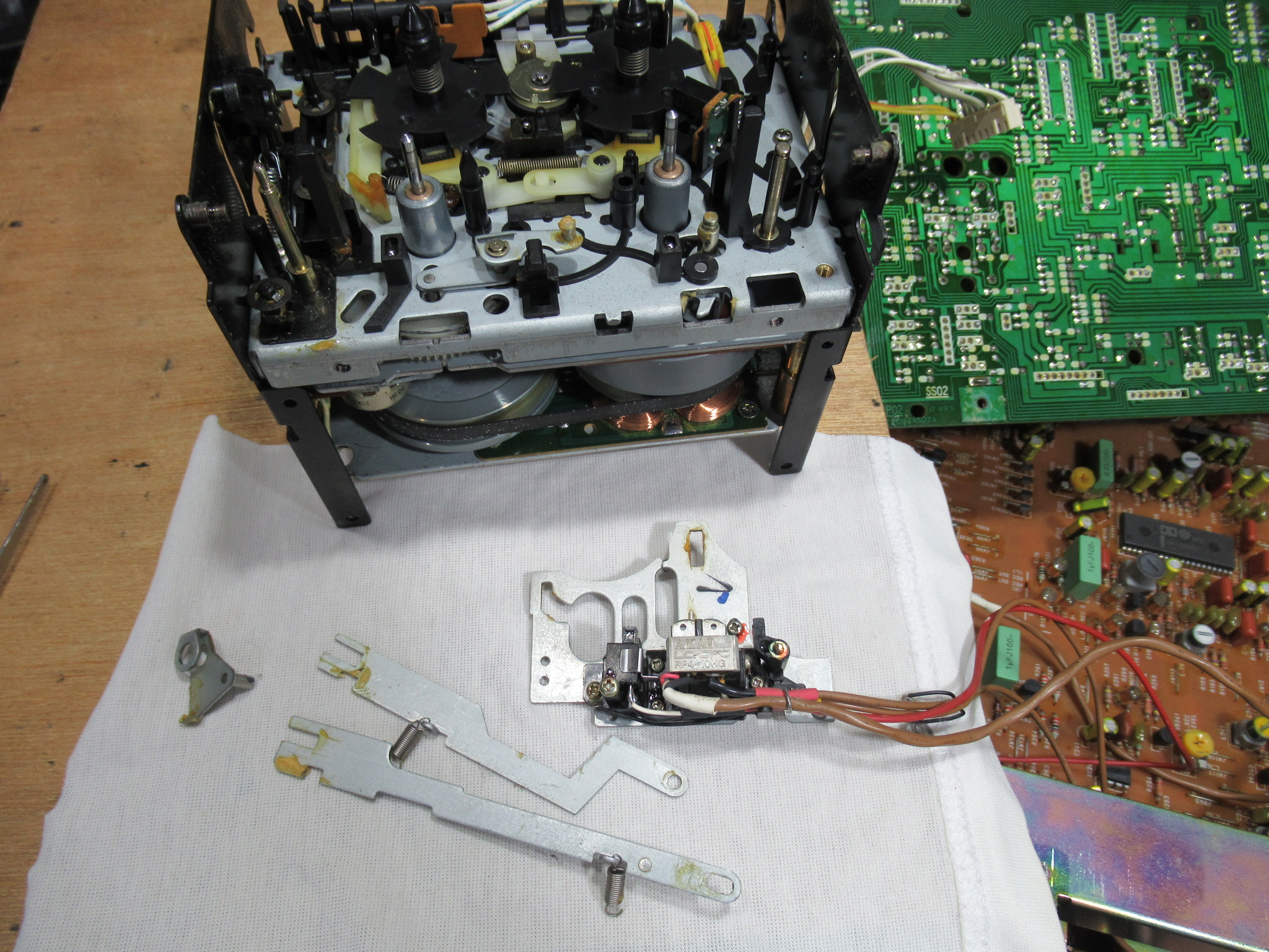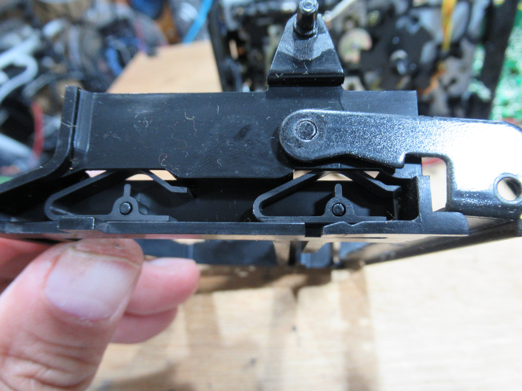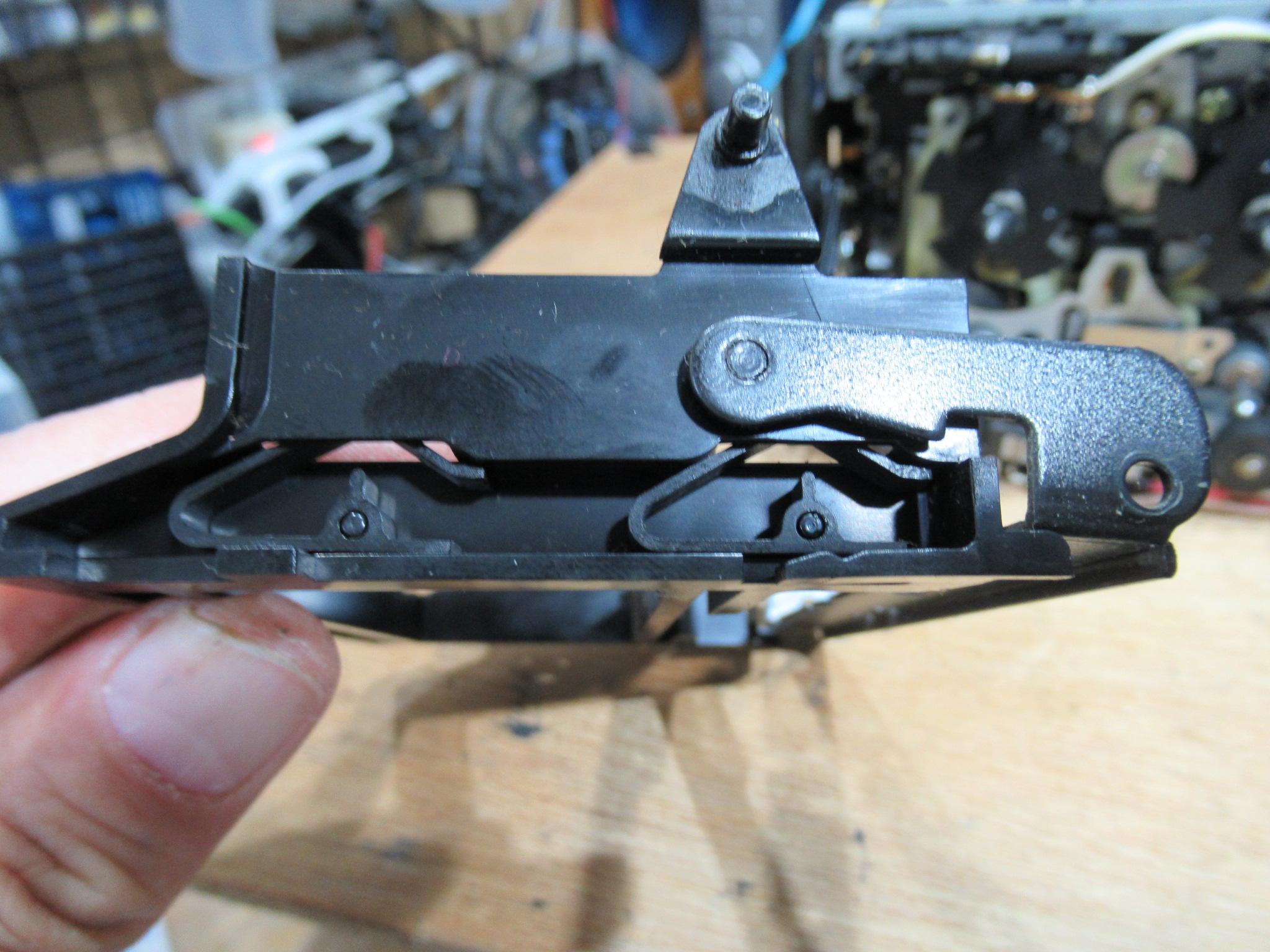 カセットホルダー両脇にはテープを押さえるためのバネが内蔵されていますが、長年の使用により圧縮変形しています。