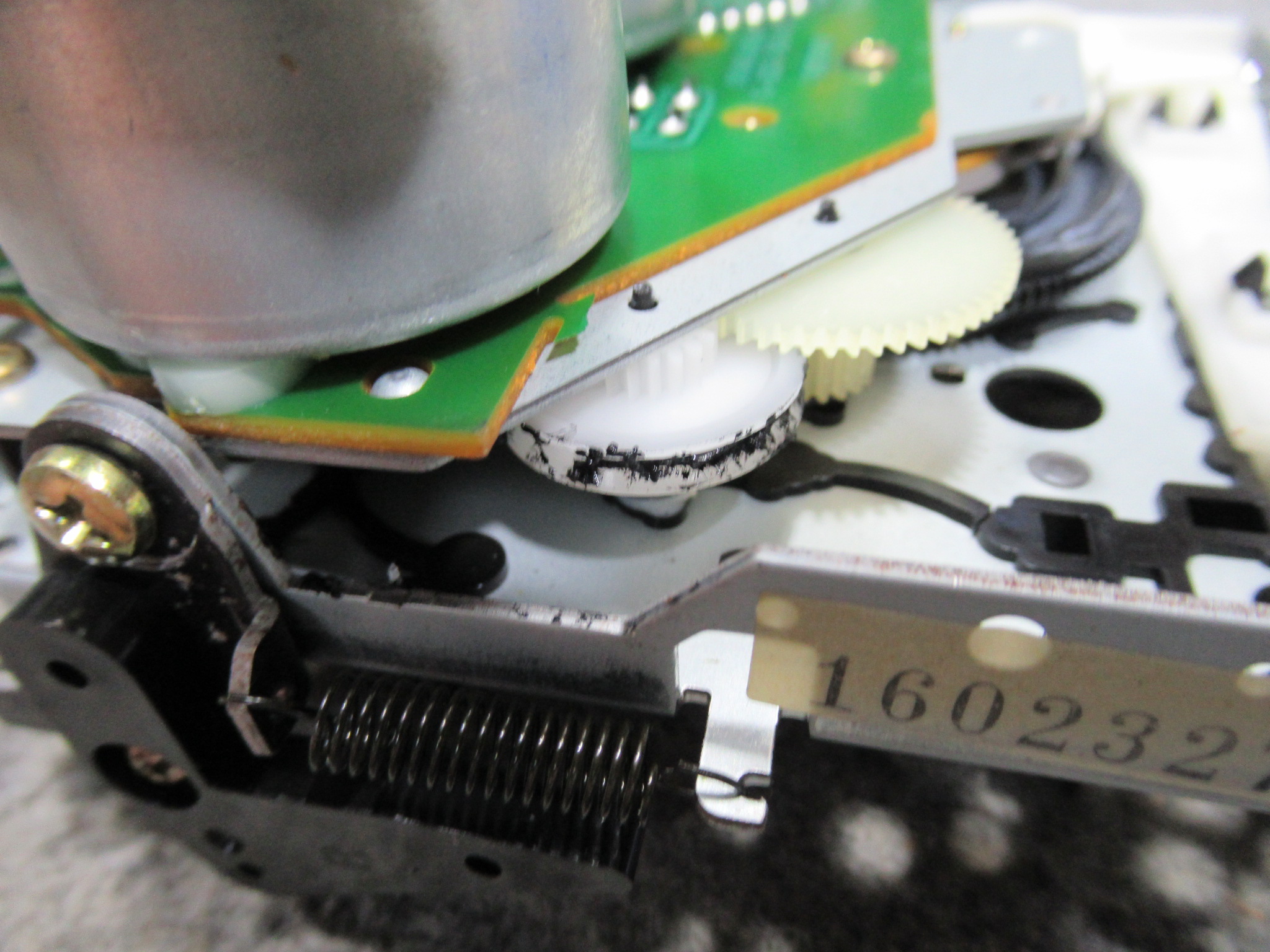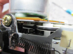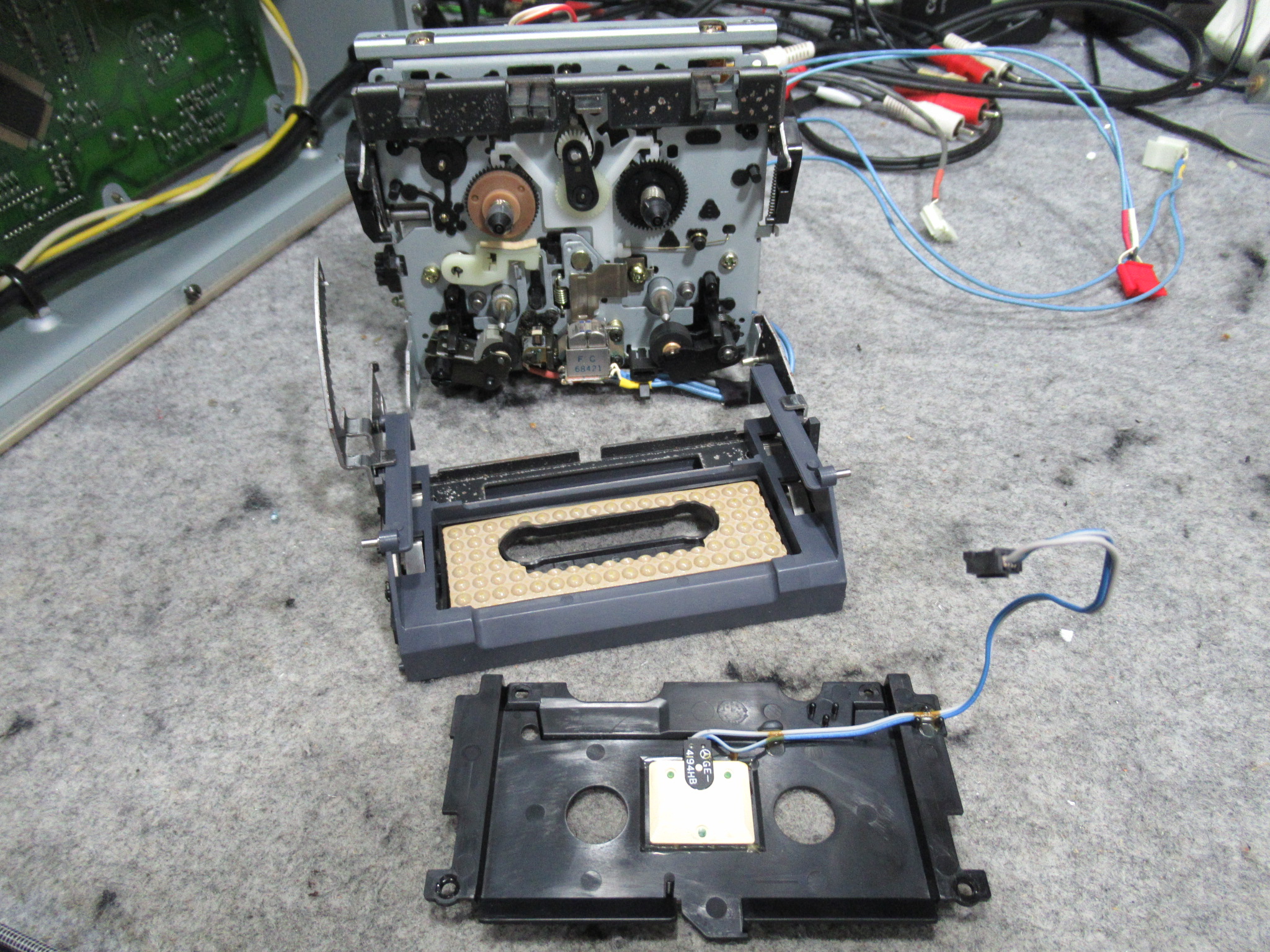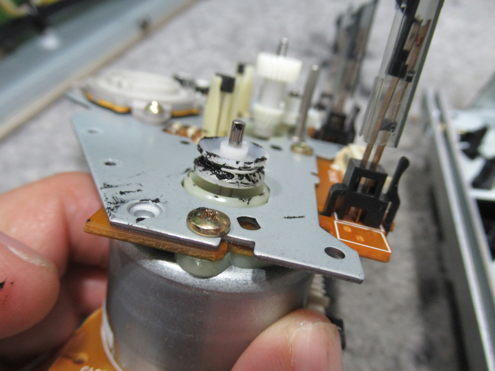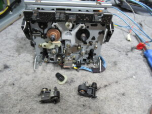 メカを降ろしてフロント部分から分解していきます。左側のピンチローラーは調整式になっていますので、取り外す前に位置を測定しておき、組み付け時に同じ位置に取り付けます。