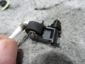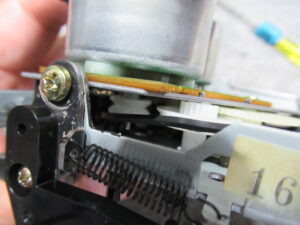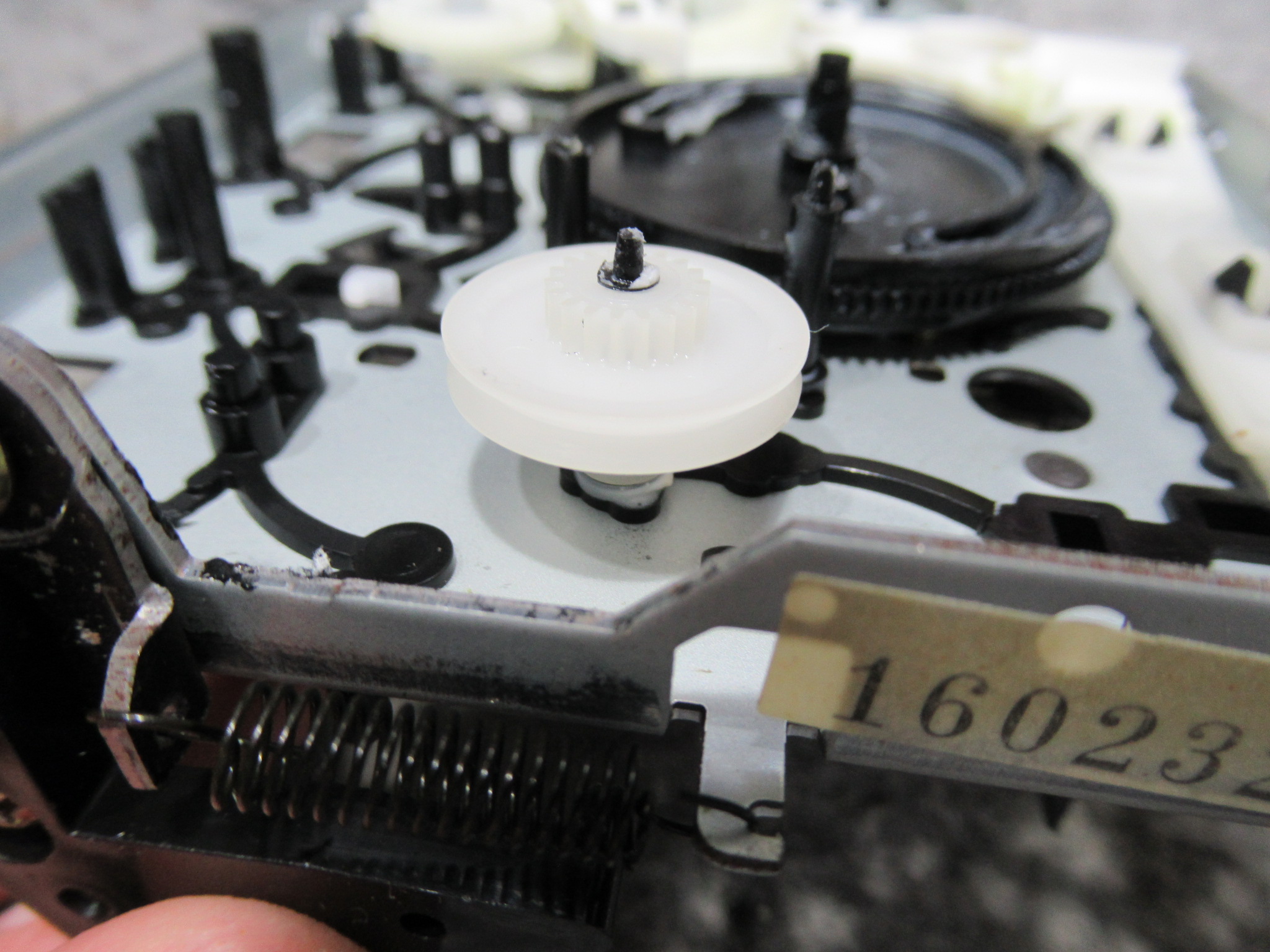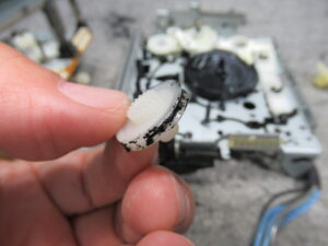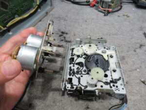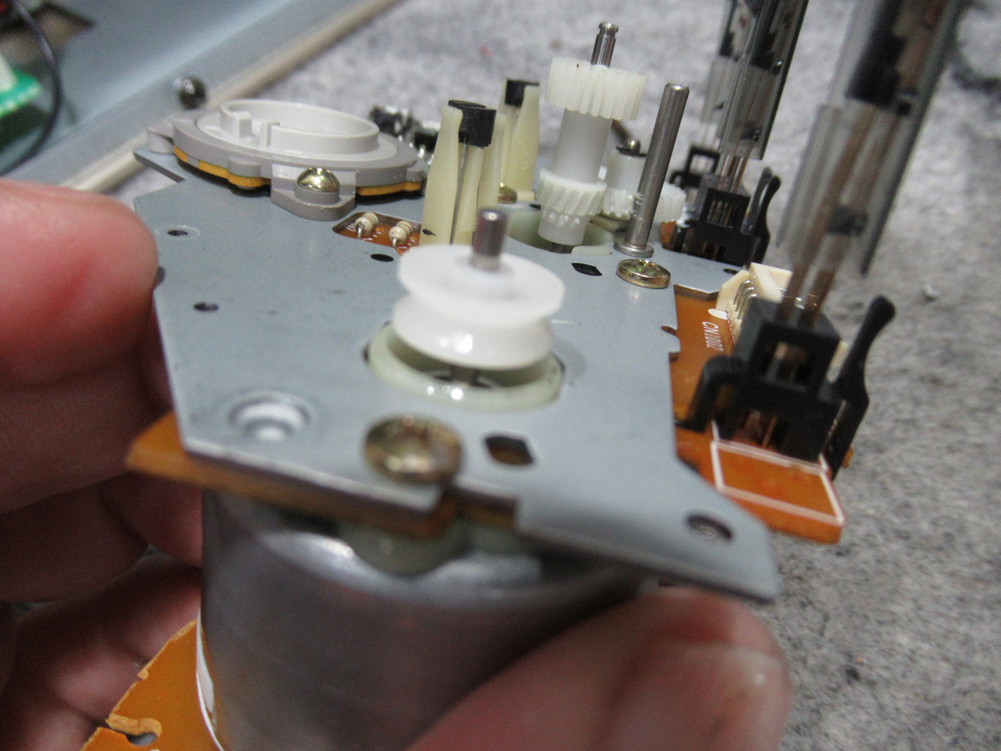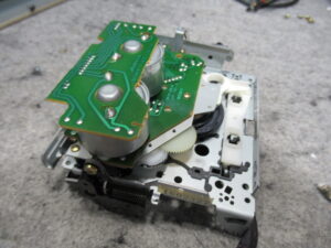 メカを降ろしてフロント部分から分解していきます。左側のピンチローラーは調整式になっていますので、取り外す前に位置を測定しておき、組み付け時に同じ位置に取り付けます。