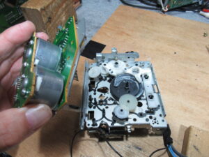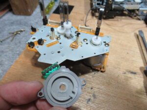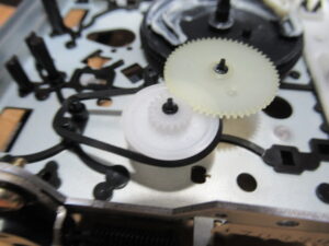 基板面の電解コンデンサーを交換し、新しいベルトを掛けて組み立てます。